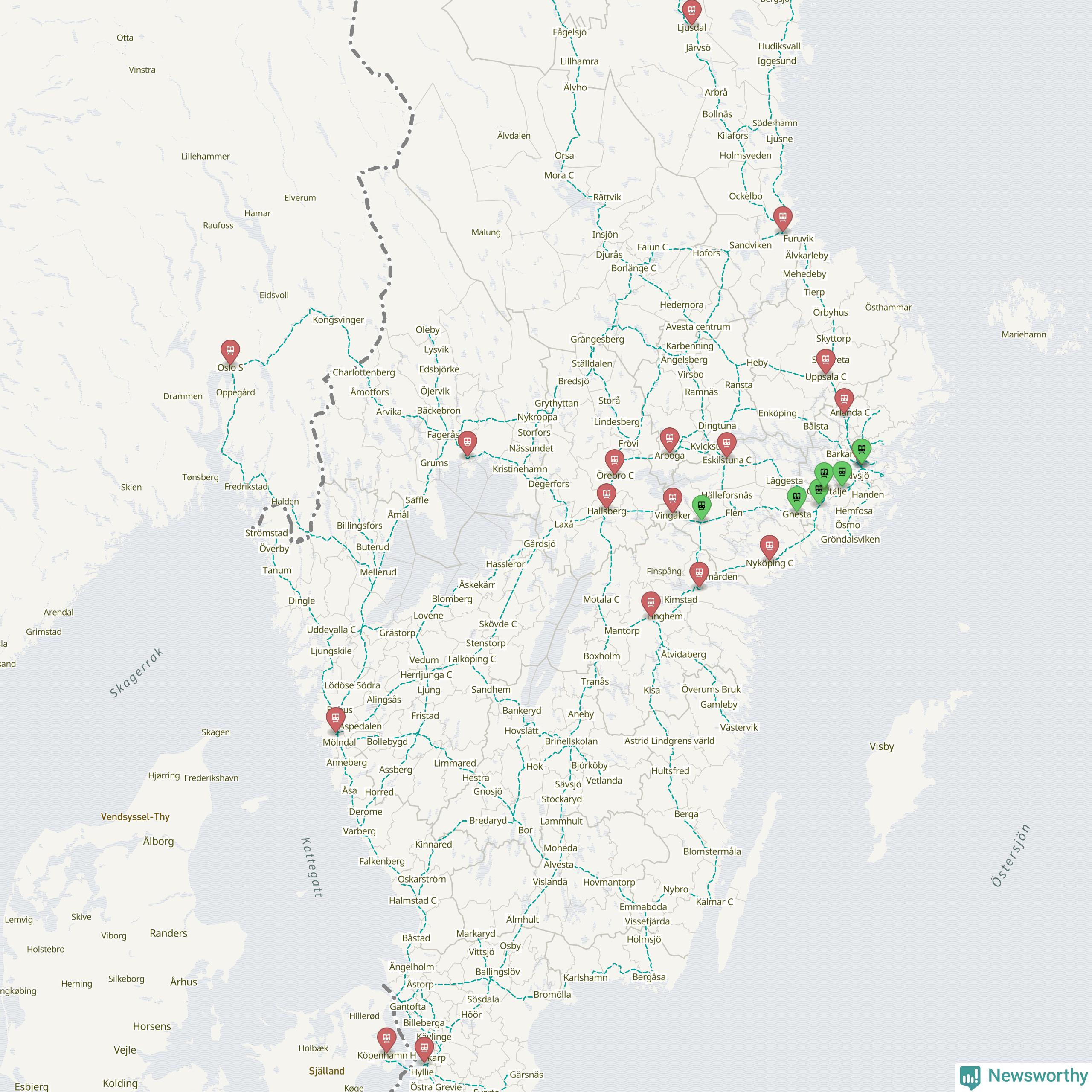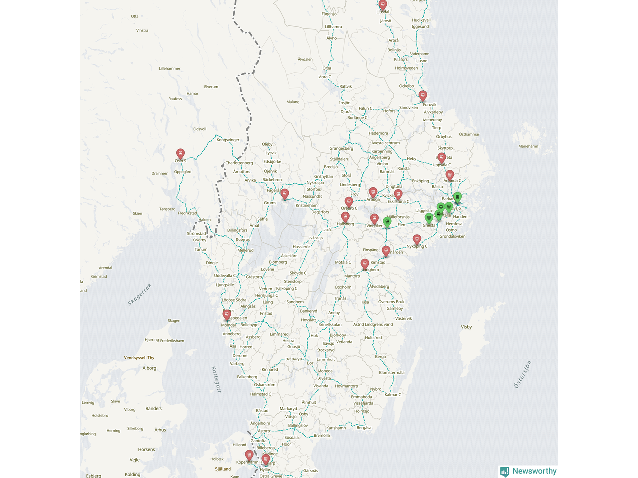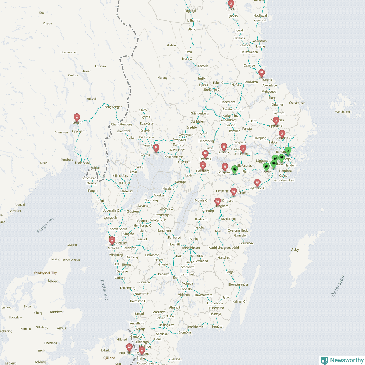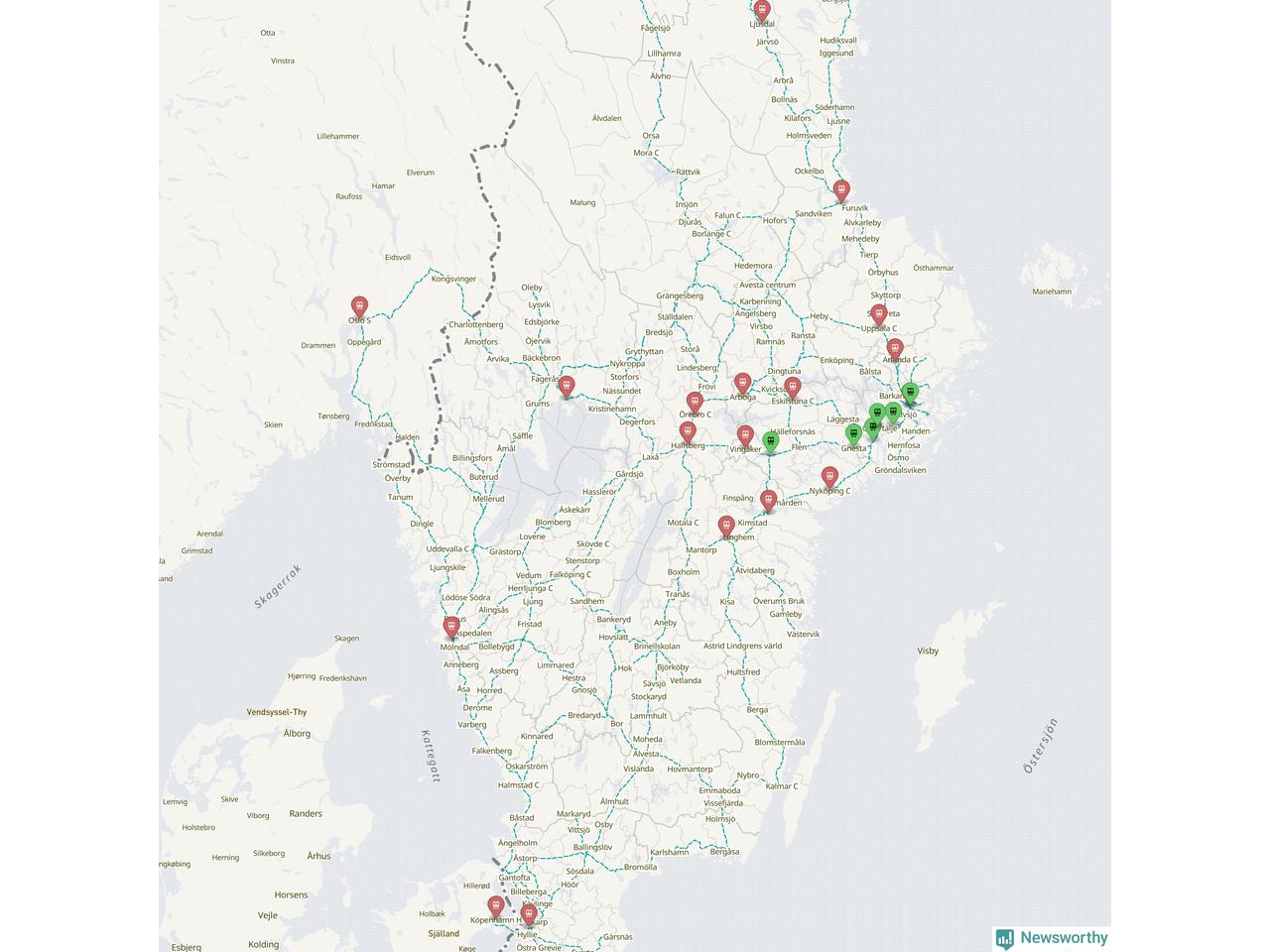 Kartdata från Mapbox, Newsworthy, OpenStreetMap och Trafikverket. Uppgifter om sträckor med passagerartrafik från jarnvag.net.