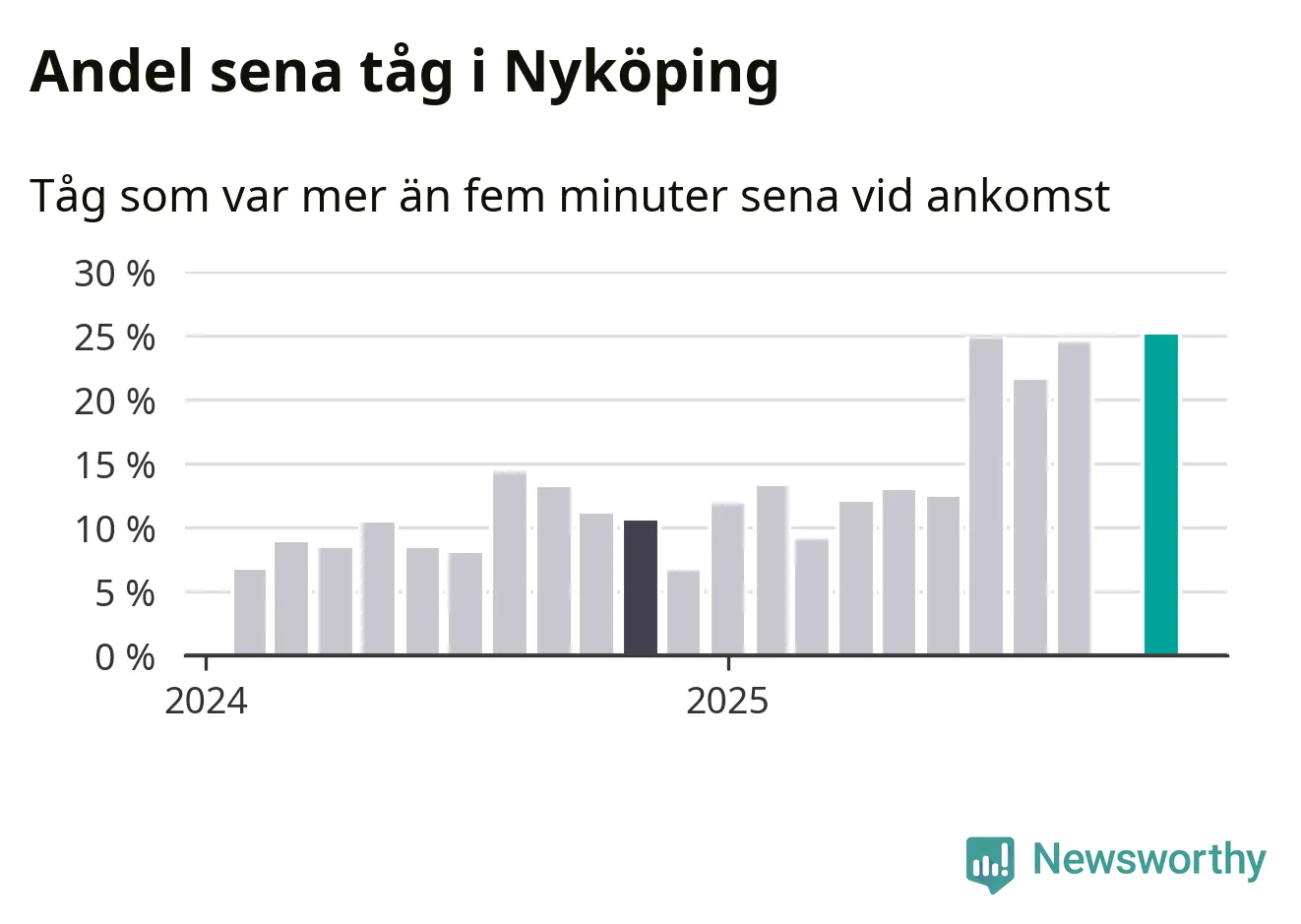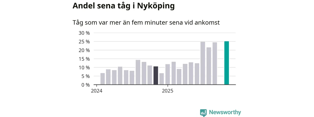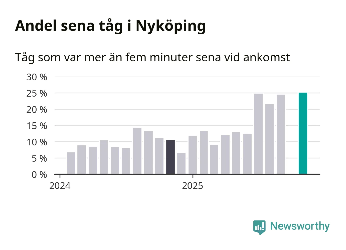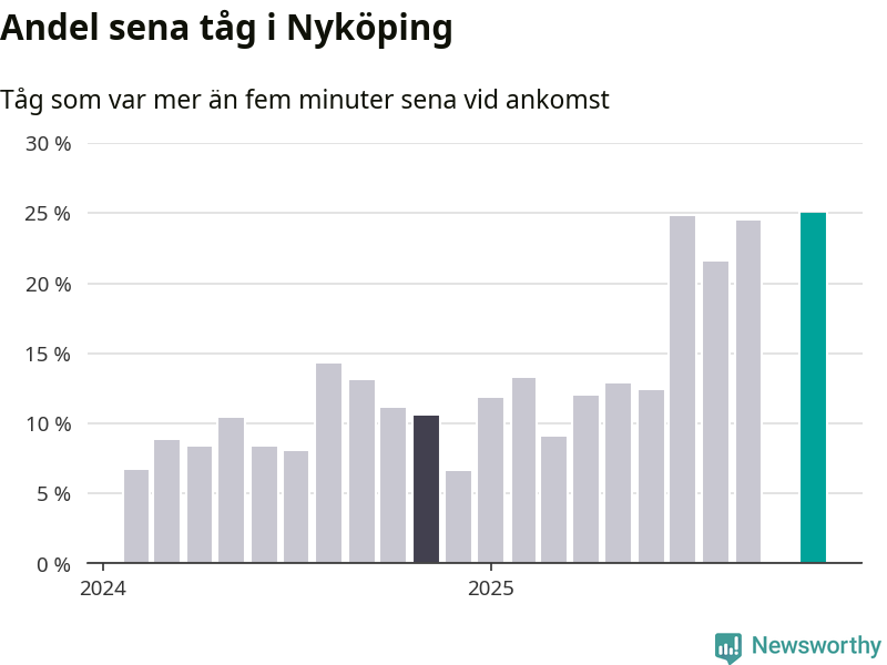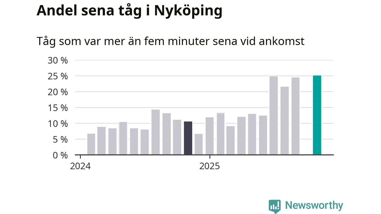 25 procent är den högsta andelen sena tåg sedan åtminstone den hårt förseningsdrabbade vintern 2023/24. Siffrorna bygger på realtidsinformation om tågavgångar och ankomster från Trafikverket, som Newsworthy löpande samlar in.