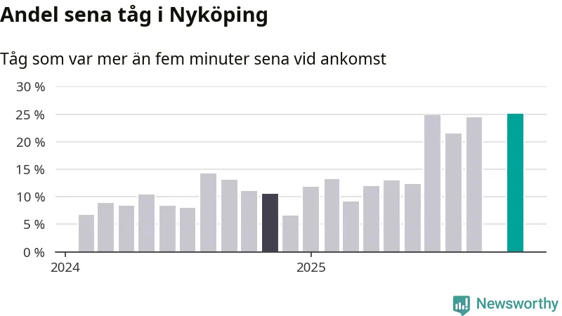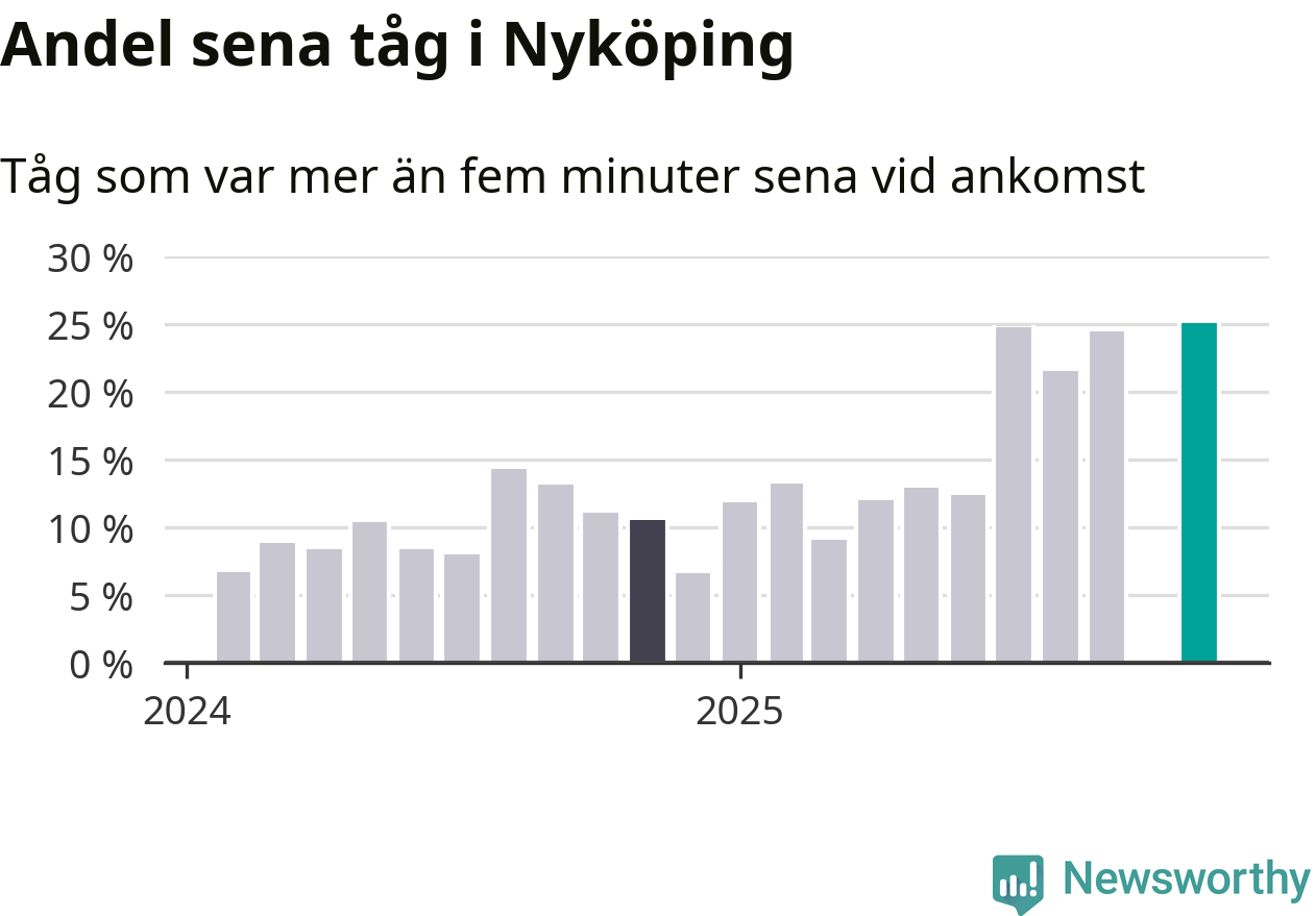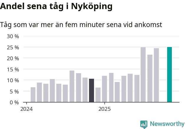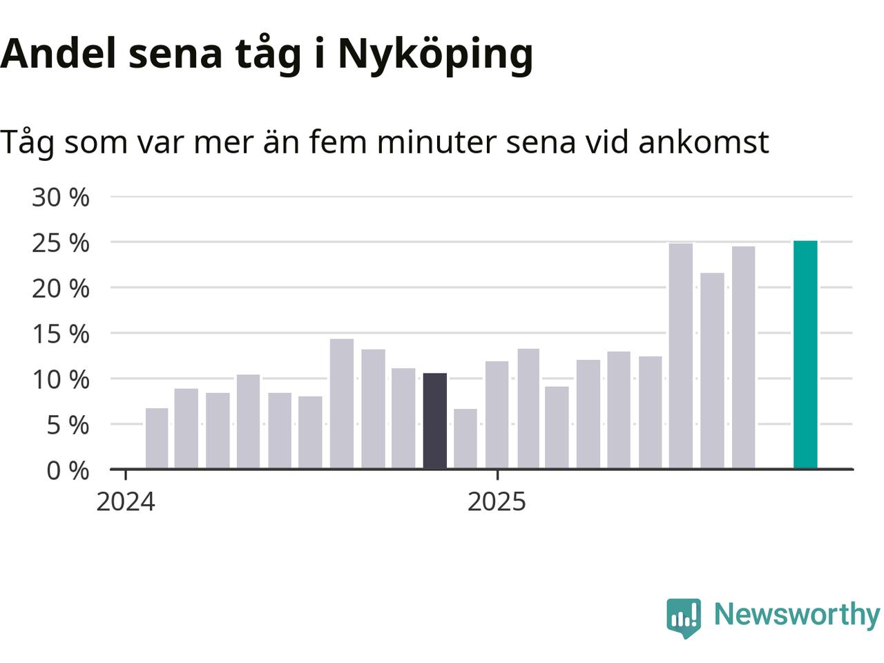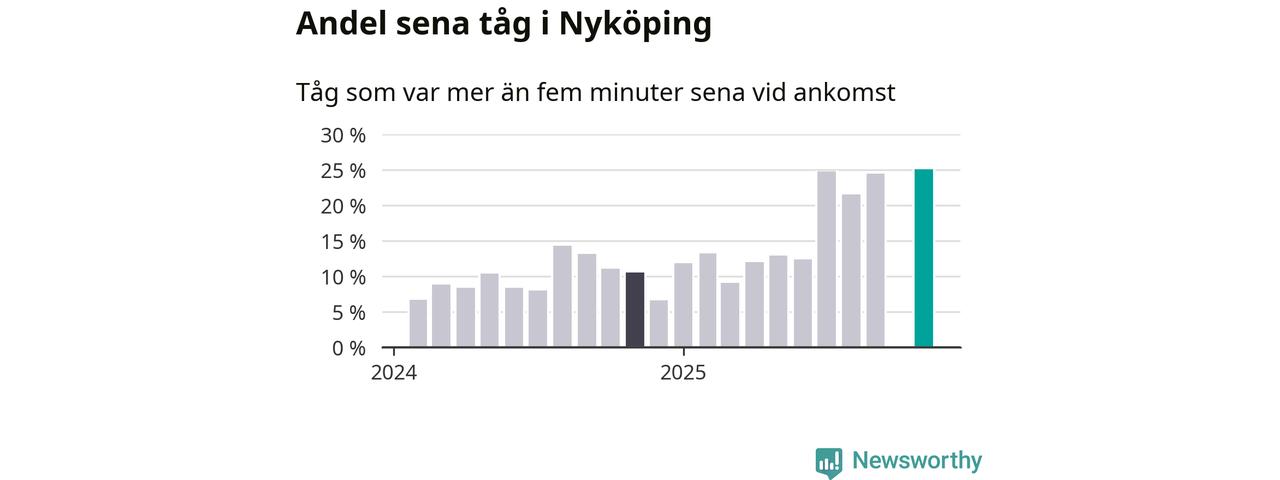 25 procent är den högsta andelen sena tåg sedan åtminstone den hårt förseningsdrabbade vintern 2023/24. Siffrorna bygger på realtidsinformation om tågavgångar och ankomster från Trafikverket, som Newsworthy löpande samlar in.