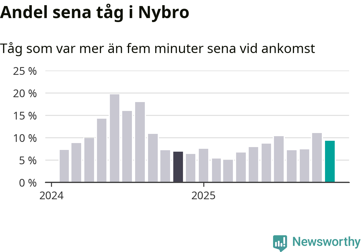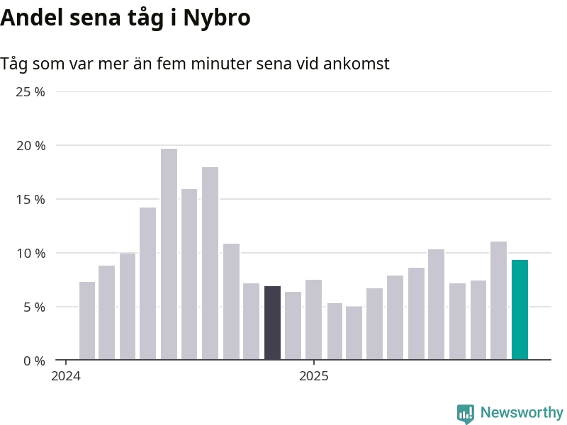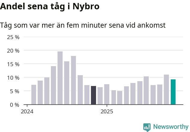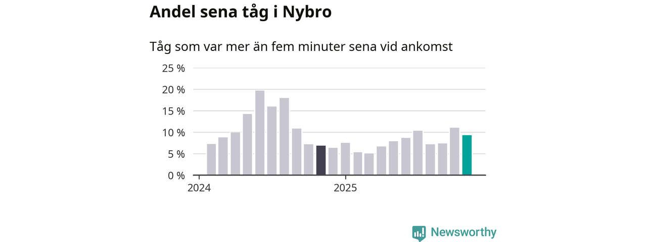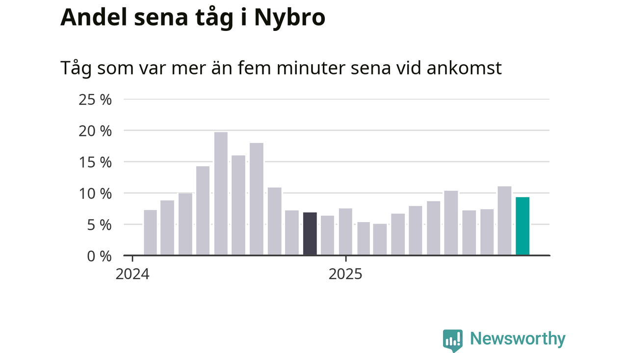 Nio procent kan jämföras med elva procent månaden innan, och sju procent i november 2024. Siffrorna bygger på realtidsinformation om tågavgångar och ankomster från Trafikverket, som Newsworthy löpande samlar in.