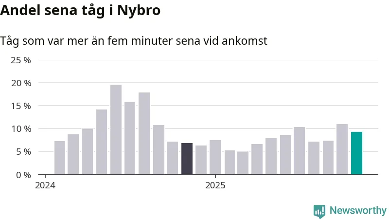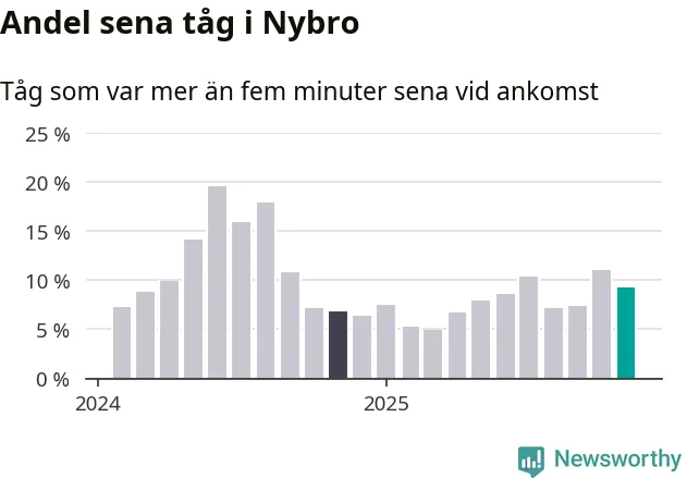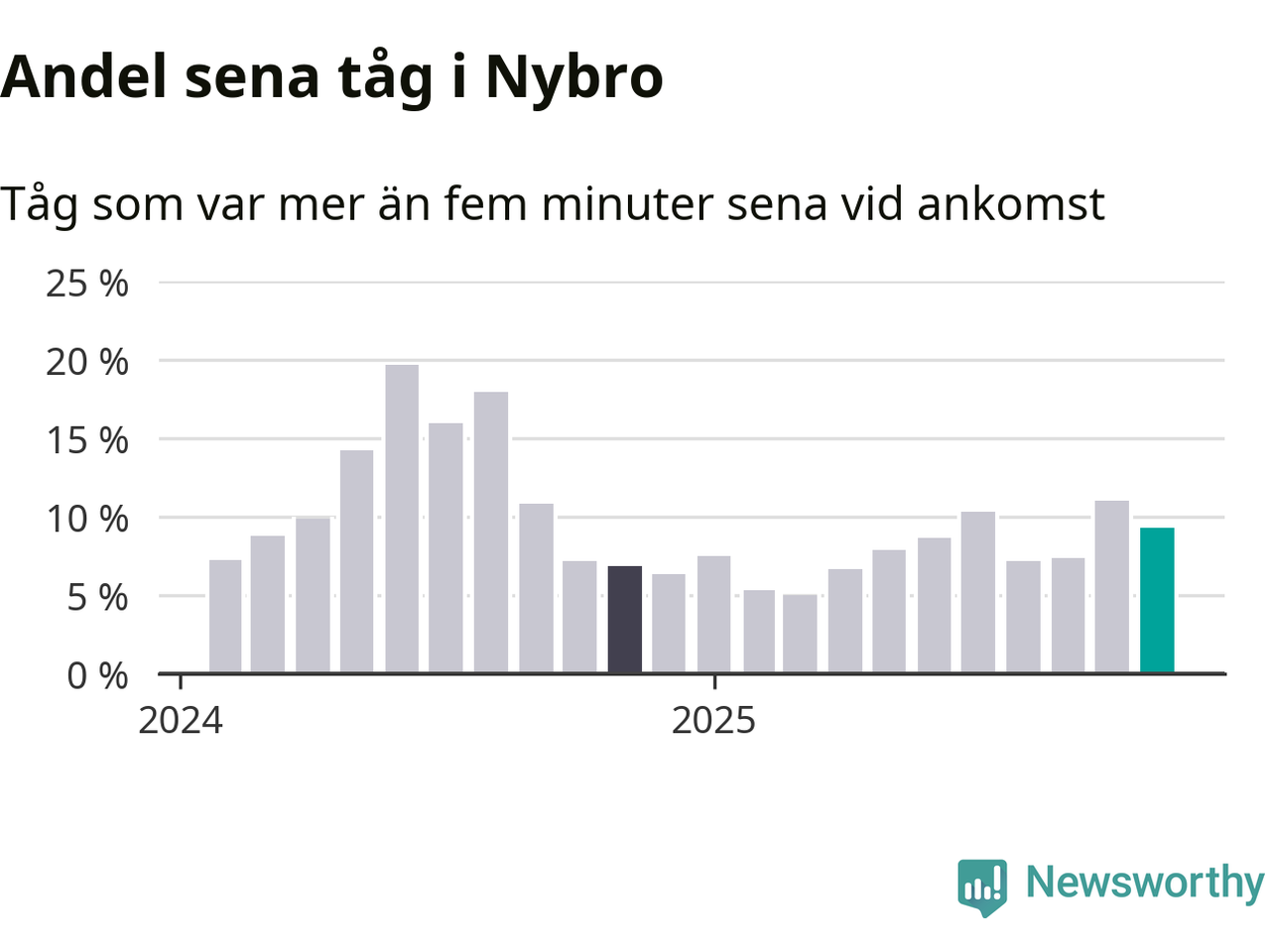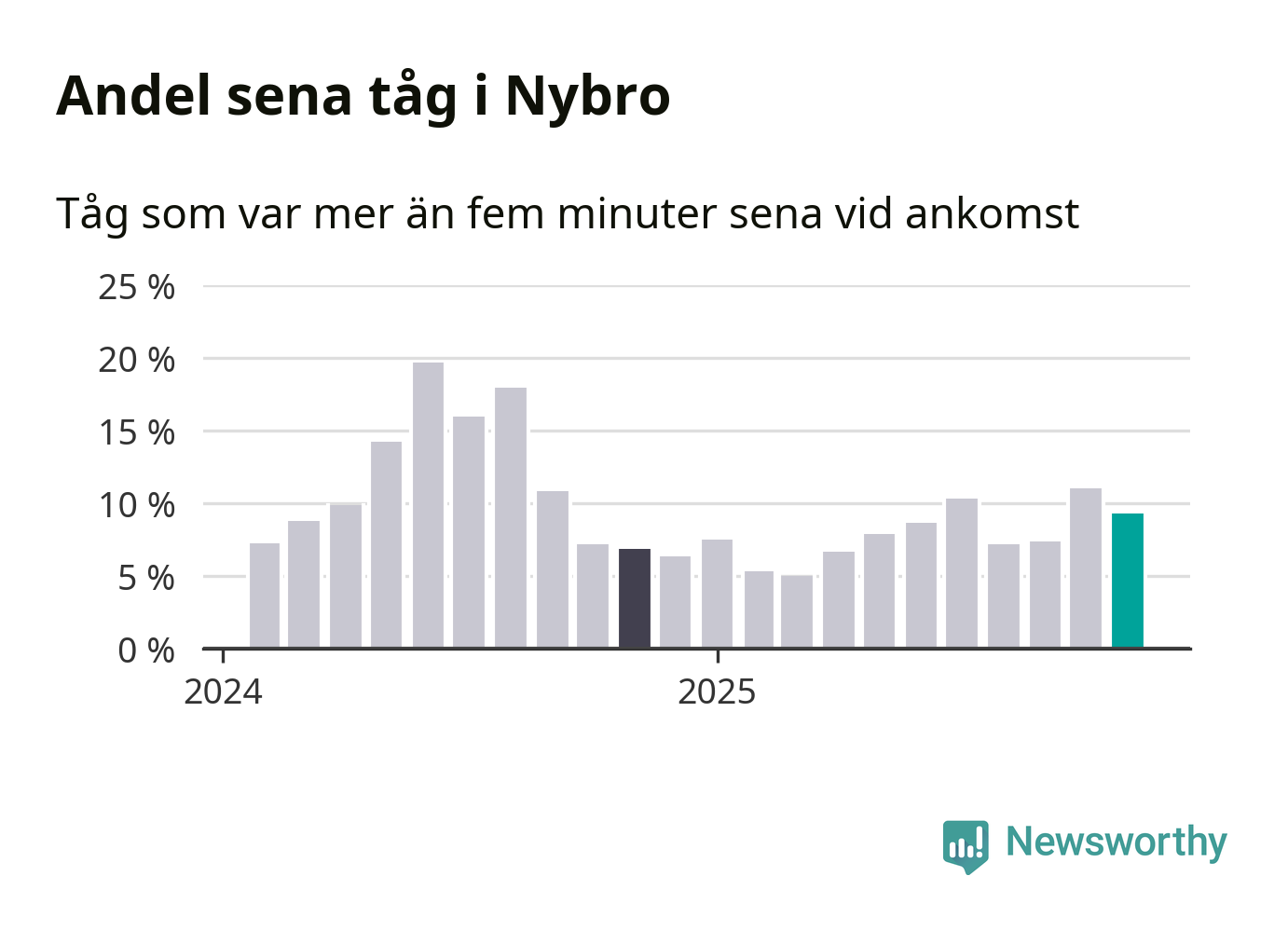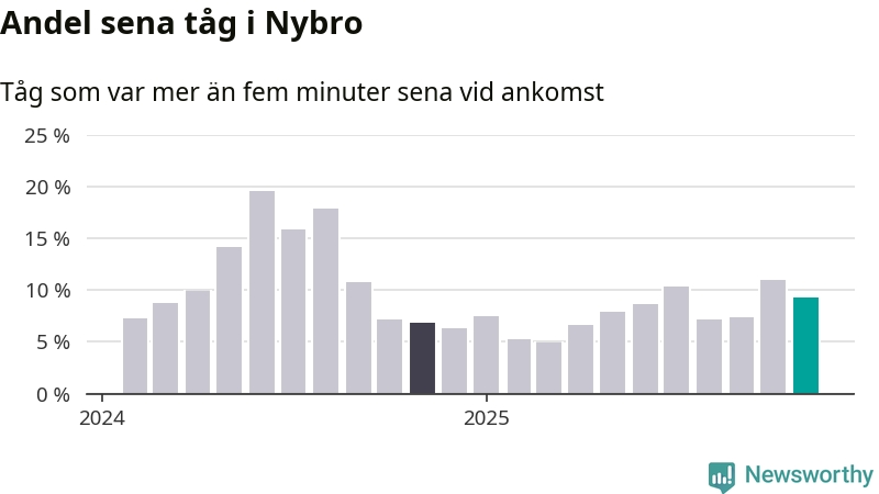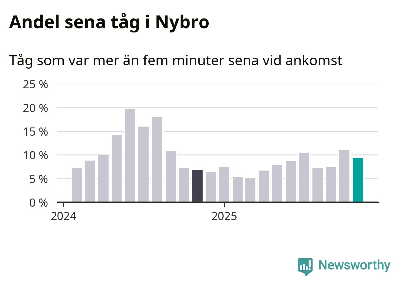 Nio procent kan jämföras med elva procent månaden innan, och sju procent i november 2024. Siffrorna bygger på realtidsinformation om tågavgångar och ankomster från Trafikverket, som Newsworthy löpande samlar in.