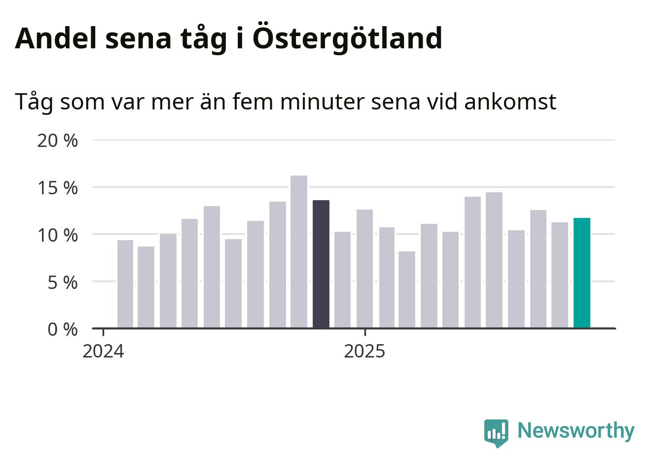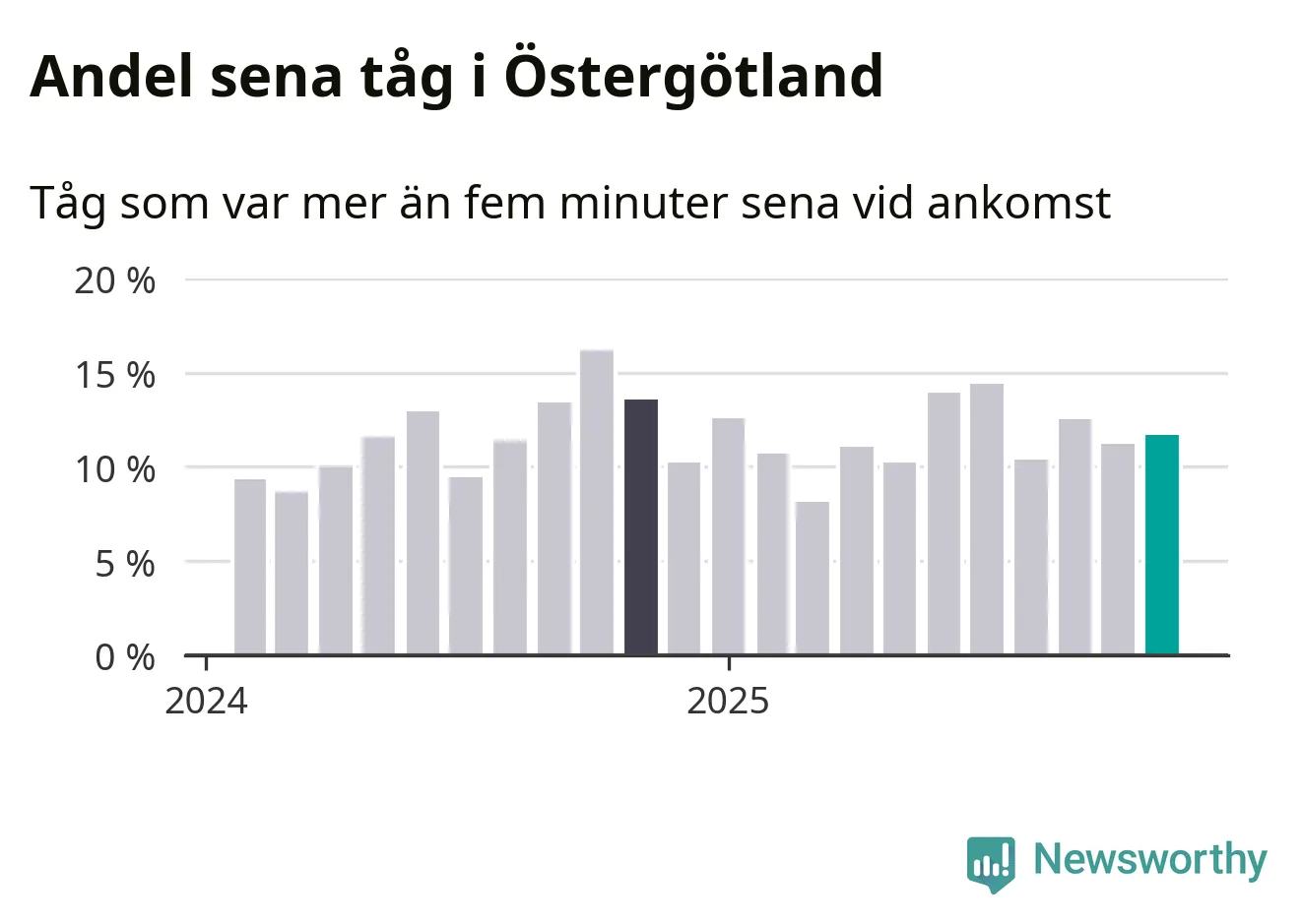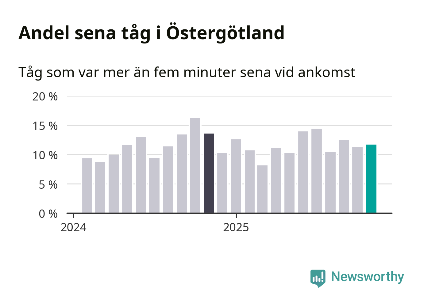 Tolv procent kan jämföras med elva procent månaden innan, och 14 procent i november 2024. Siffrorna bygger på realtidsinformation om tågavgångar och ankomster från Trafikverket, som Newsworthy löpande samlar in.