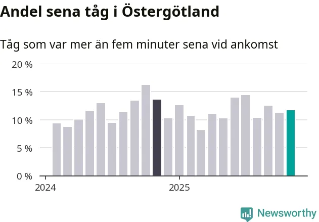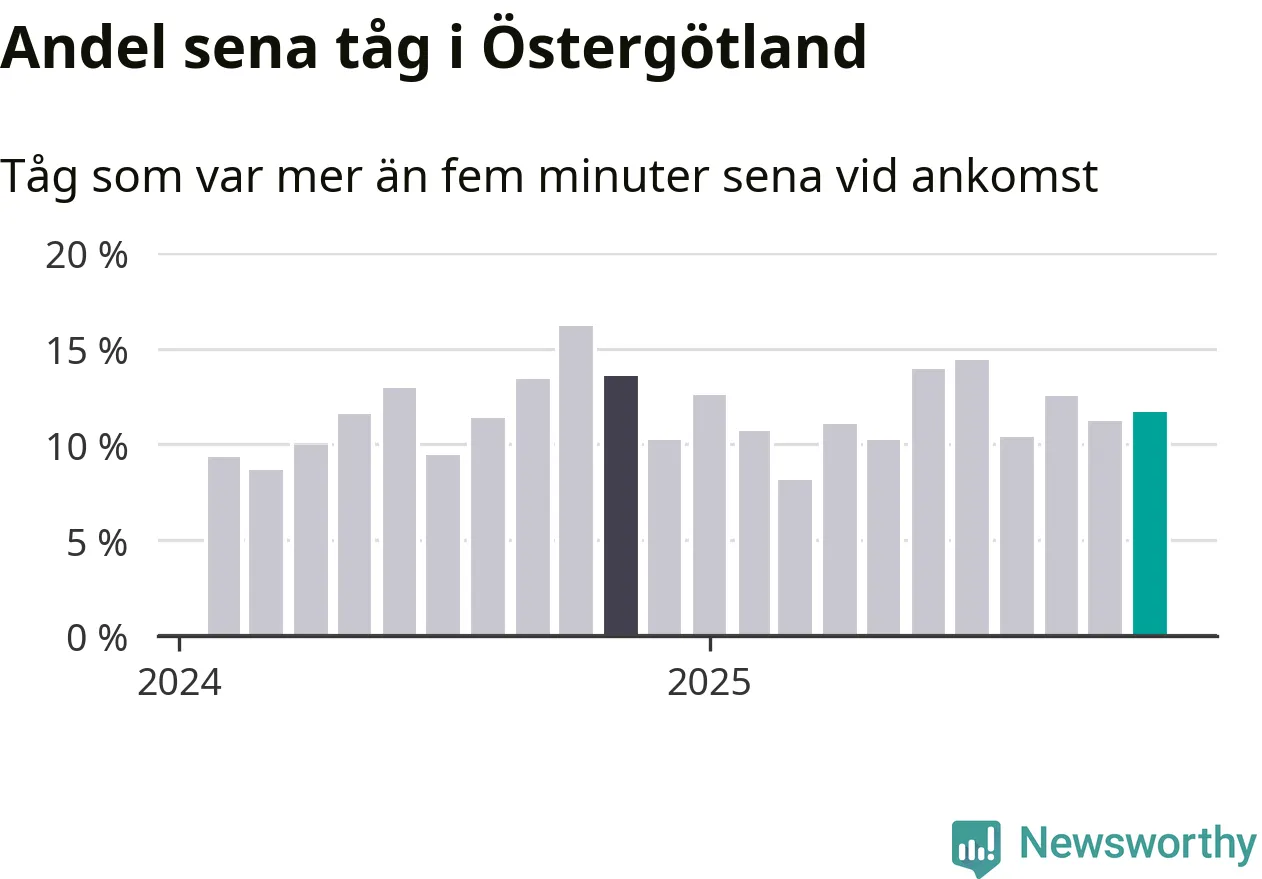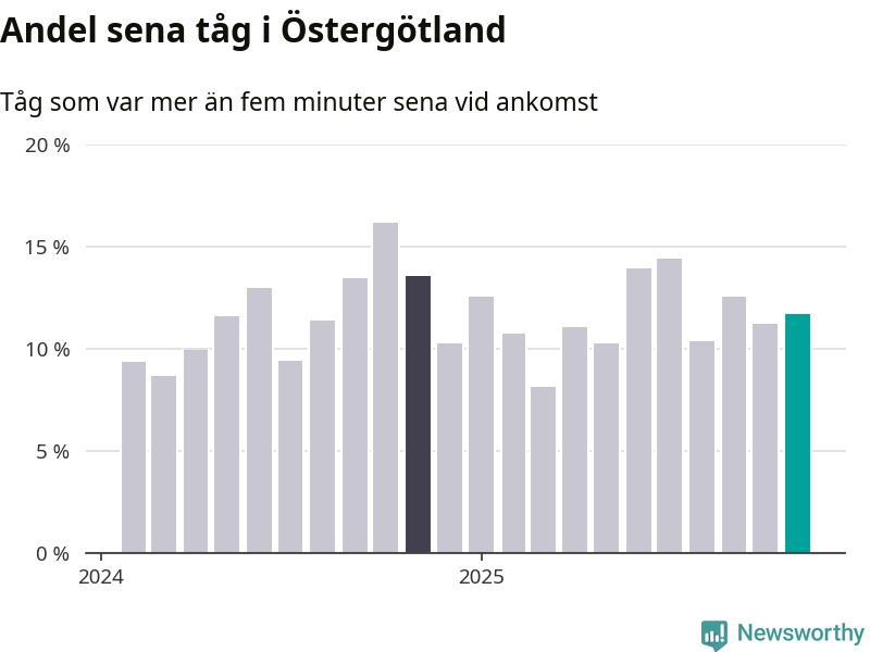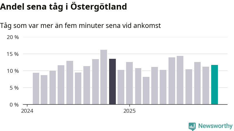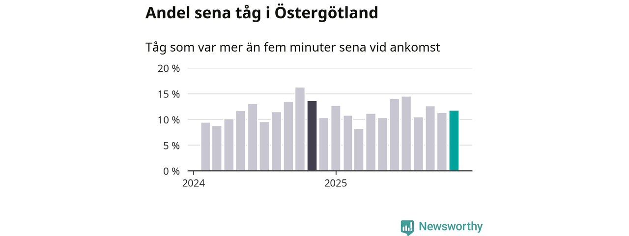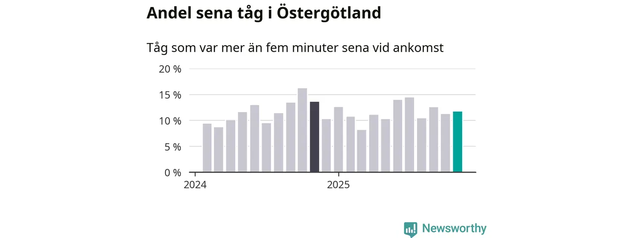 Tolv procent kan jämföras med elva procent månaden innan, och 14 procent i november 2024. Siffrorna bygger på realtidsinformation om tågavgångar och ankomster från Trafikverket, som Newsworthy löpande samlar in.