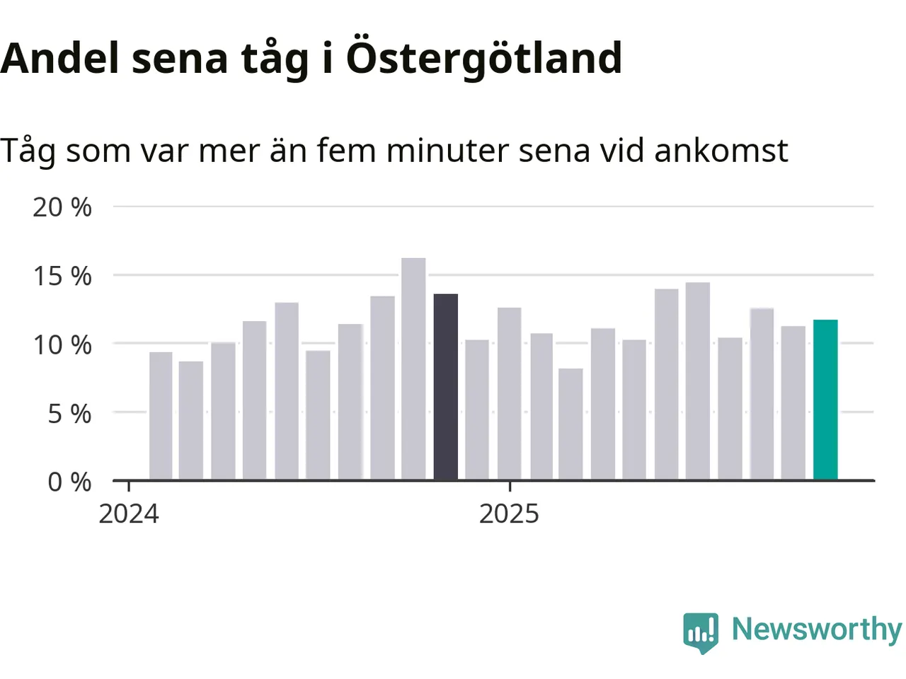 Av omkring 7 200 tåg som passerade någon av stationerna i Östergötlands län i november var 836 mer än fem minuter sena. Det motsvarar 12 procent, en bit över den nationella målsättningen som säger att inte mer än fem procent av tågen ska vara sena.