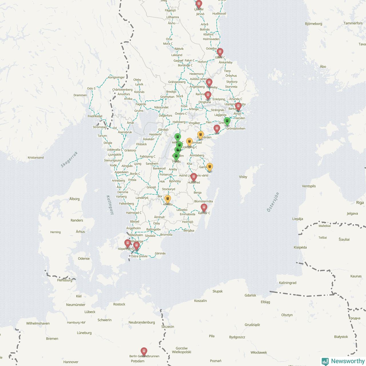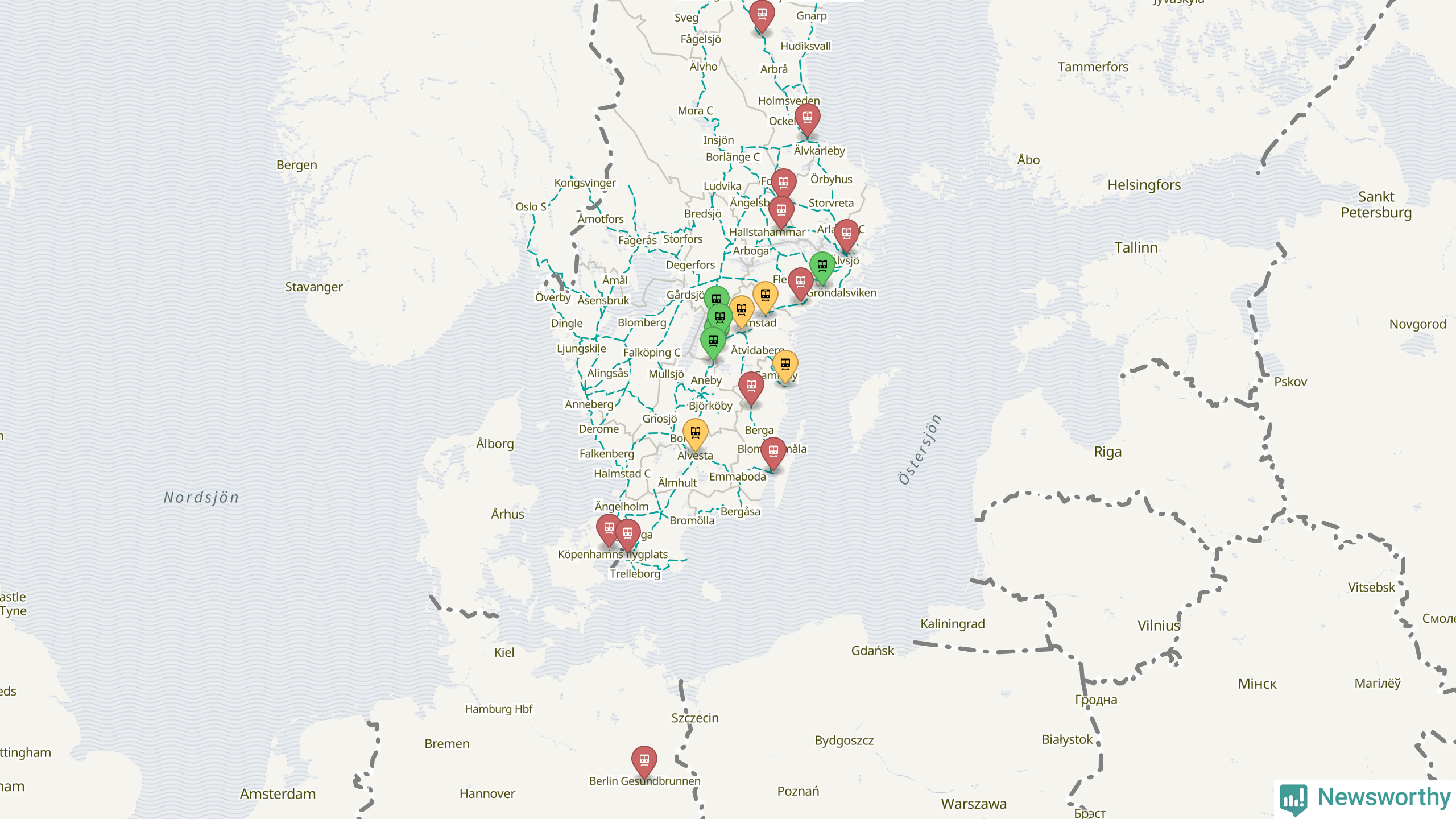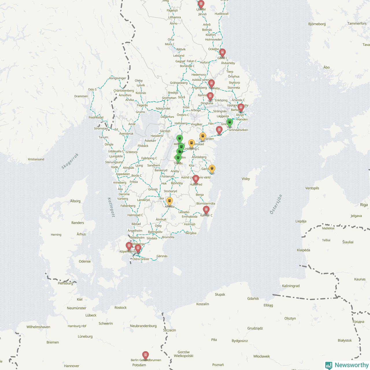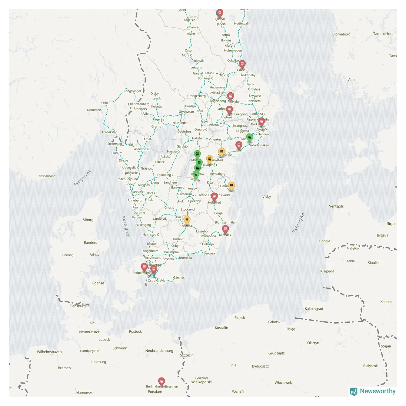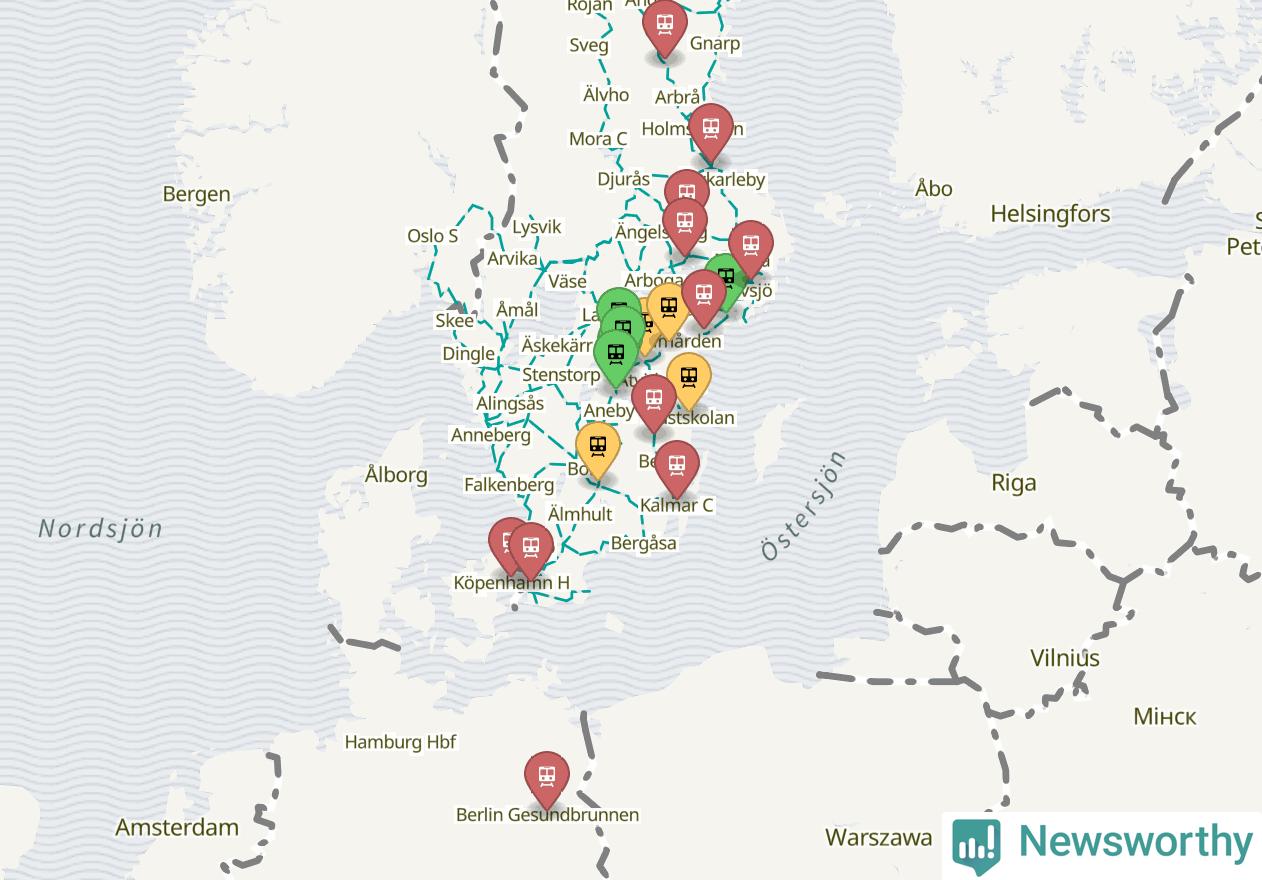Kartdata från Mapbox, Newsworthy, OpenStreetMap och Trafikverket. Uppgifter om sträckor med passagerartrafik från jarnvag.net.