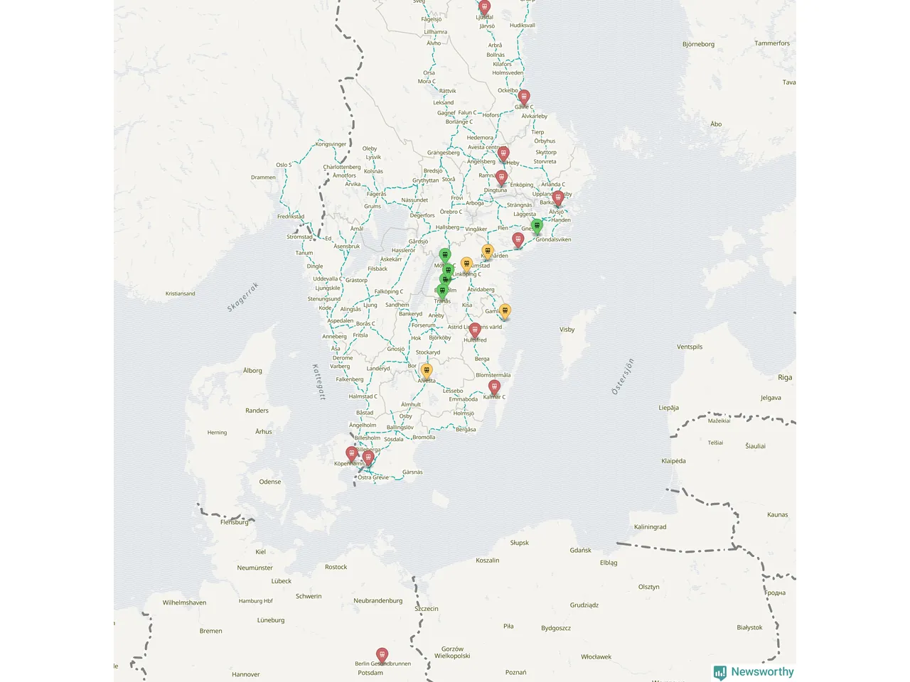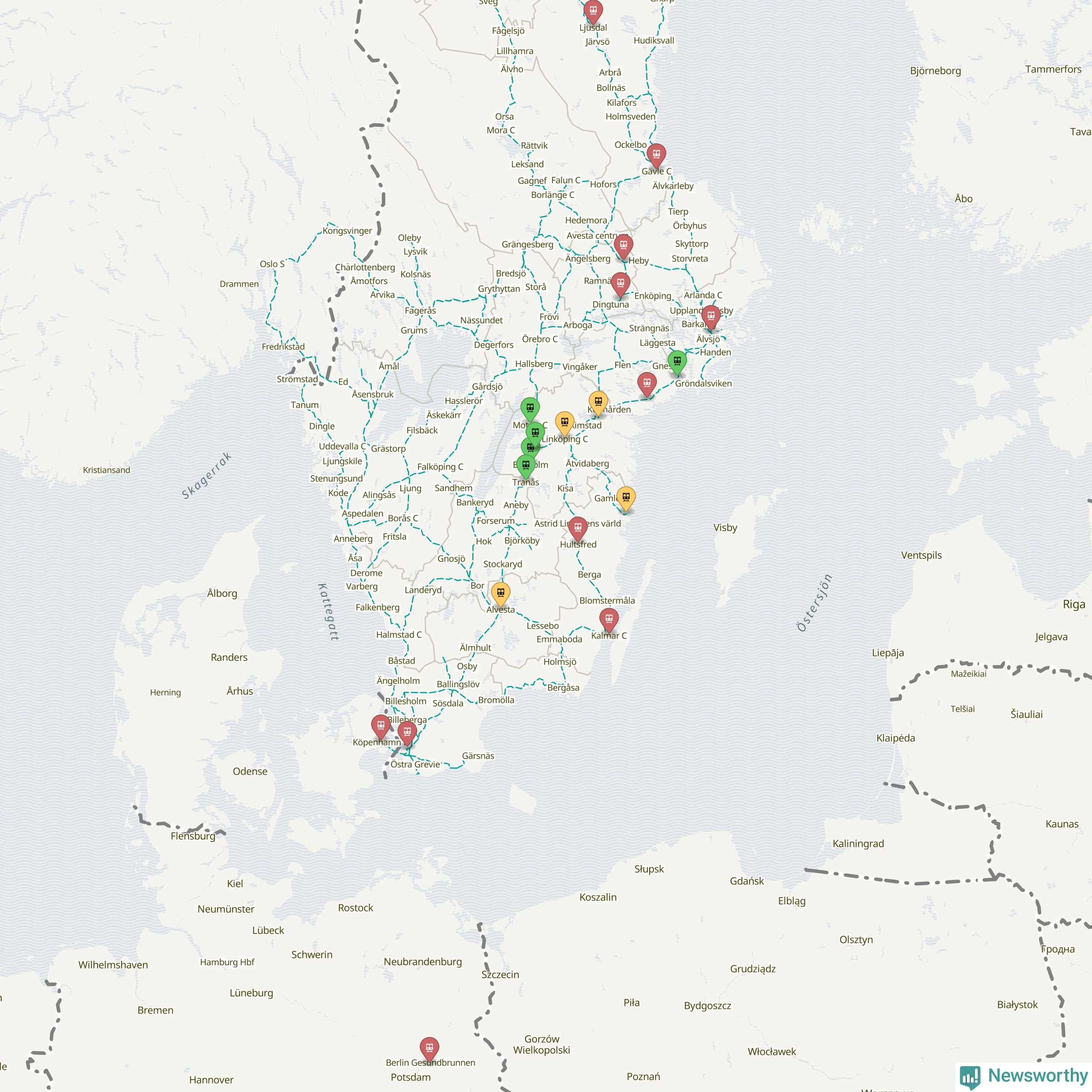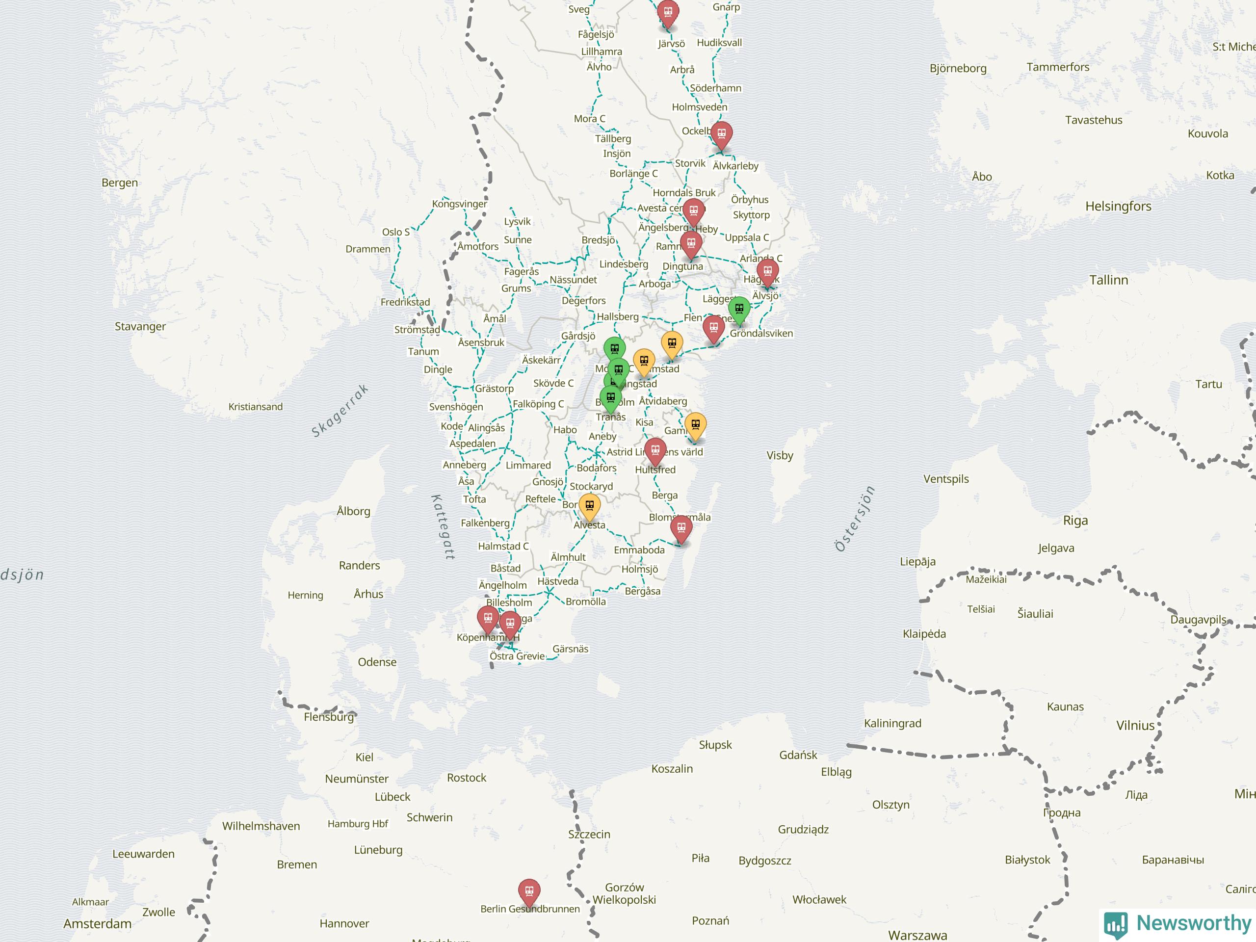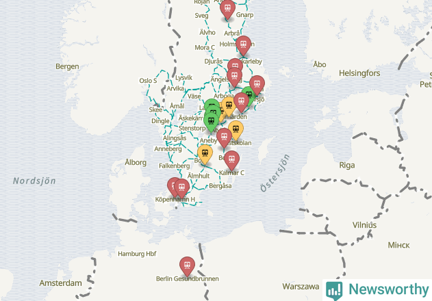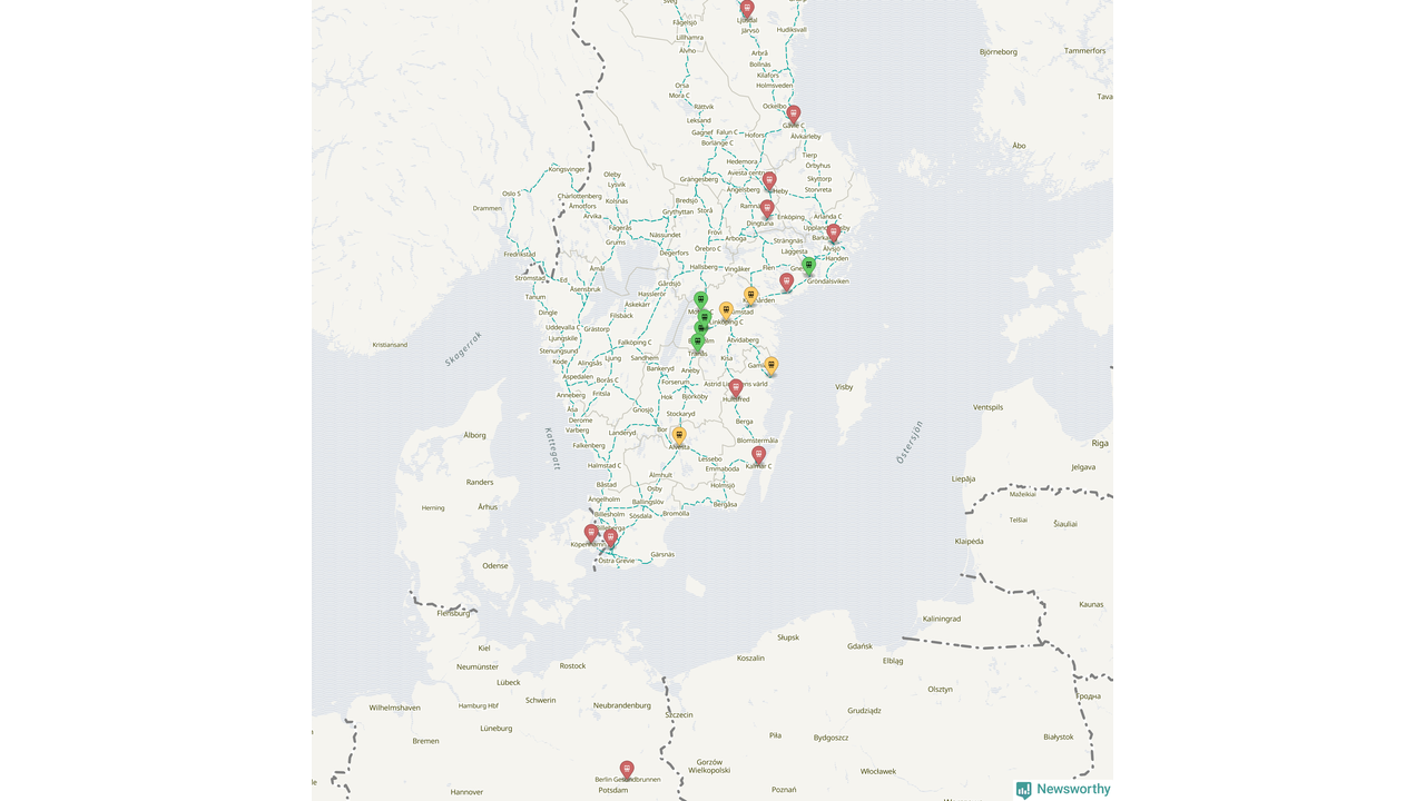 Kartdata från Mapbox, Newsworthy, OpenStreetMap och Trafikverket. Uppgifter om sträckor med passagerartrafik från jarnvag.net.