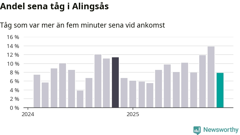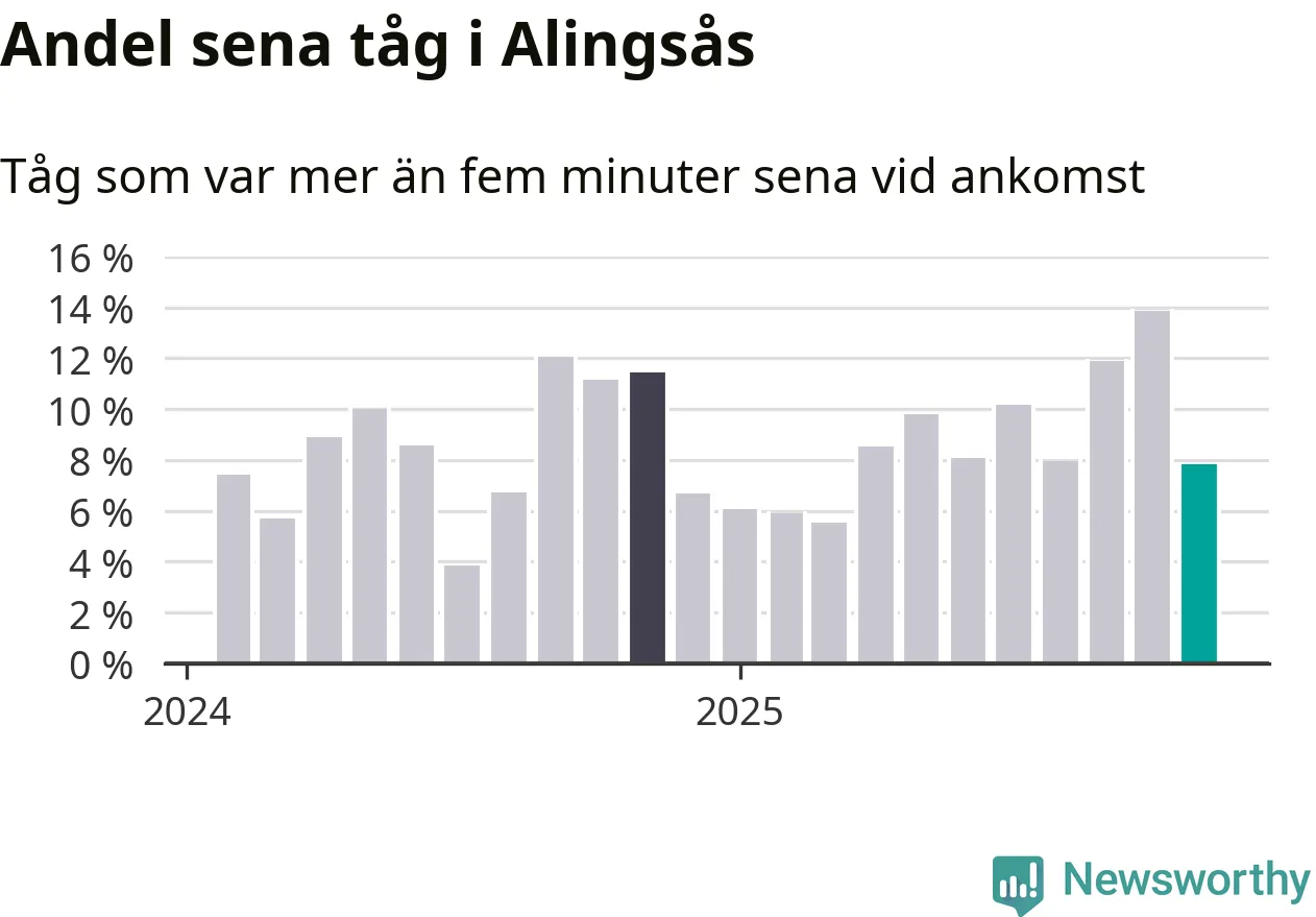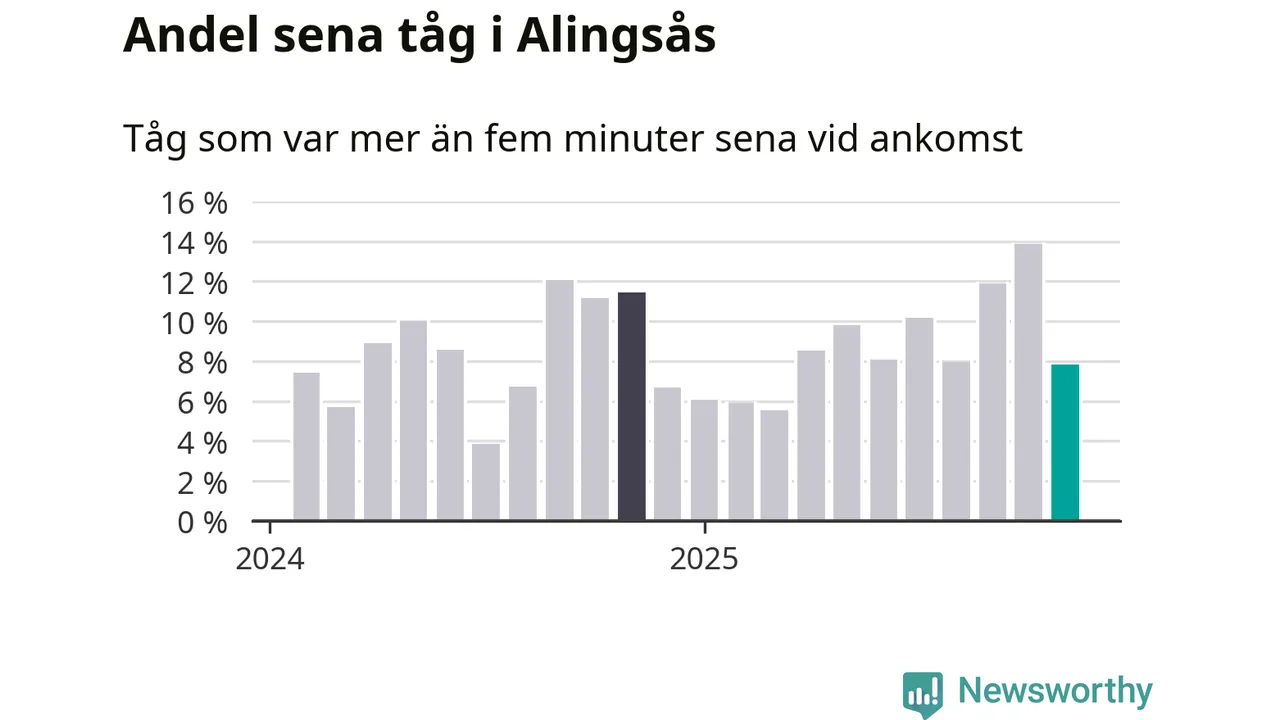 Åtta procent kan jämföras med 14 procent månaden innan, och elva procent i november 2024. Siffrorna bygger på realtidsinformation om tågavgångar och ankomster från Trafikverket, som Newsworthy löpande samlar in.