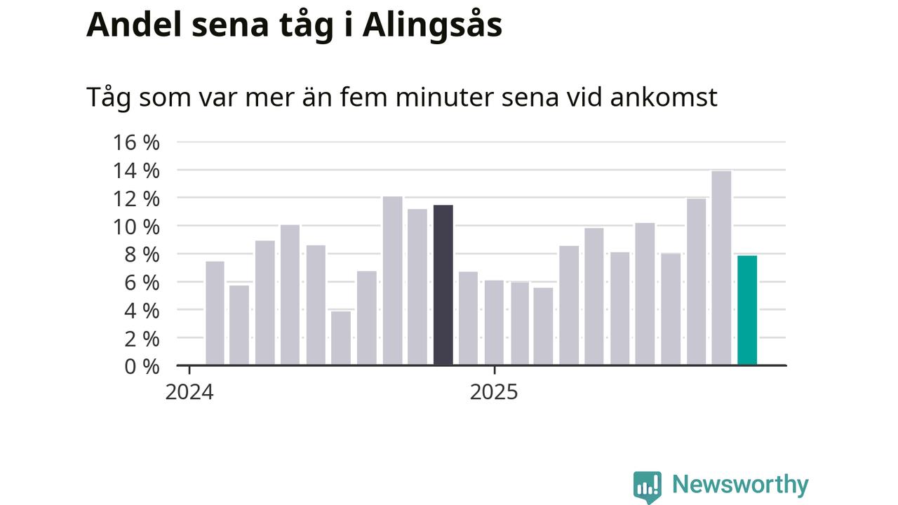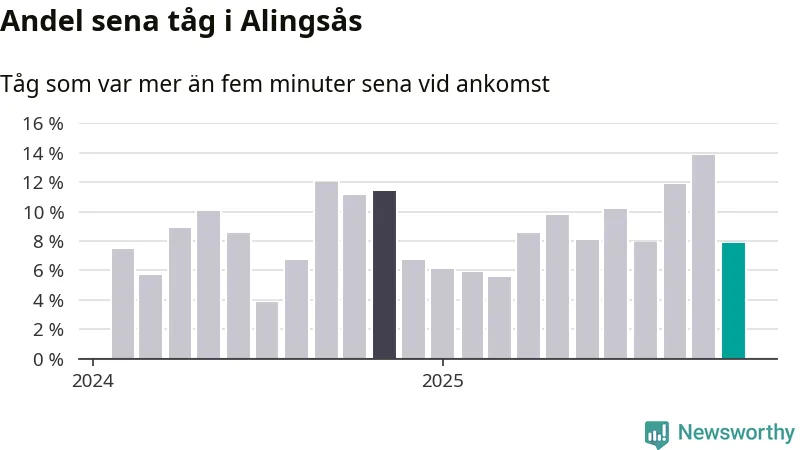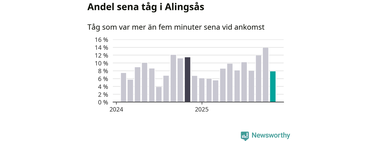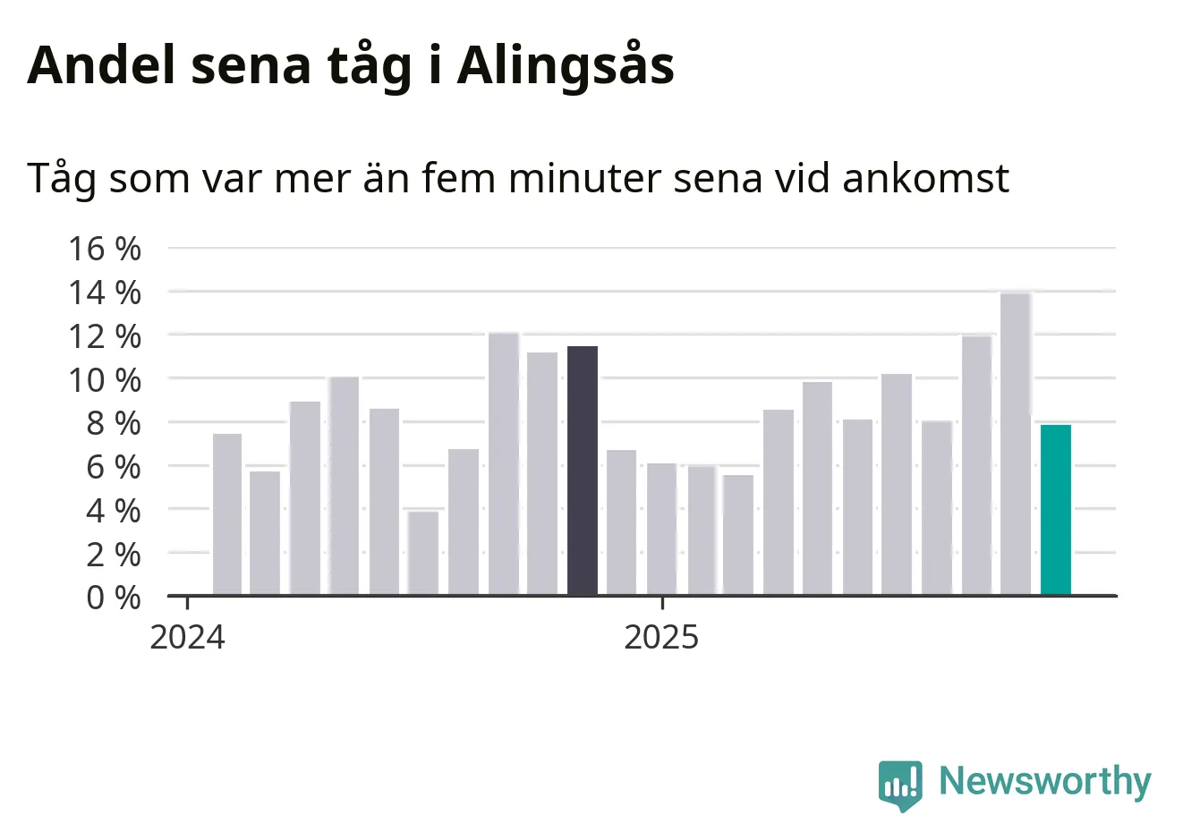 Av omkring 3 500 tåg som passerade Alingsås eller Västra Bodarne i november var 277 mer än fem minuter sena. Det motsvarar 8 procent, en bit över den nationella målsättningen som säger att inte mer än fem procent av tågen ska vara sena.