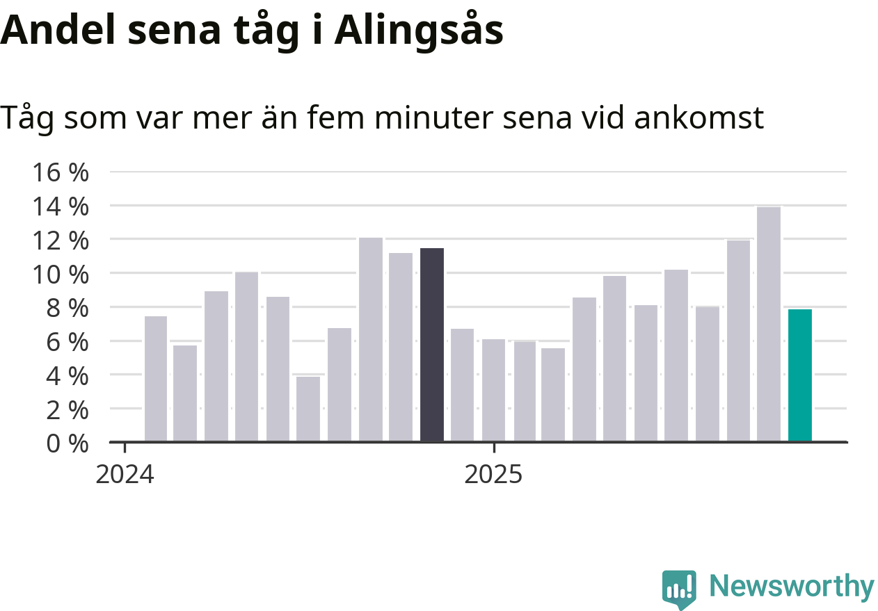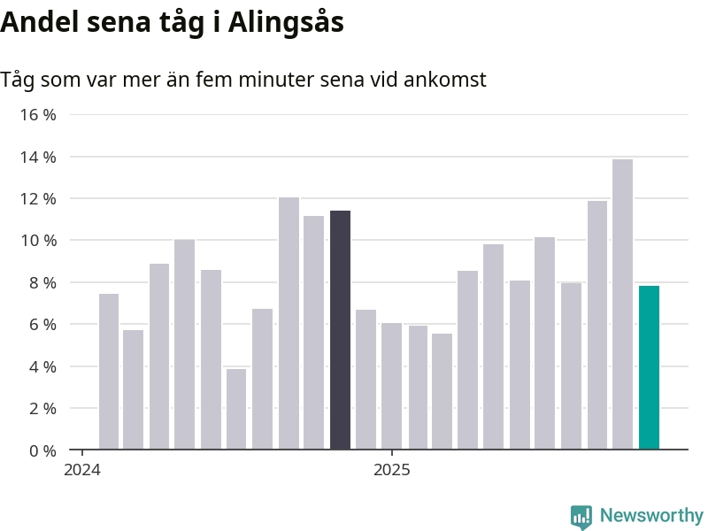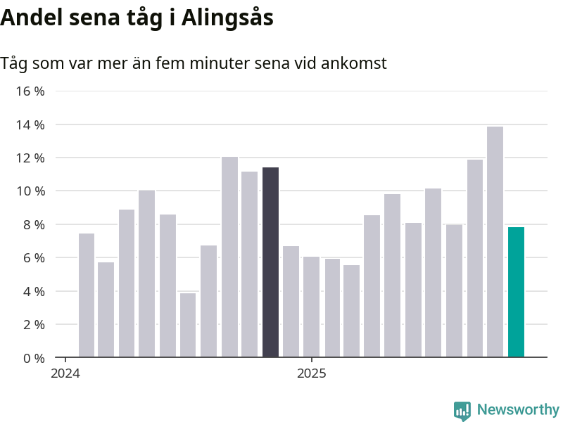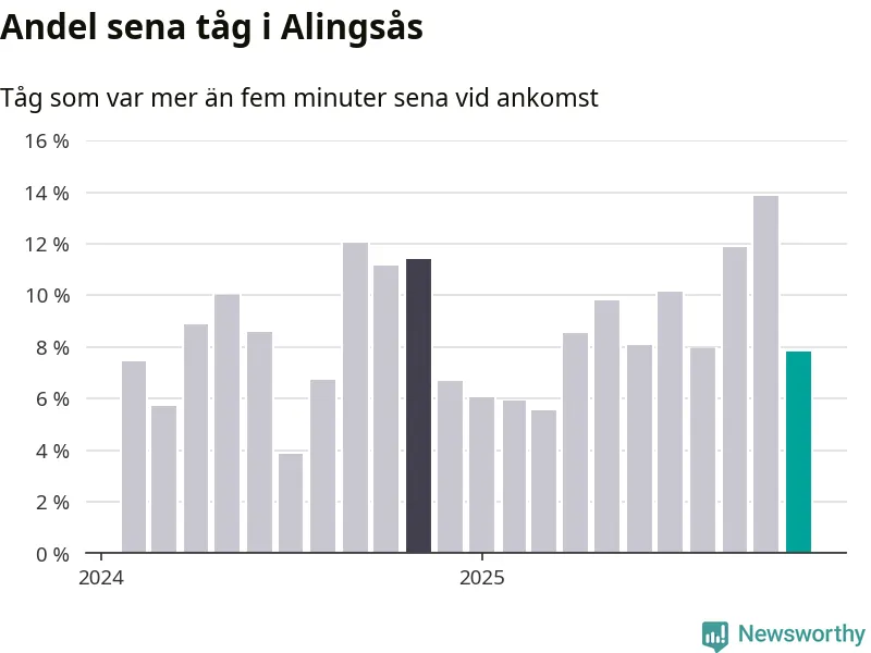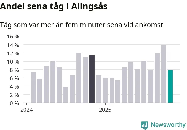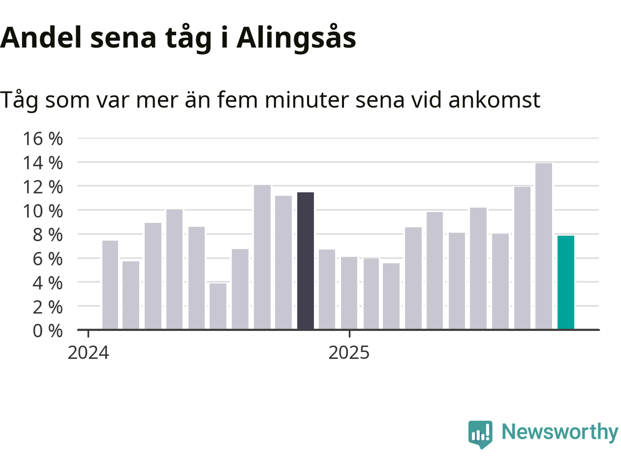 Av omkring 3 500 tåg som passerade Alingsås eller Västra Bodarne i november var 277 mer än fem minuter sena. Det motsvarar 8 procent, en bit över den nationella målsättningen som säger att inte mer än fem procent av tågen ska vara sena.