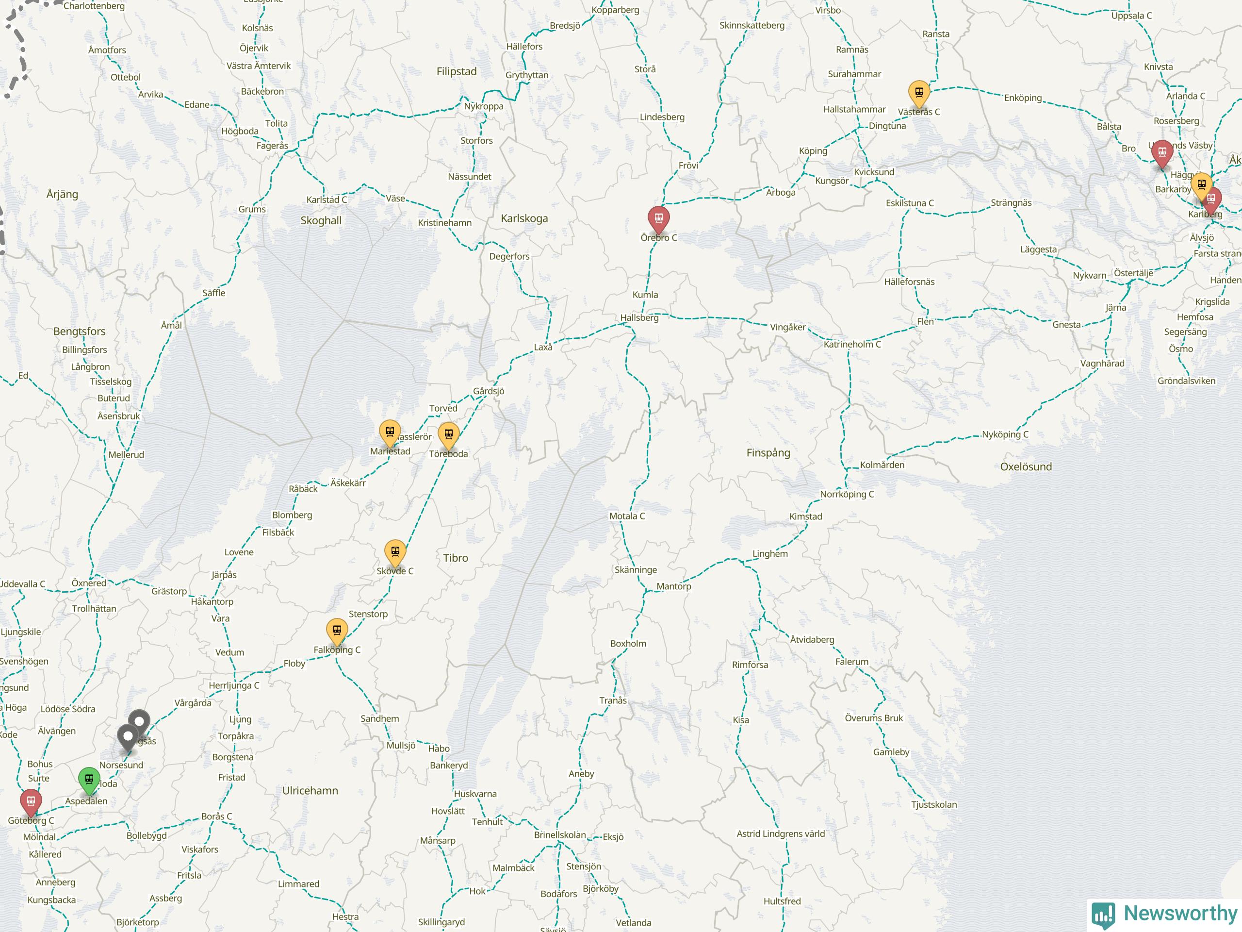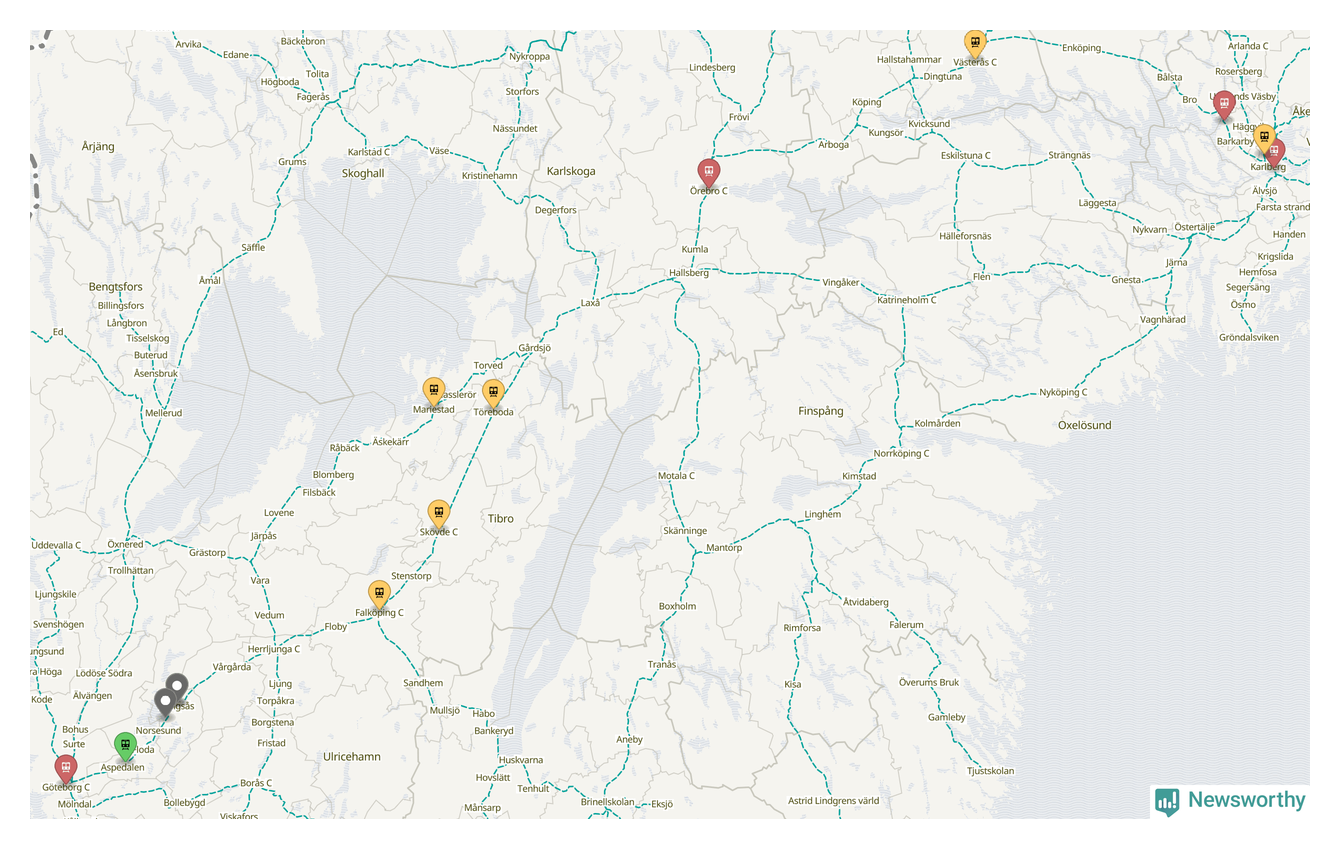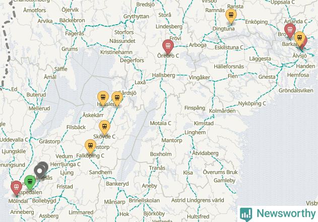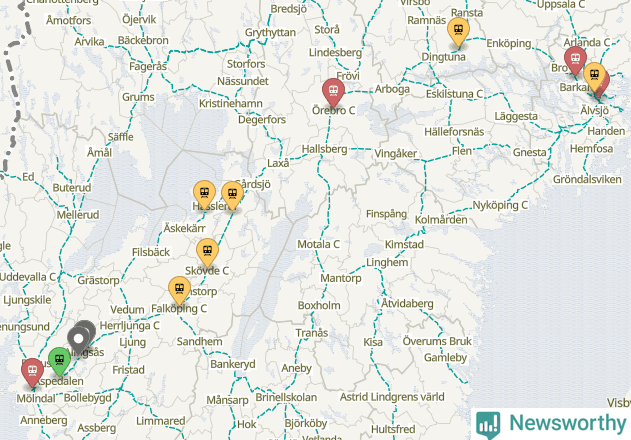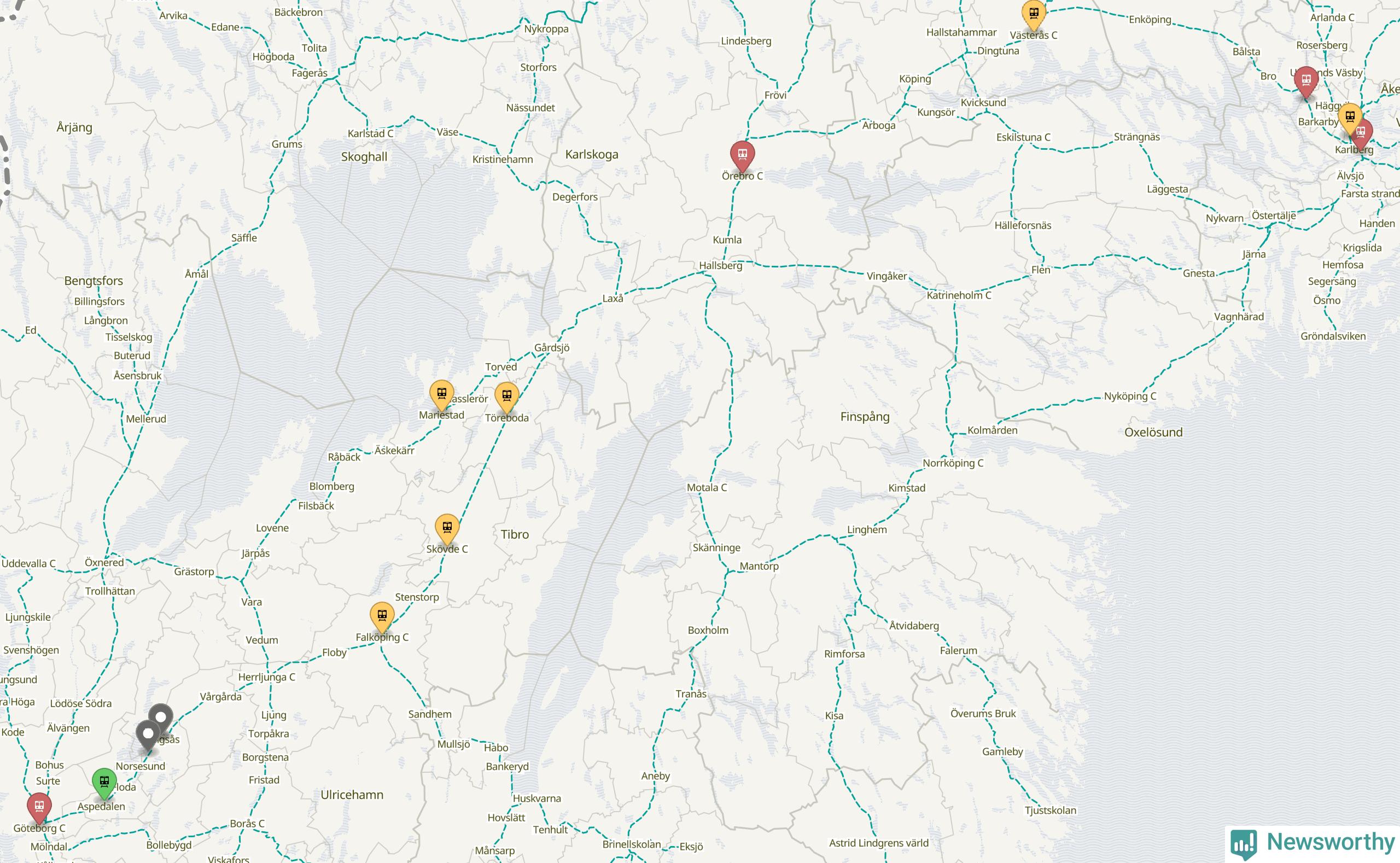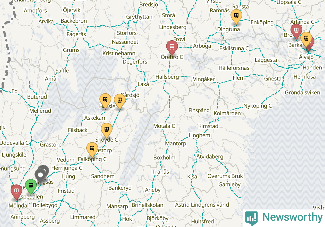 Kartdata från Mapbox, Newsworthy, OpenStreetMap och Trafikverket. Uppgifter om sträckor med passagerartrafik från jarnvag.net.
