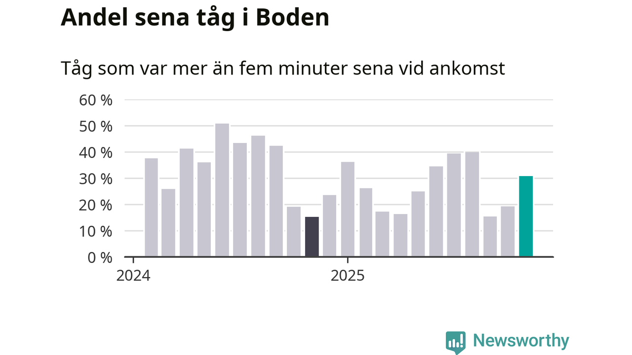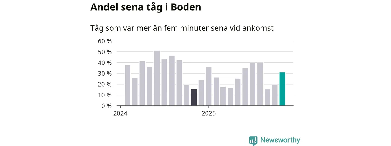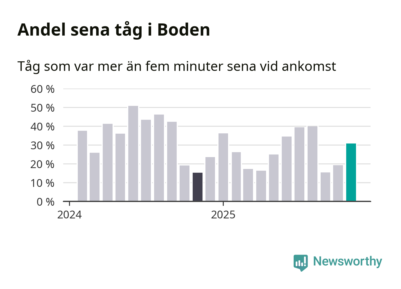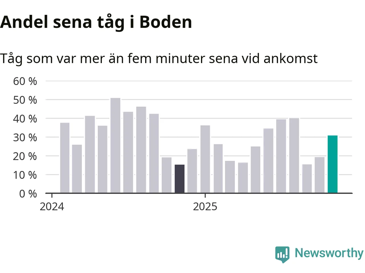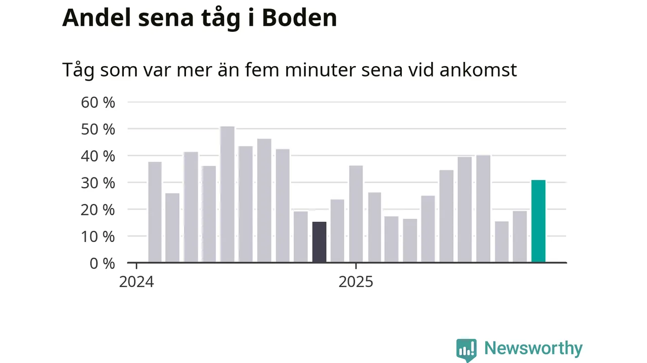 31 procent kan jämföras med 19 procent månaden innan, och 15 procent i november 2024. Siffrorna bygger på realtidsinformation om tågavgångar och ankomster från Trafikverket, som Newsworthy löpande samlar in.
