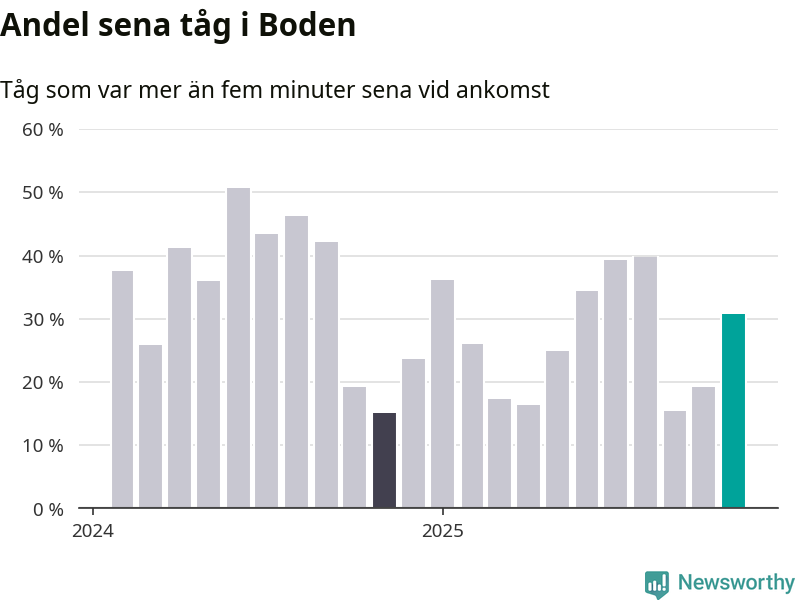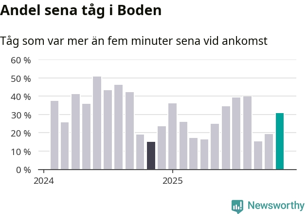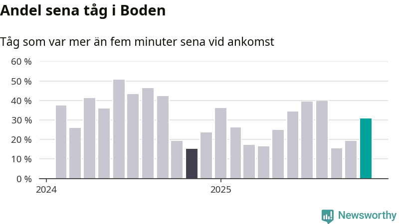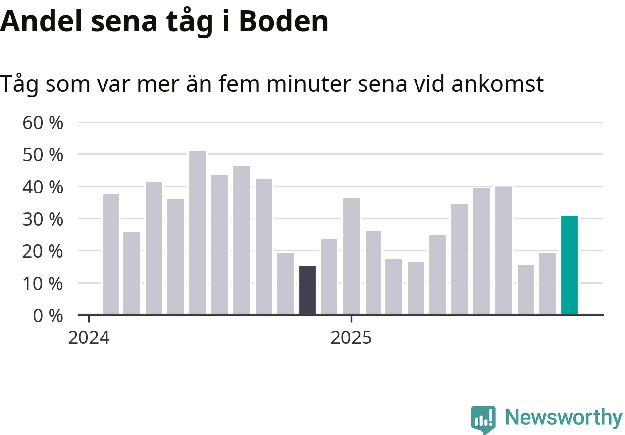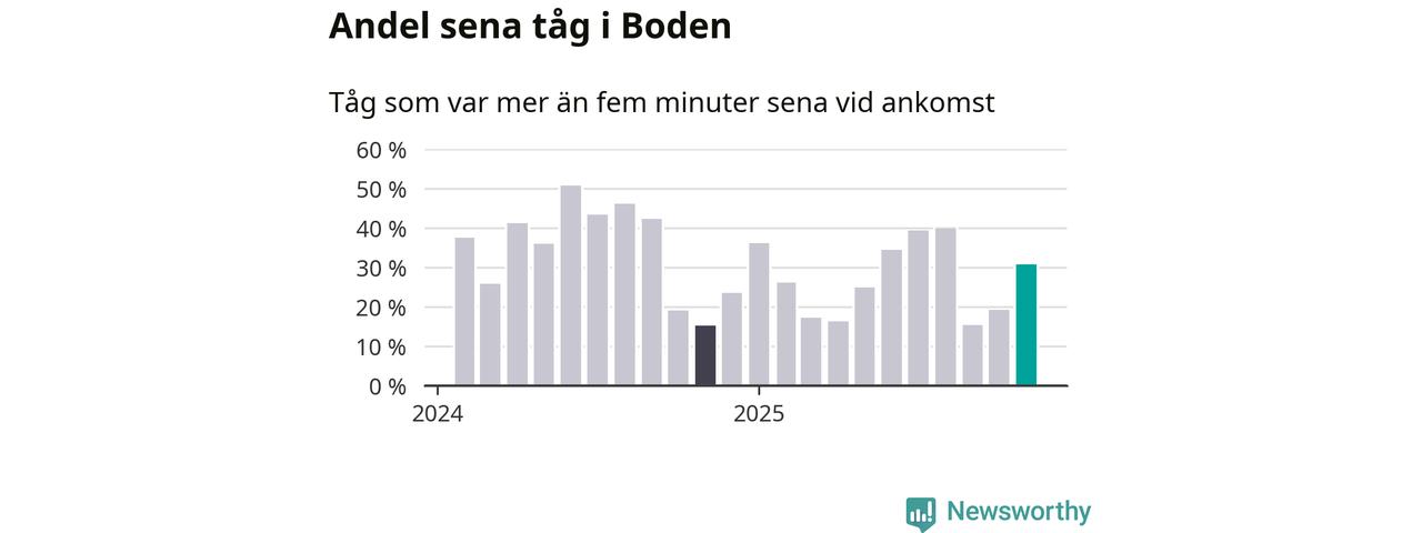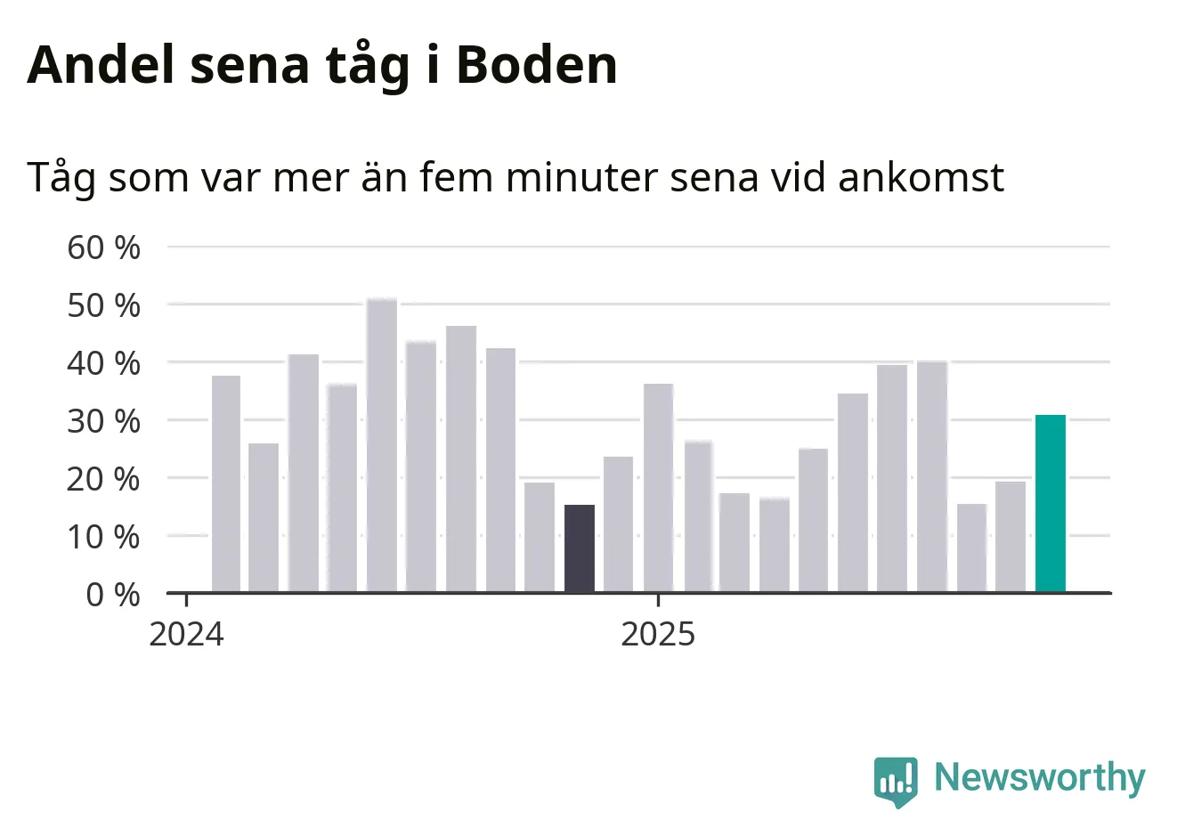 31 procent kan jämföras med 19 procent månaden innan, och 15 procent i november 2024. Siffrorna bygger på realtidsinformation om tågavgångar och ankomster från Trafikverket, som Newsworthy löpande samlar in.