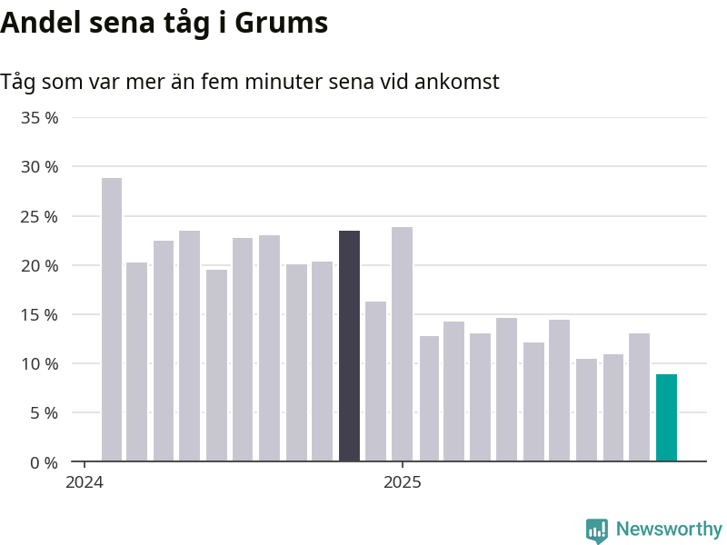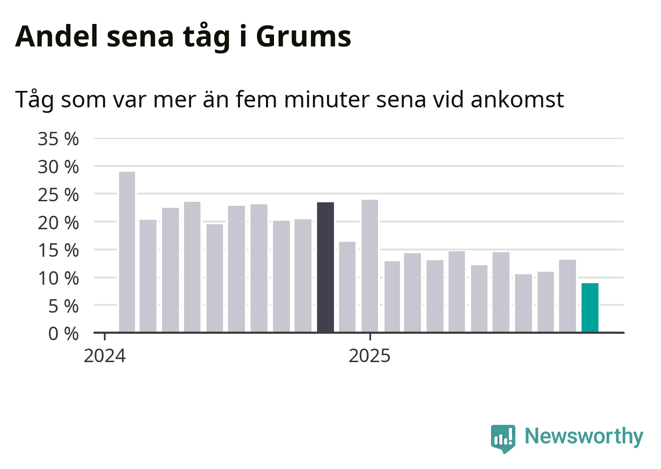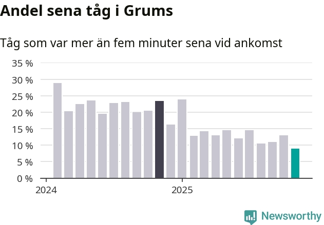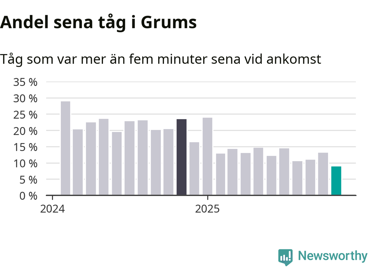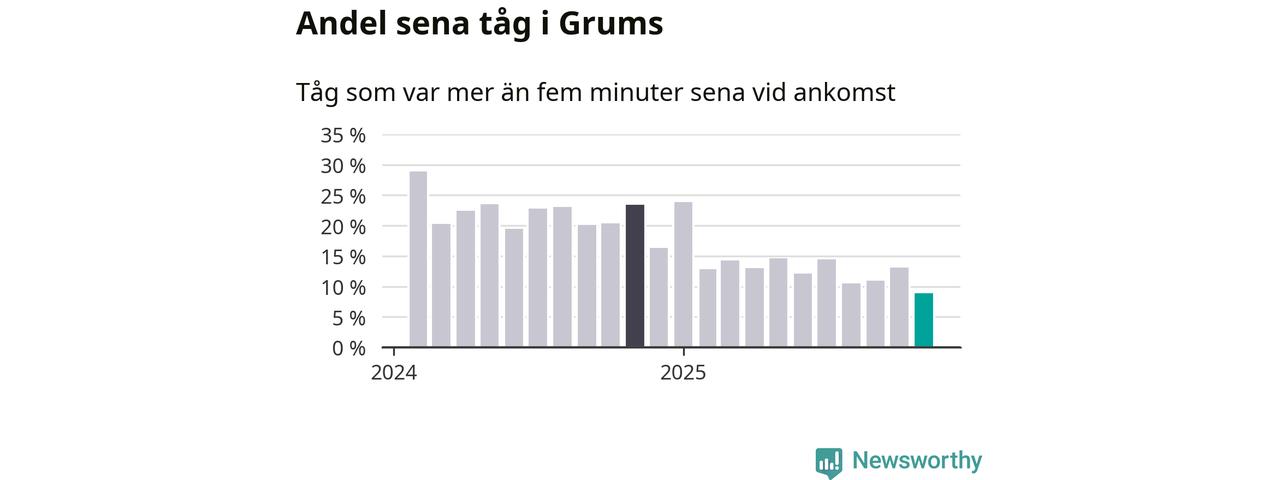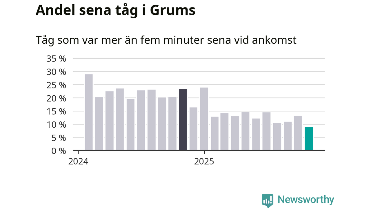 Nio procent är den lägsta andelen sena tåg sedan Newsworthy började mäta lokala förseningar i början av 2024. Siffrorna bygger på realtidsinformation om tågavgångar och ankomster från Trafikverket, som Newsworthy löpande samlar in.