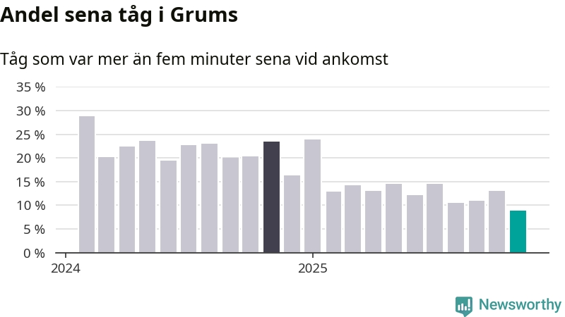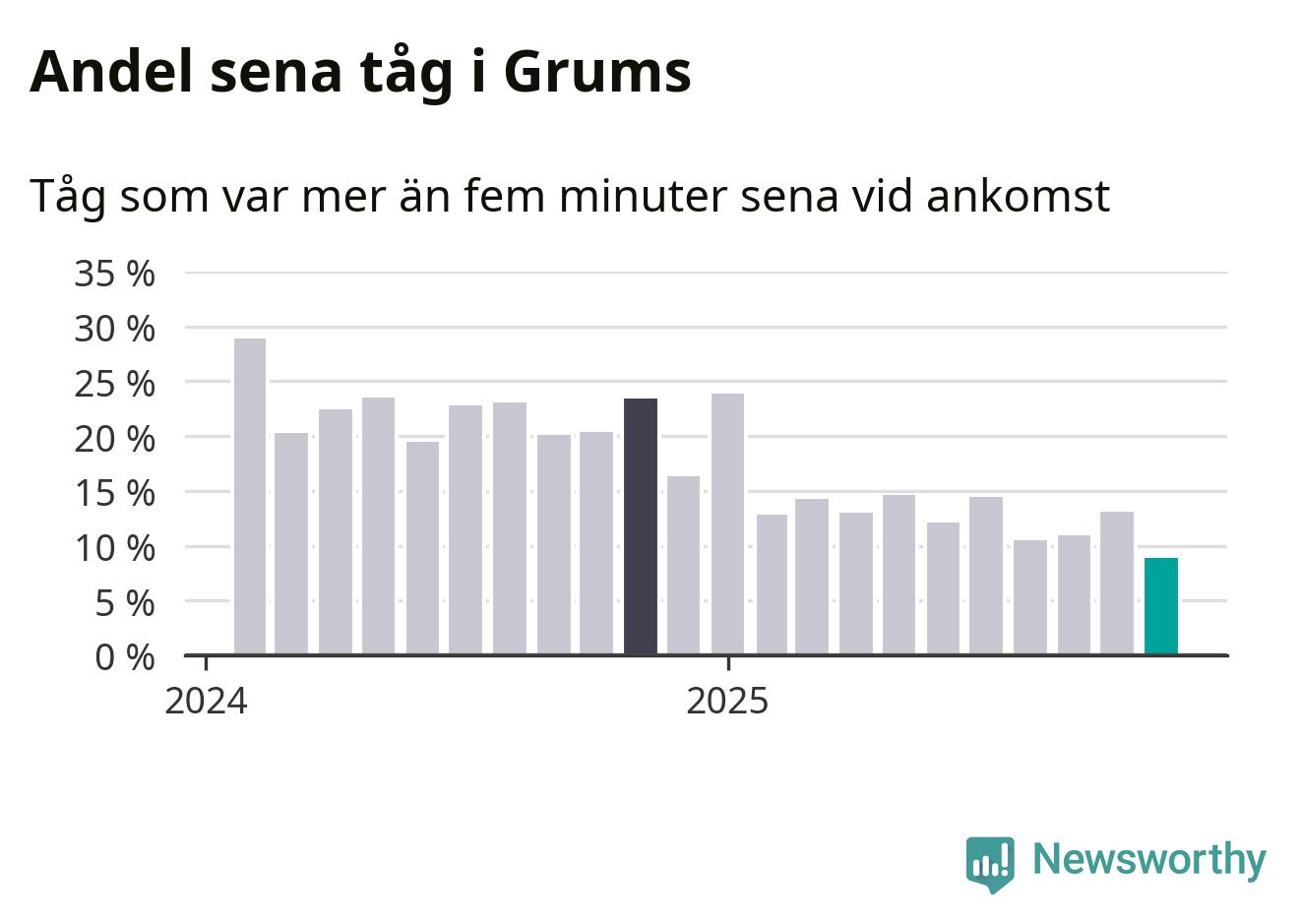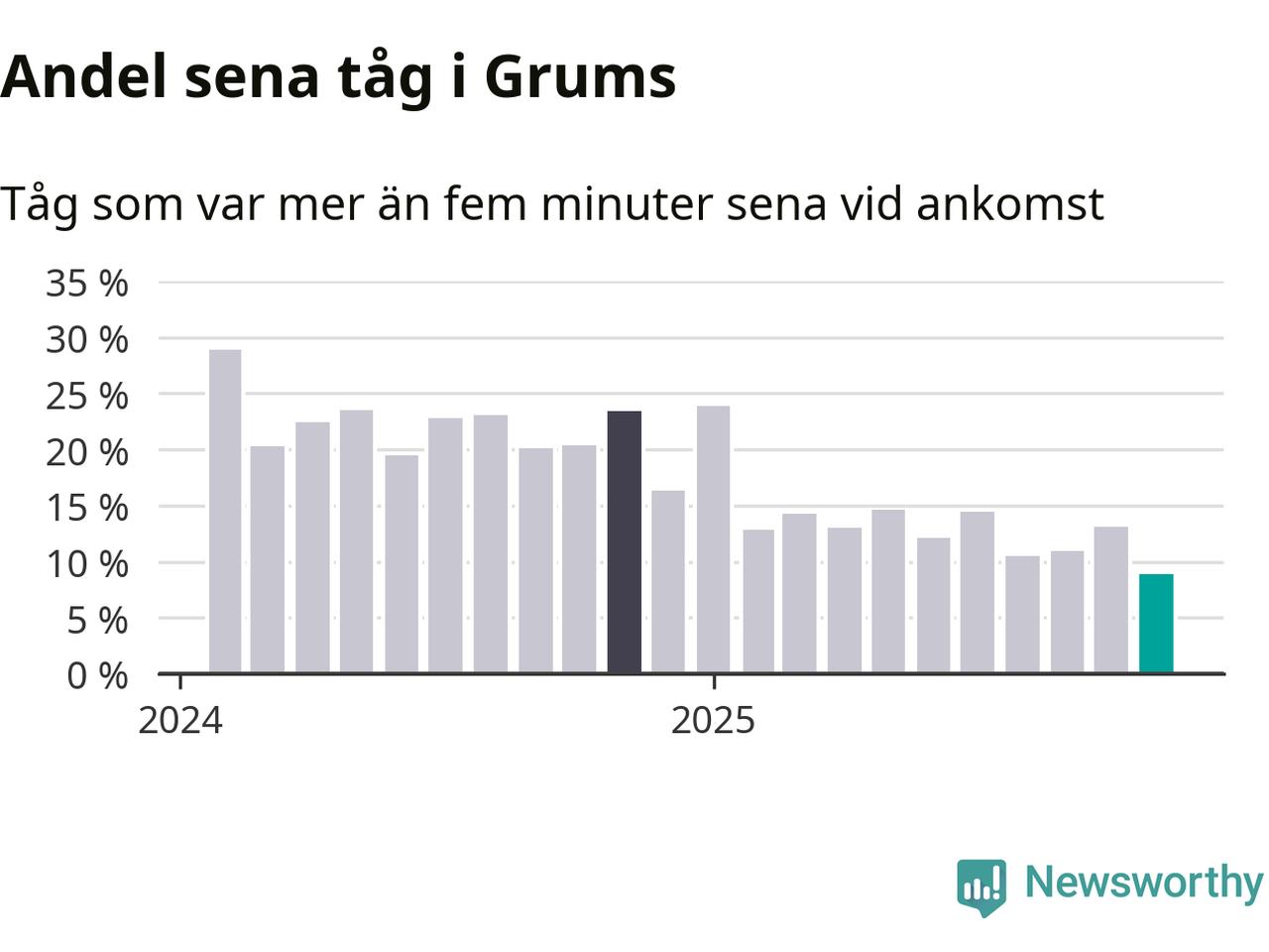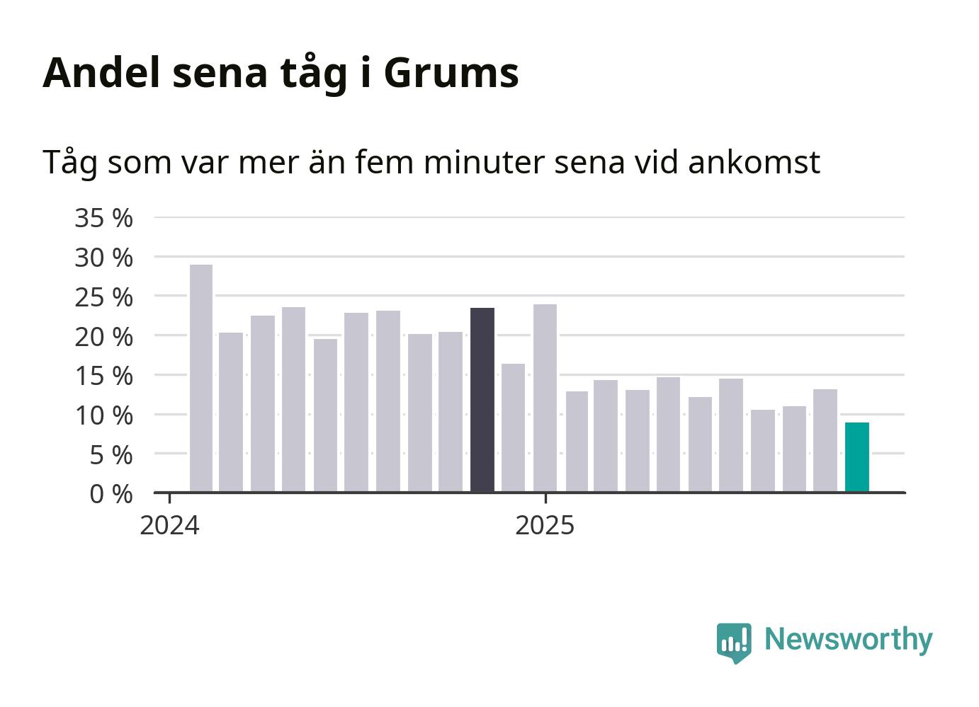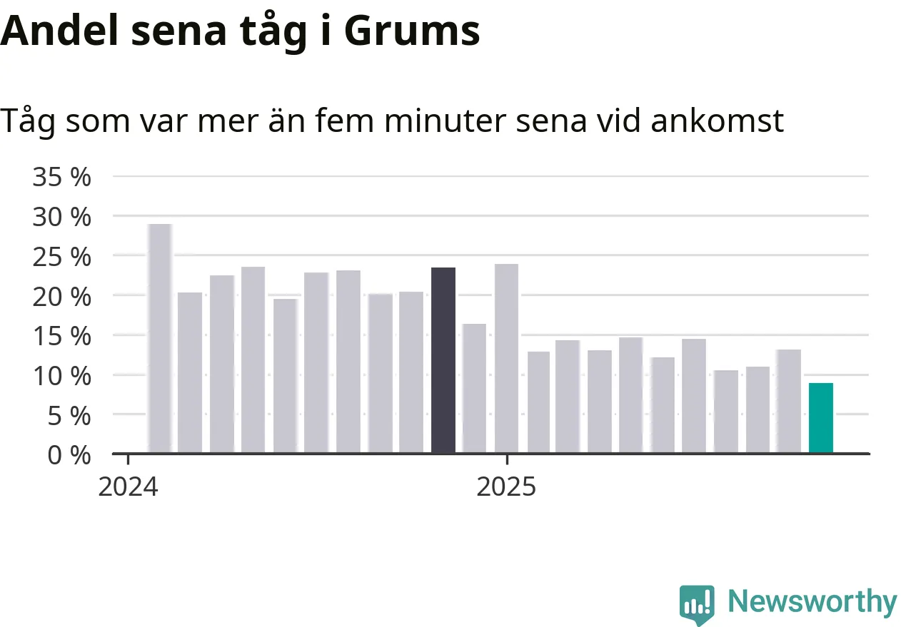 Nio procent är den lägsta andelen sena tåg sedan Newsworthy började mäta lokala förseningar i början av 2024. Siffrorna bygger på realtidsinformation om tågavgångar och ankomster från Trafikverket, som Newsworthy löpande samlar in.