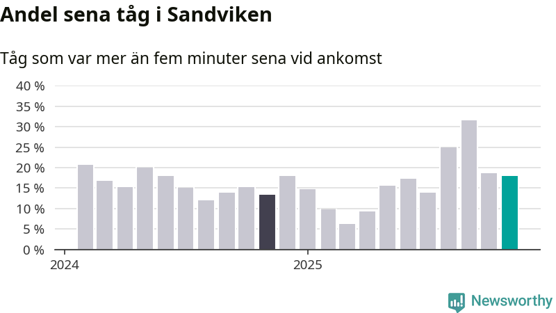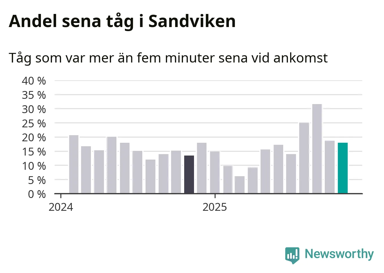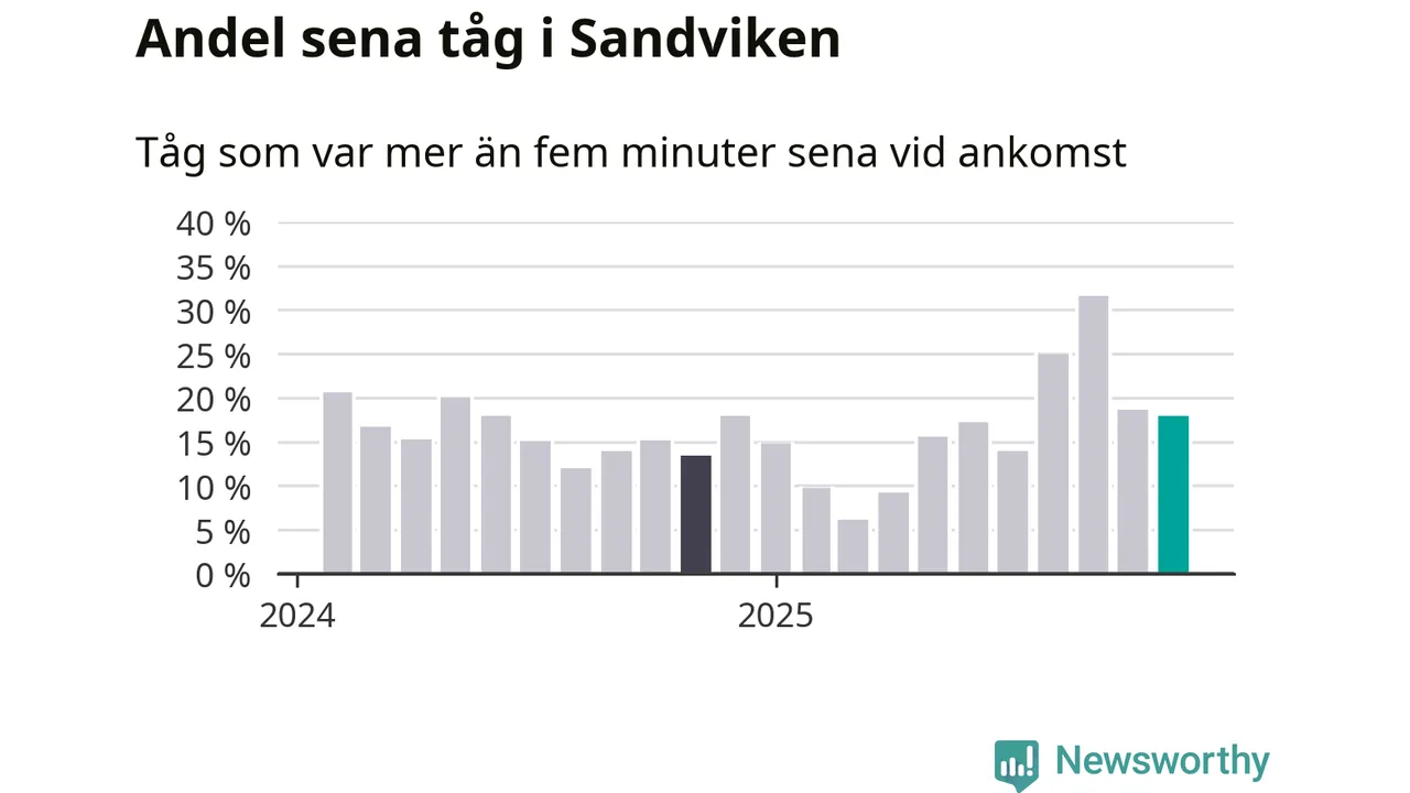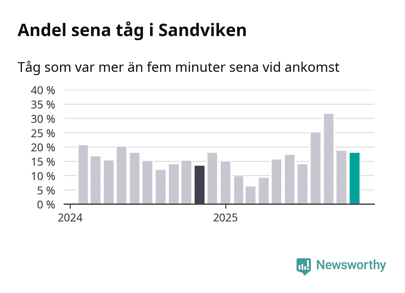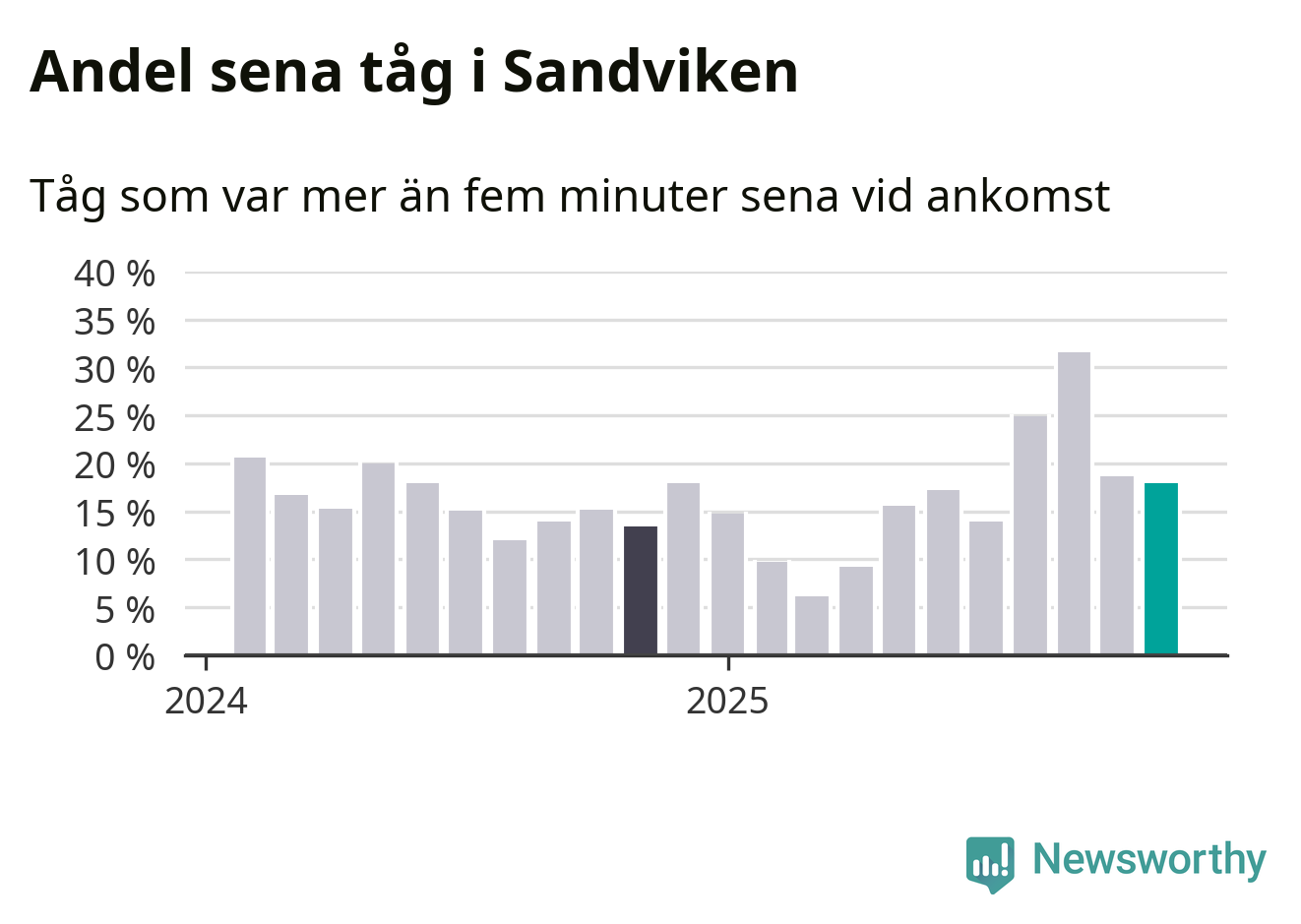 18 procent kan jämföras med 19 procent månaden innan, och 13 procent i november 2024. Siffrorna bygger på realtidsinformation om tågavgångar och ankomster från Trafikverket, som Newsworthy löpande samlar in.