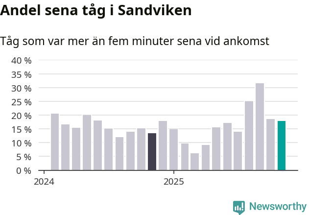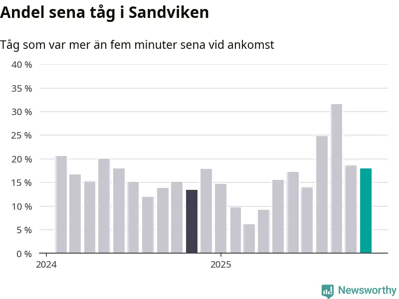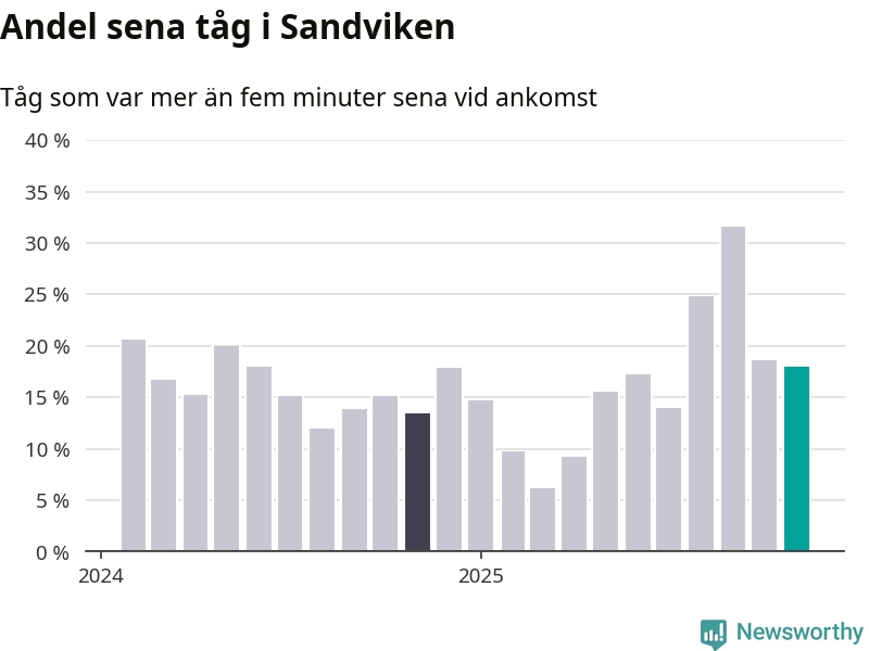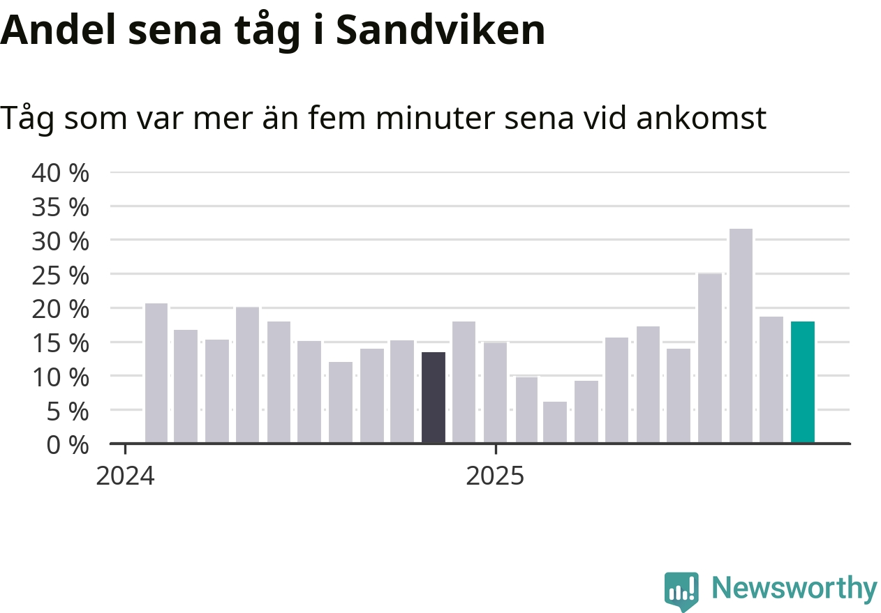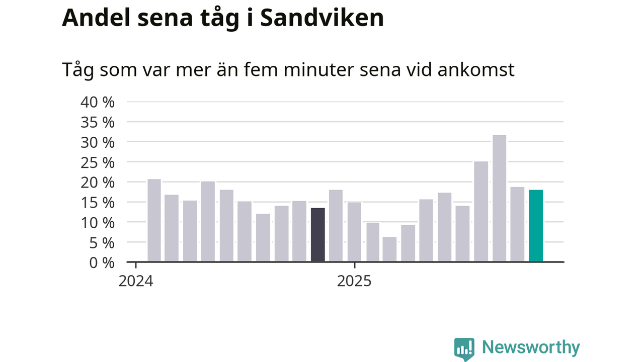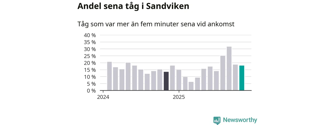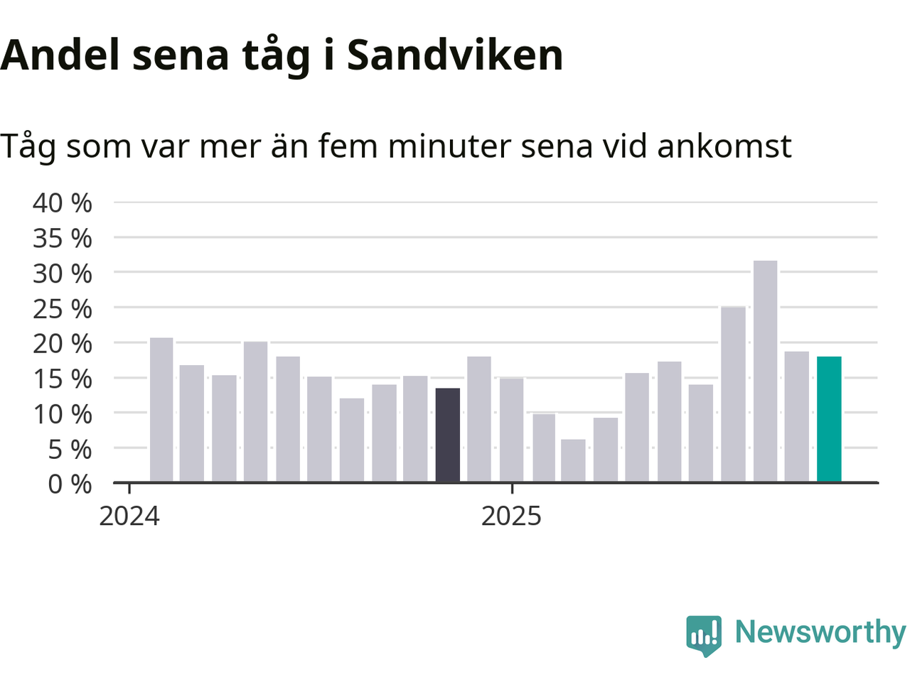 18 procent kan jämföras med 19 procent månaden innan, och 13 procent i november 2024. Siffrorna bygger på realtidsinformation om tågavgångar och ankomster från Trafikverket, som Newsworthy löpande samlar in.