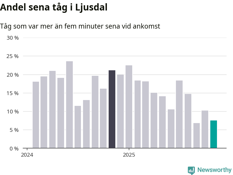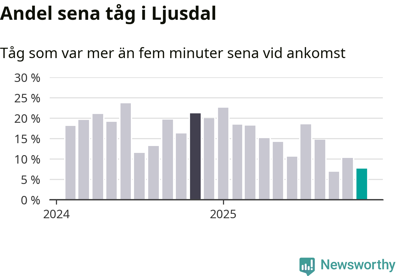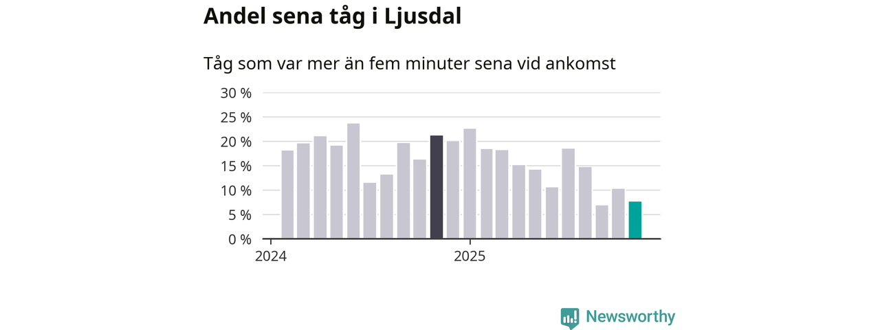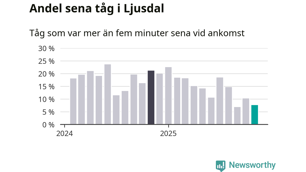 Åtta procent kan jämföras med tio procent månaden innan, och 21 procent i november 2024. Siffrorna bygger på realtidsinformation om tågavgångar och ankomster från Trafikverket, som Newsworthy löpande samlar in.