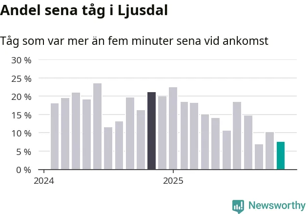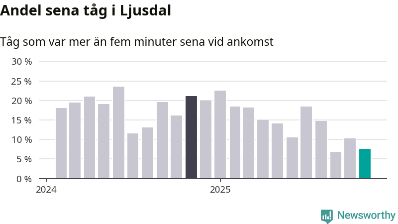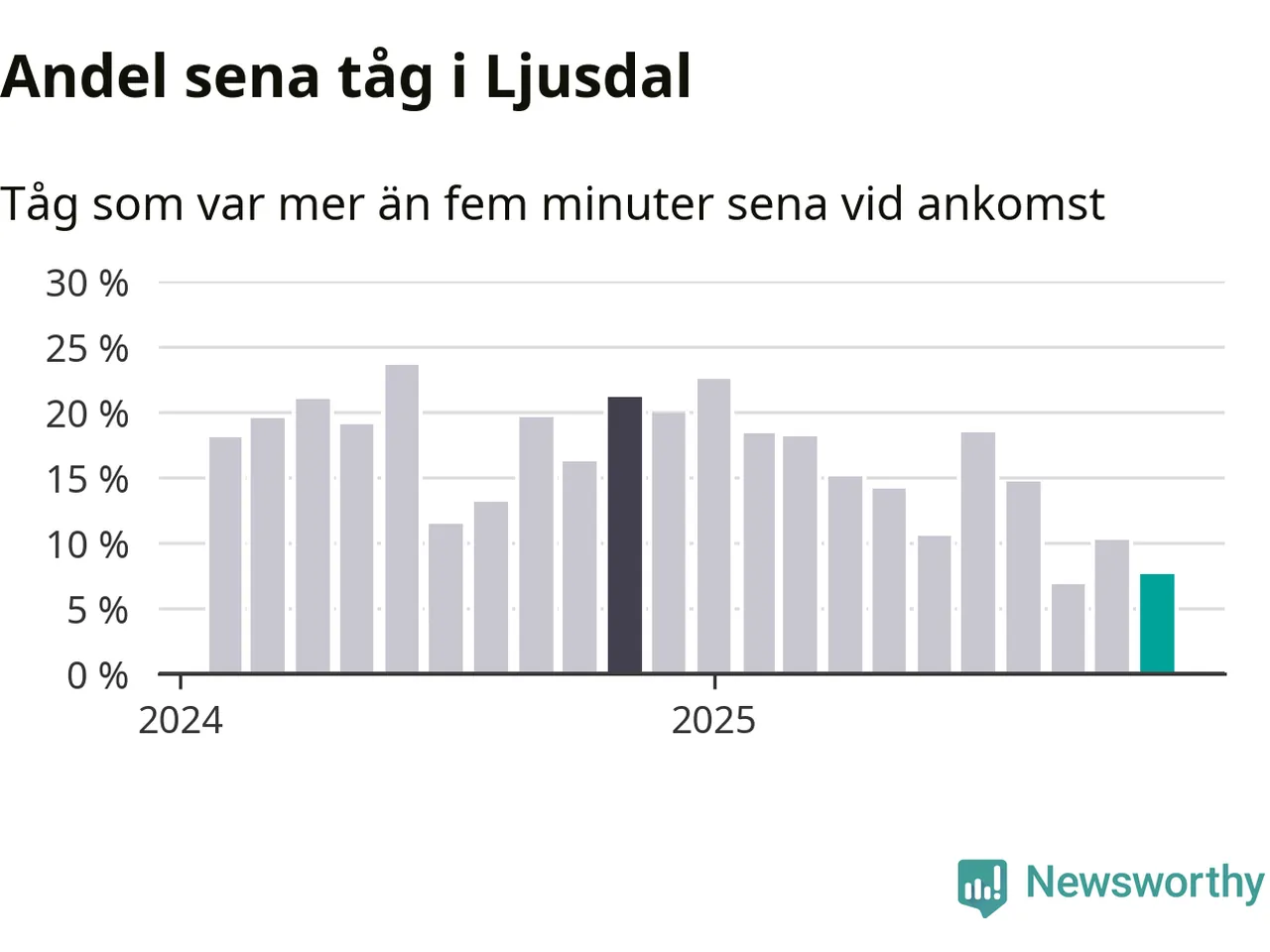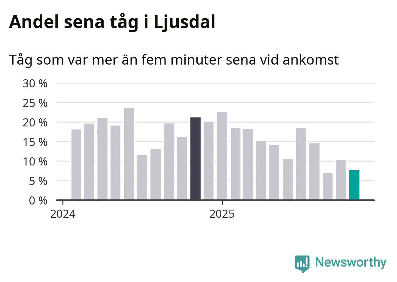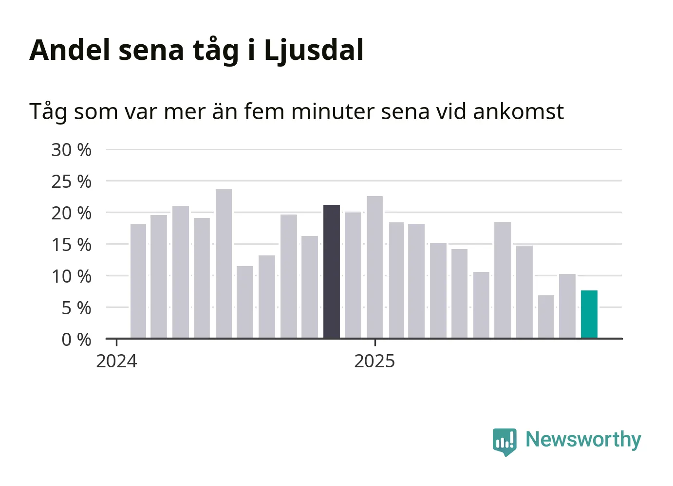 Åtta procent kan jämföras med tio procent månaden innan, och 21 procent i november 2024. Siffrorna bygger på realtidsinformation om tågavgångar och ankomster från Trafikverket, som Newsworthy löpande samlar in.