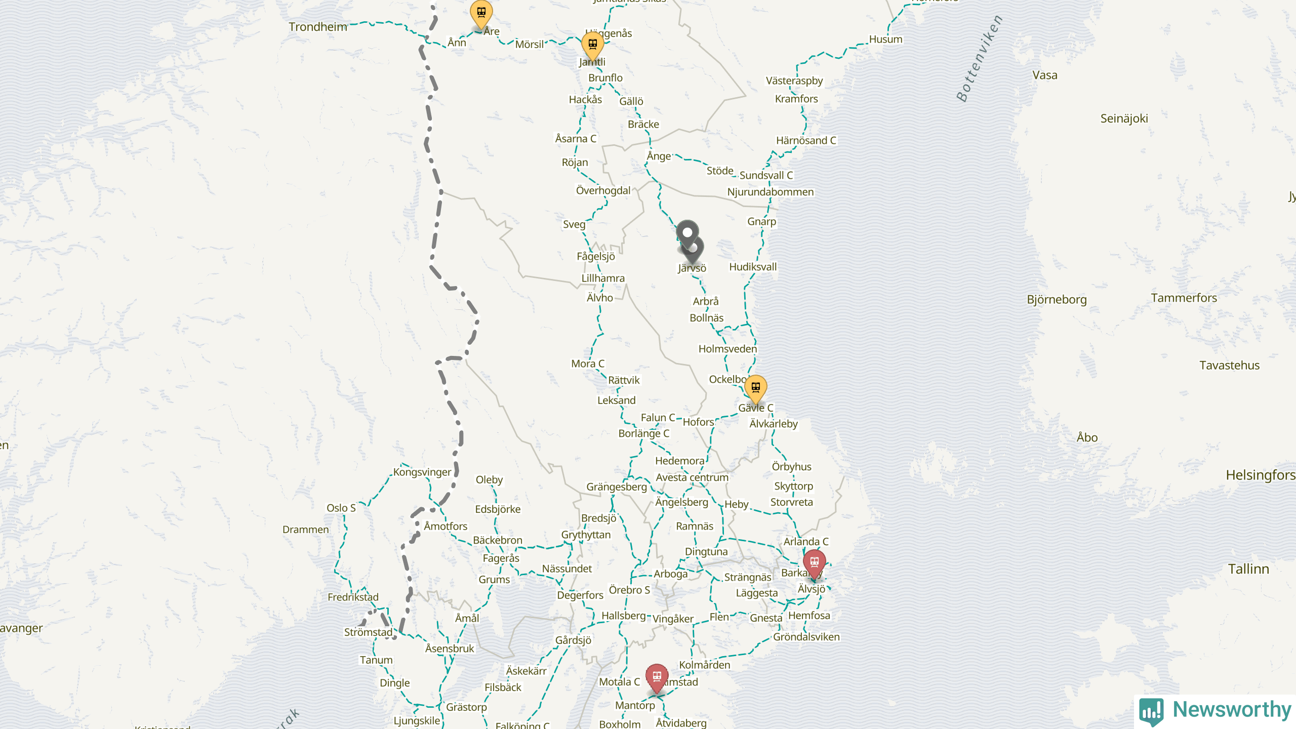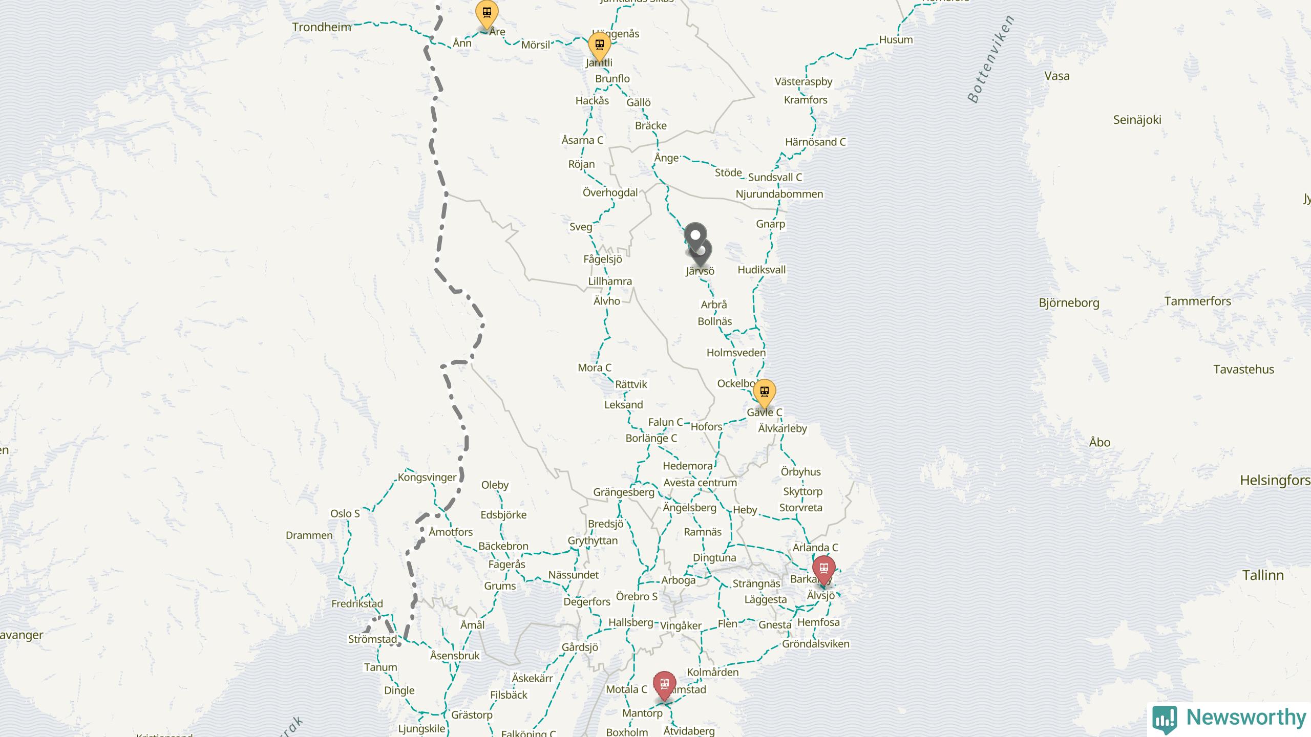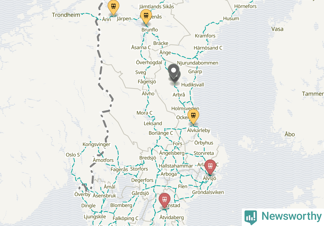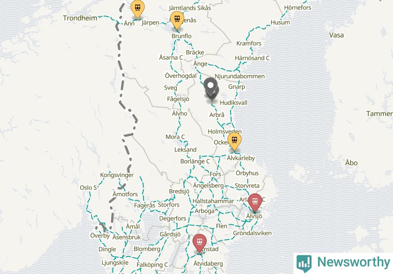 Kartdata från Mapbox, Newsworthy, OpenStreetMap och Trafikverket. Uppgifter om sträckor med passagerartrafik från jarnvag.net.