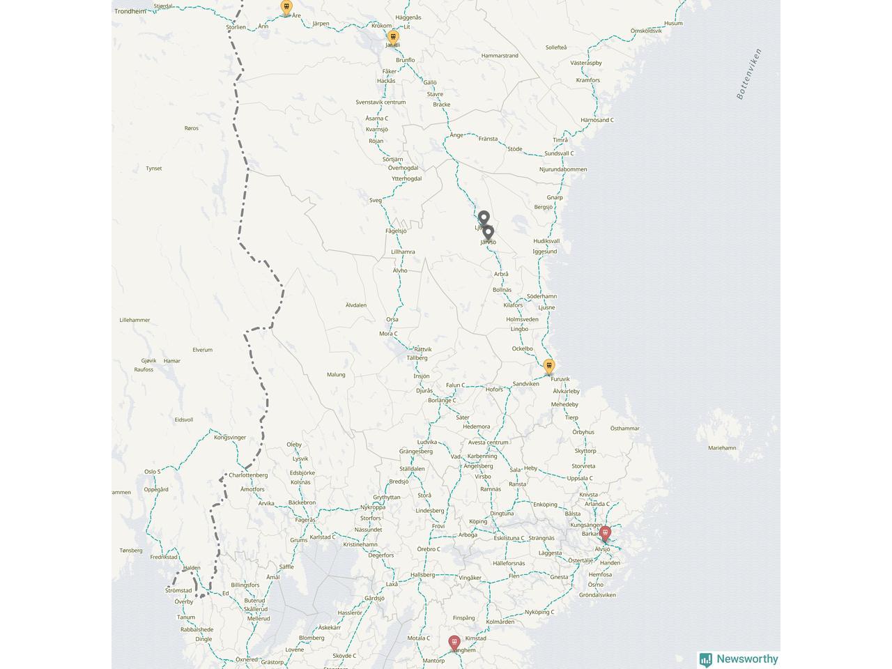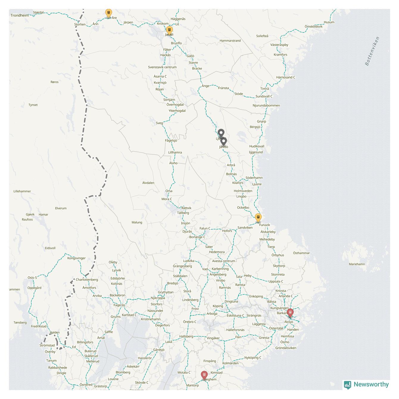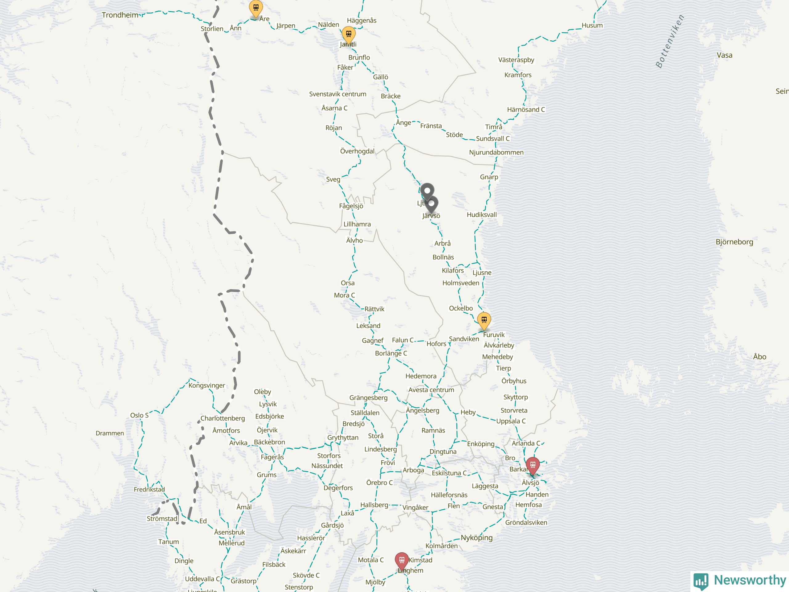 Kartdata från Mapbox, Newsworthy, OpenStreetMap och Trafikverket. Uppgifter om sträckor med passagerartrafik från jarnvag.net.