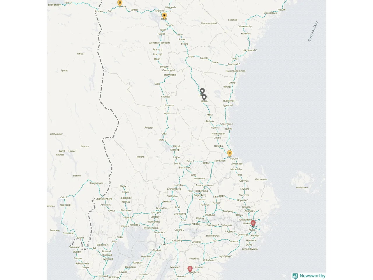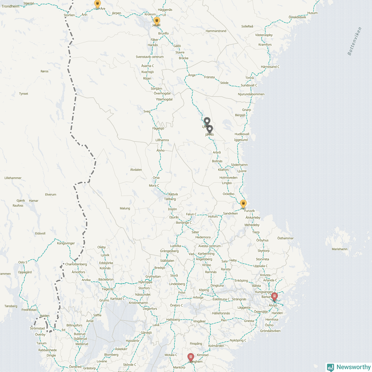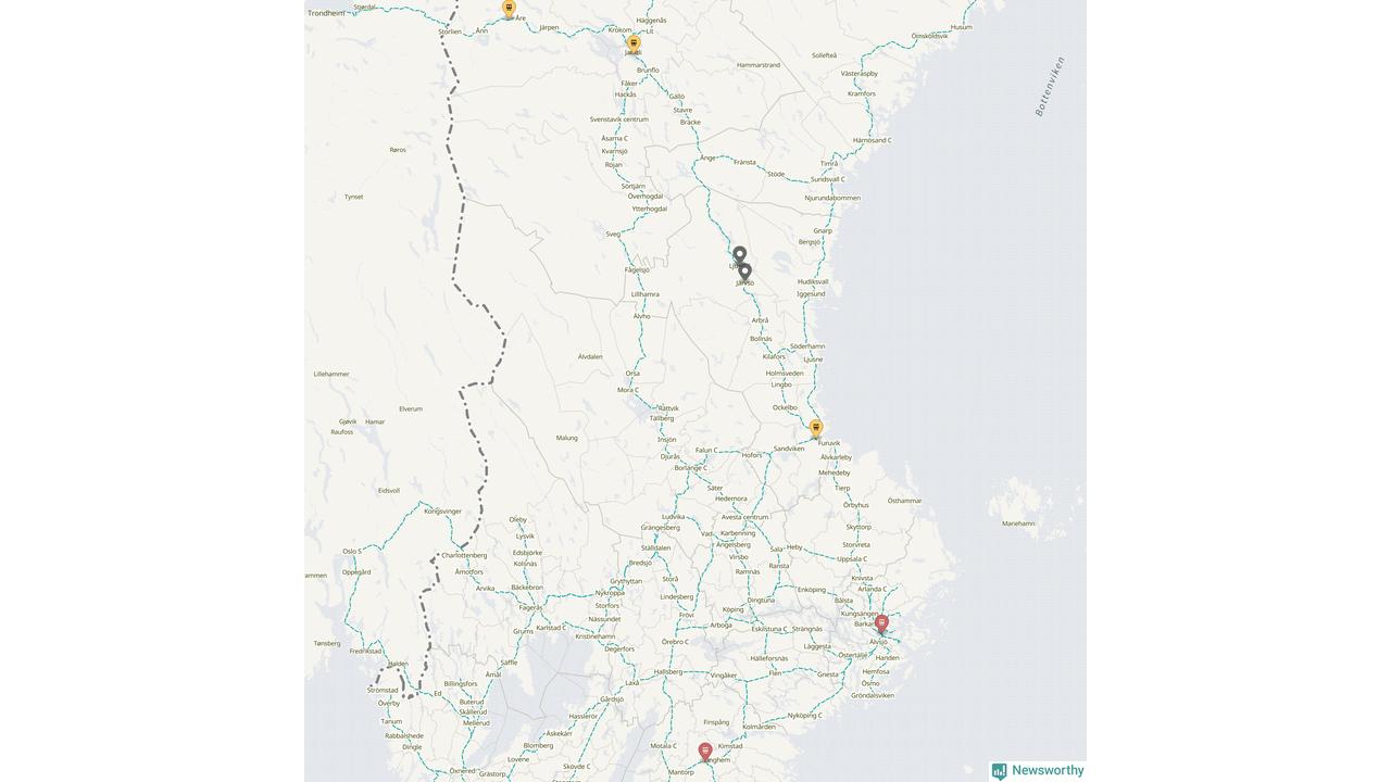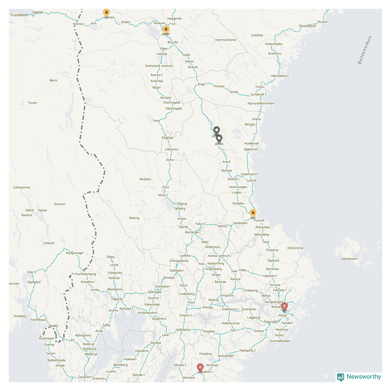 Kartdata från Mapbox, Newsworthy, OpenStreetMap och Trafikverket. Uppgifter om sträckor med passagerartrafik från jarnvag.net.