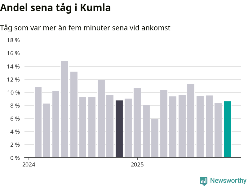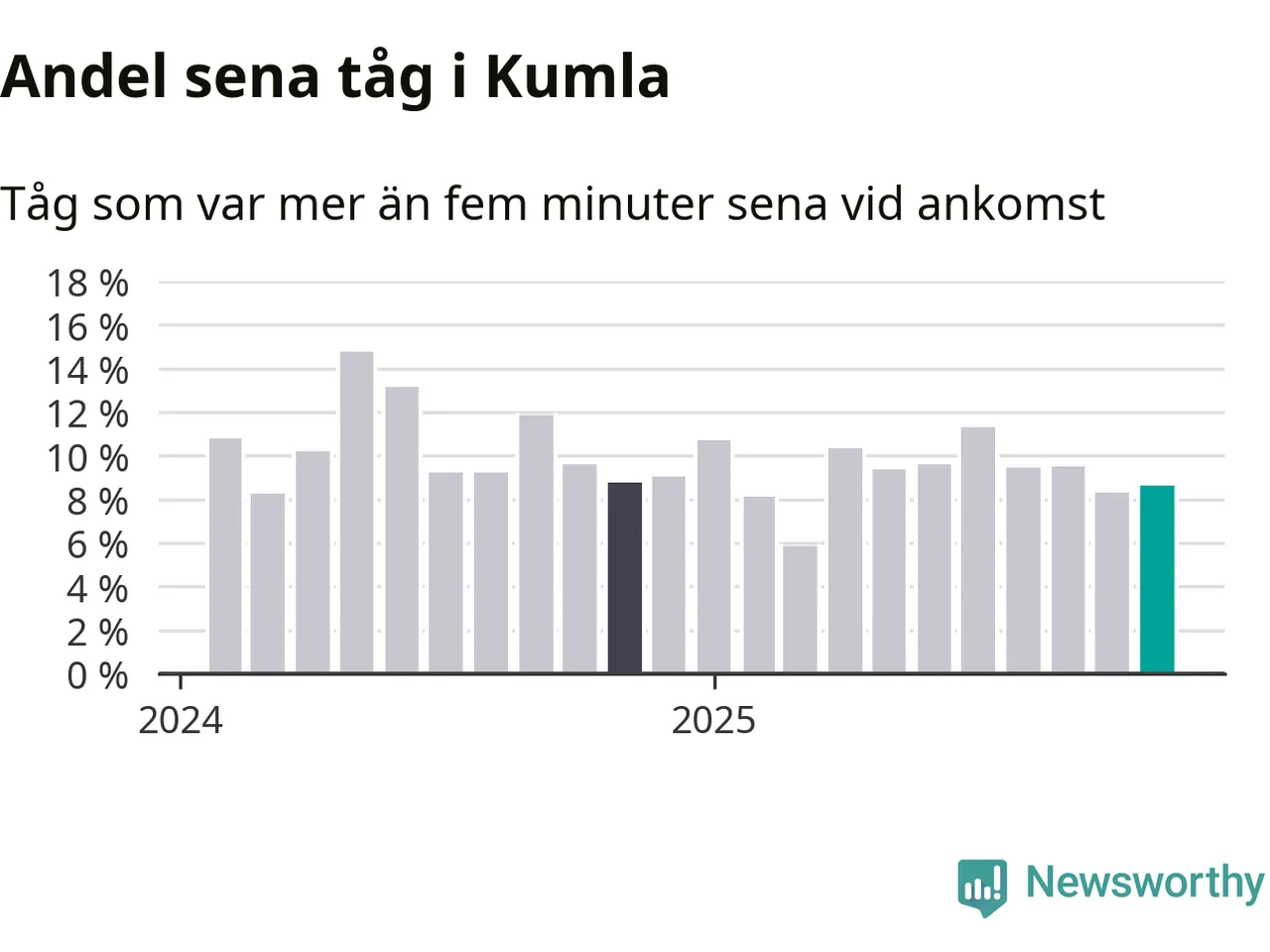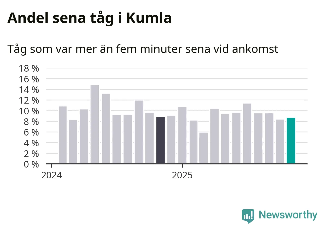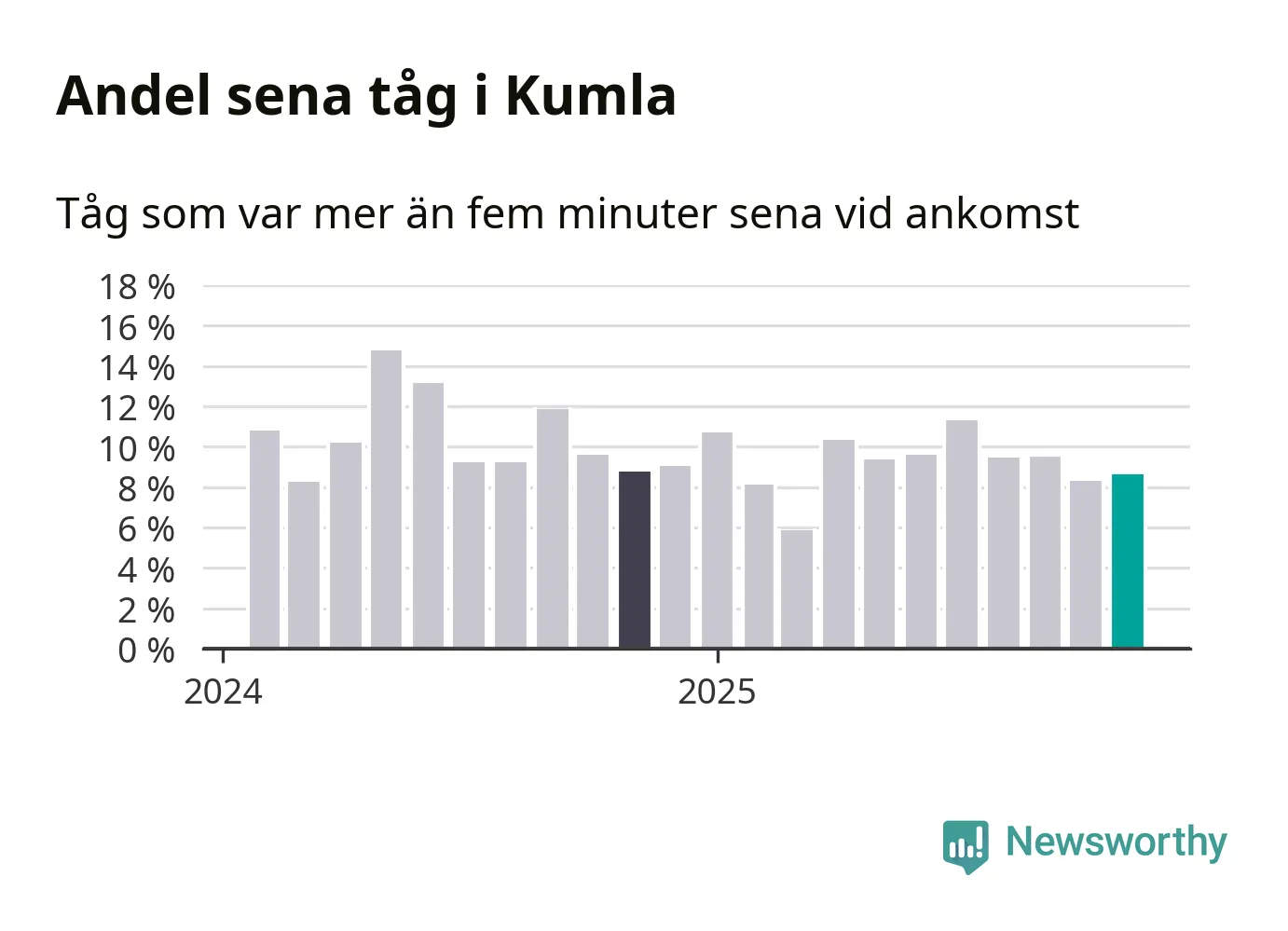 Nio procent kan jämföras med åtta procent månaden innan, och nio procent i november 2024. Siffrorna bygger på realtidsinformation om tågavgångar och ankomster från Trafikverket, som Newsworthy löpande samlar in.