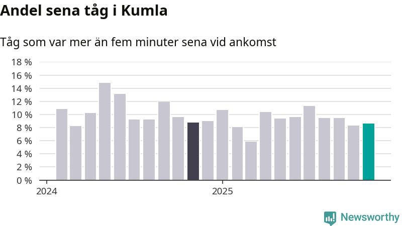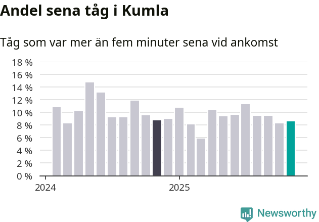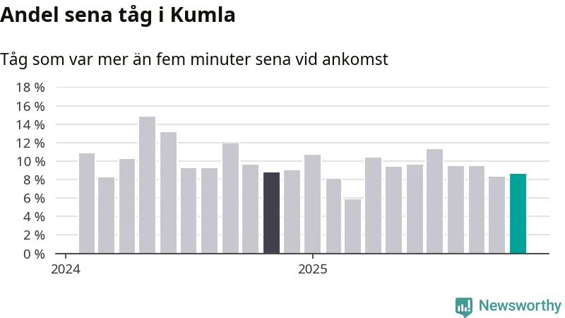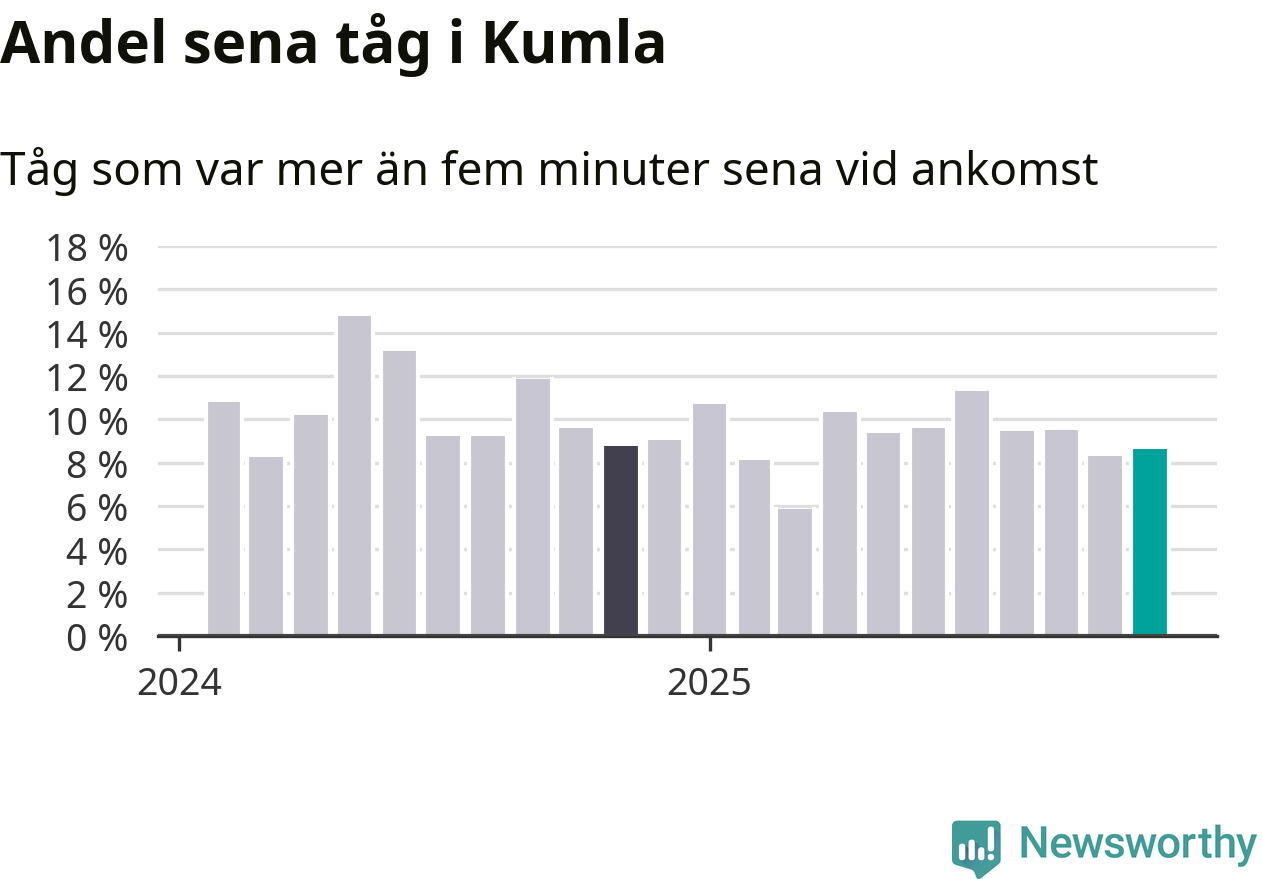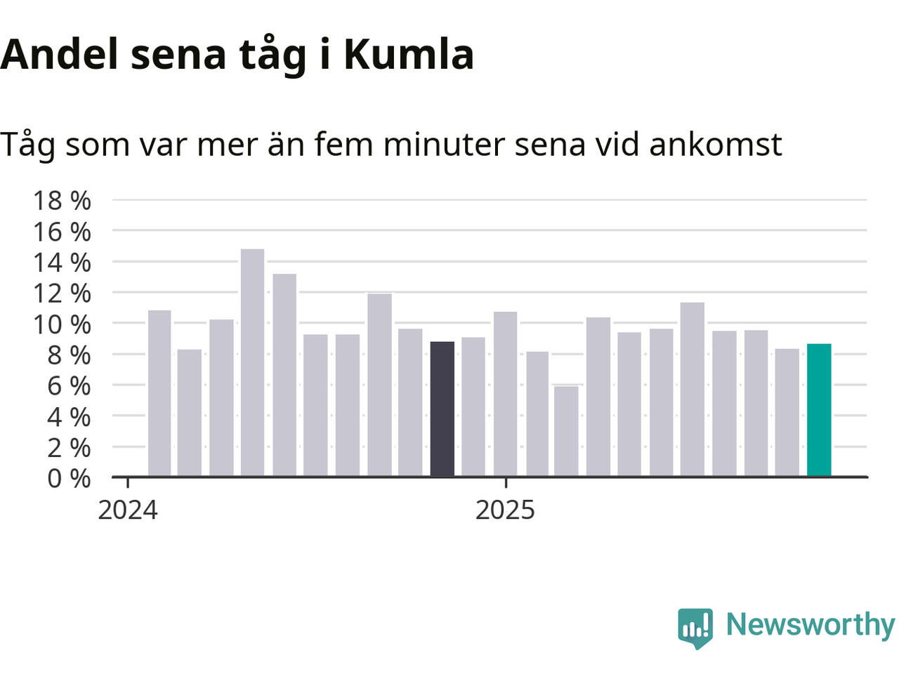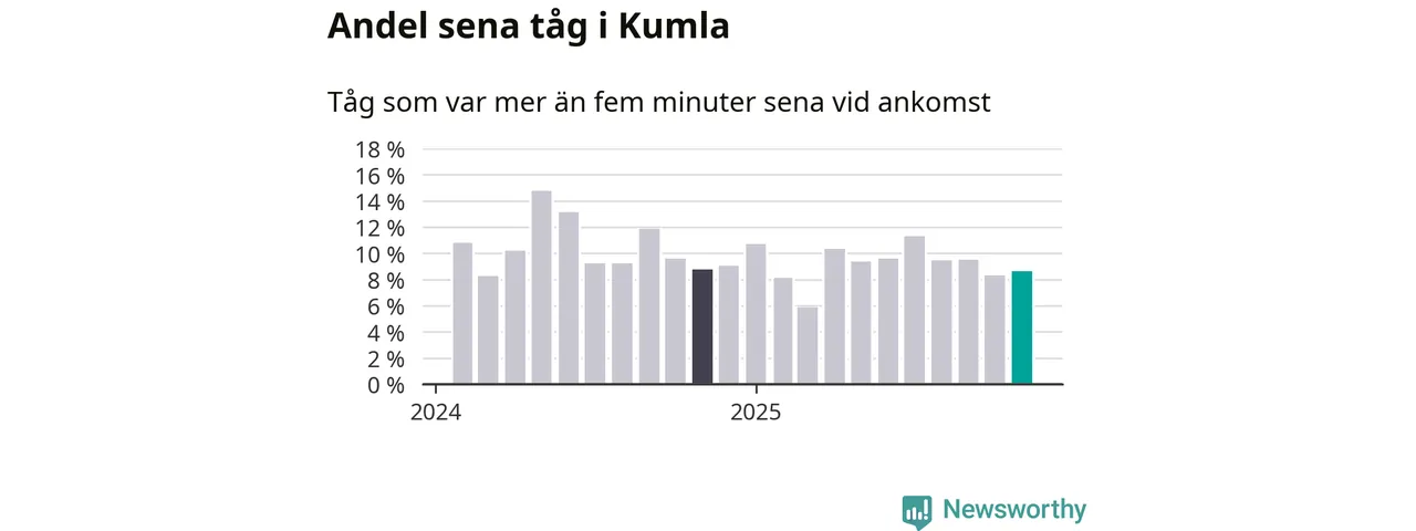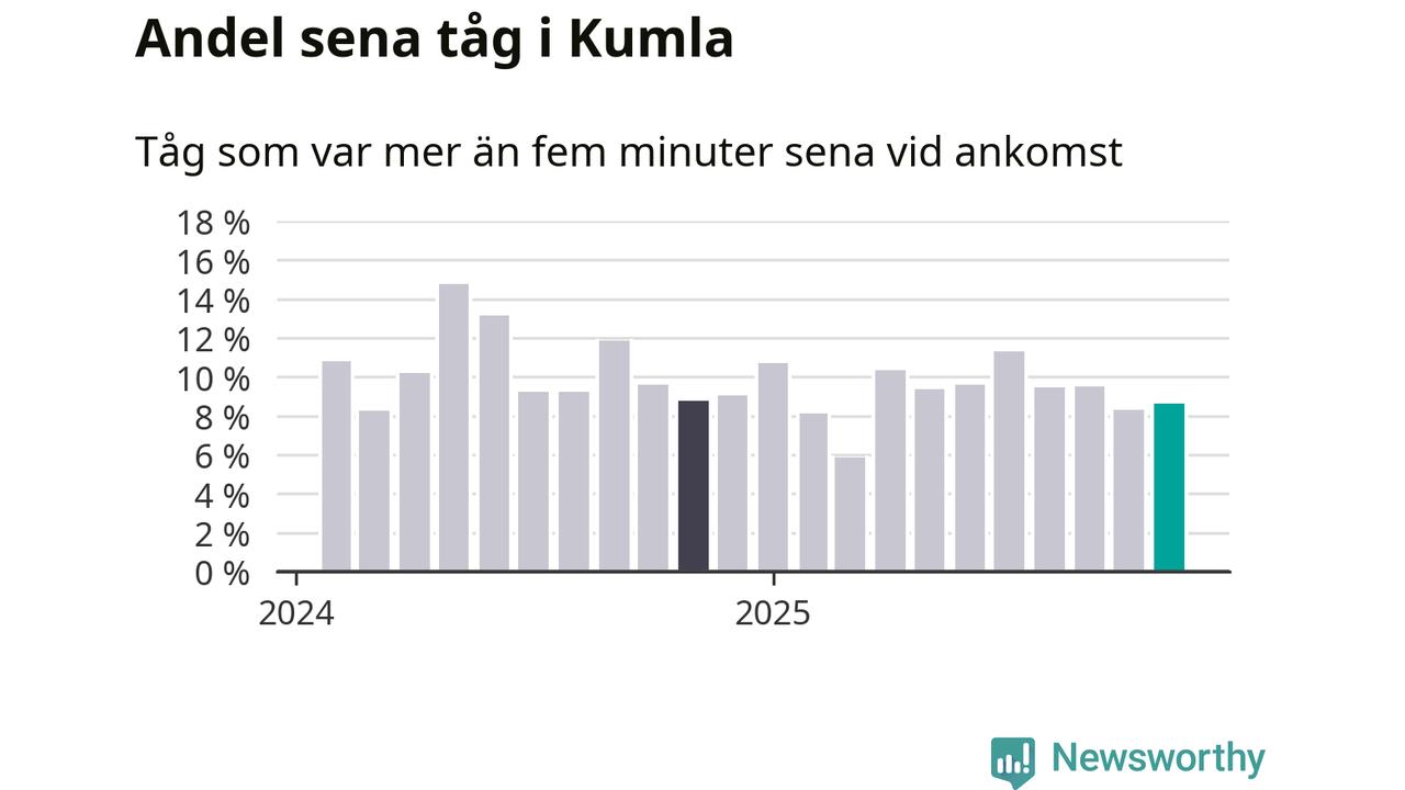 Nio procent kan jämföras med åtta procent månaden innan, och nio procent i november 2024. Siffrorna bygger på realtidsinformation om tågavgångar och ankomster från Trafikverket, som Newsworthy löpande samlar in.