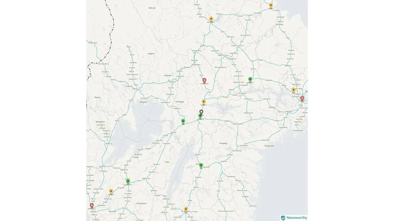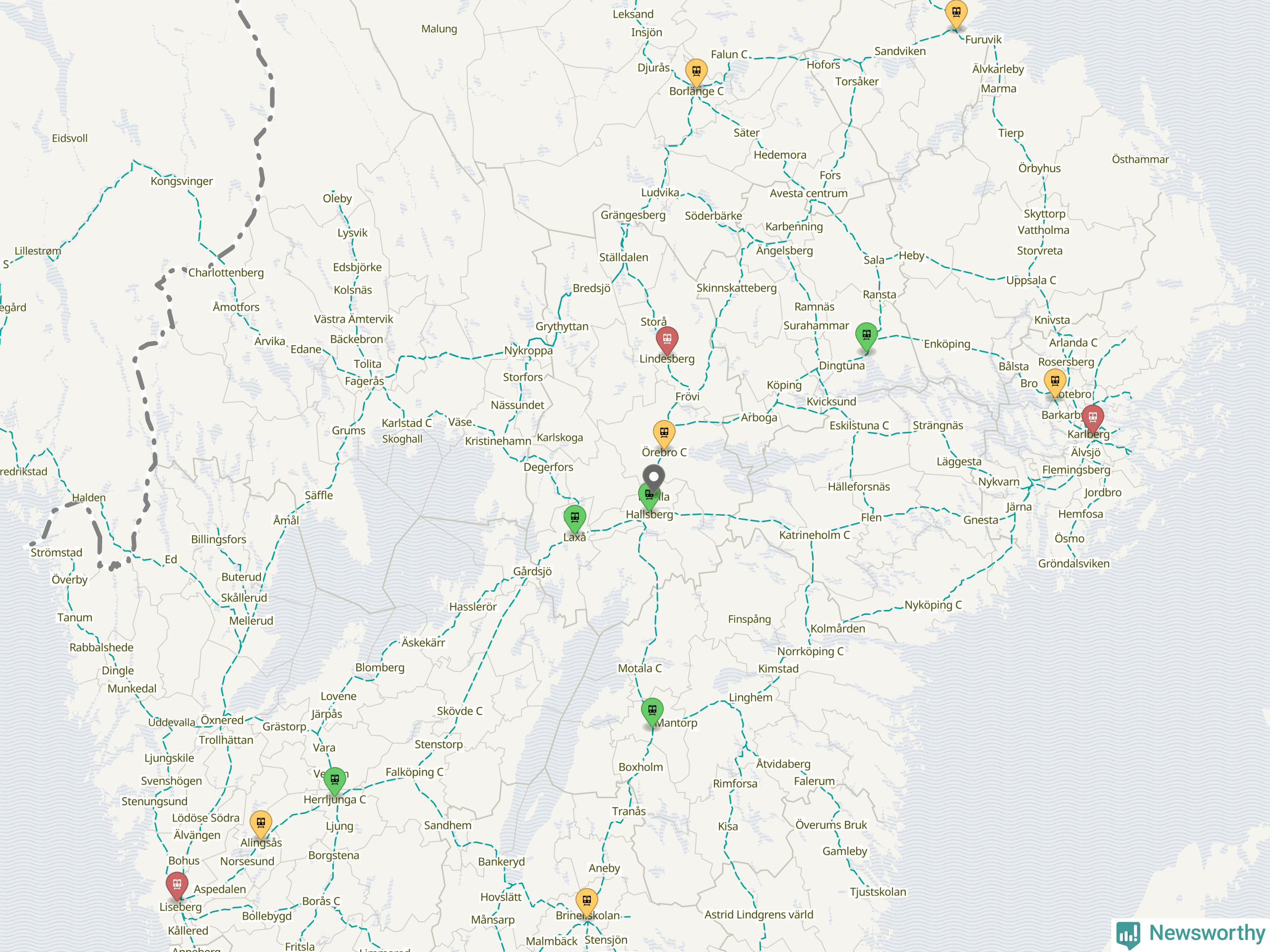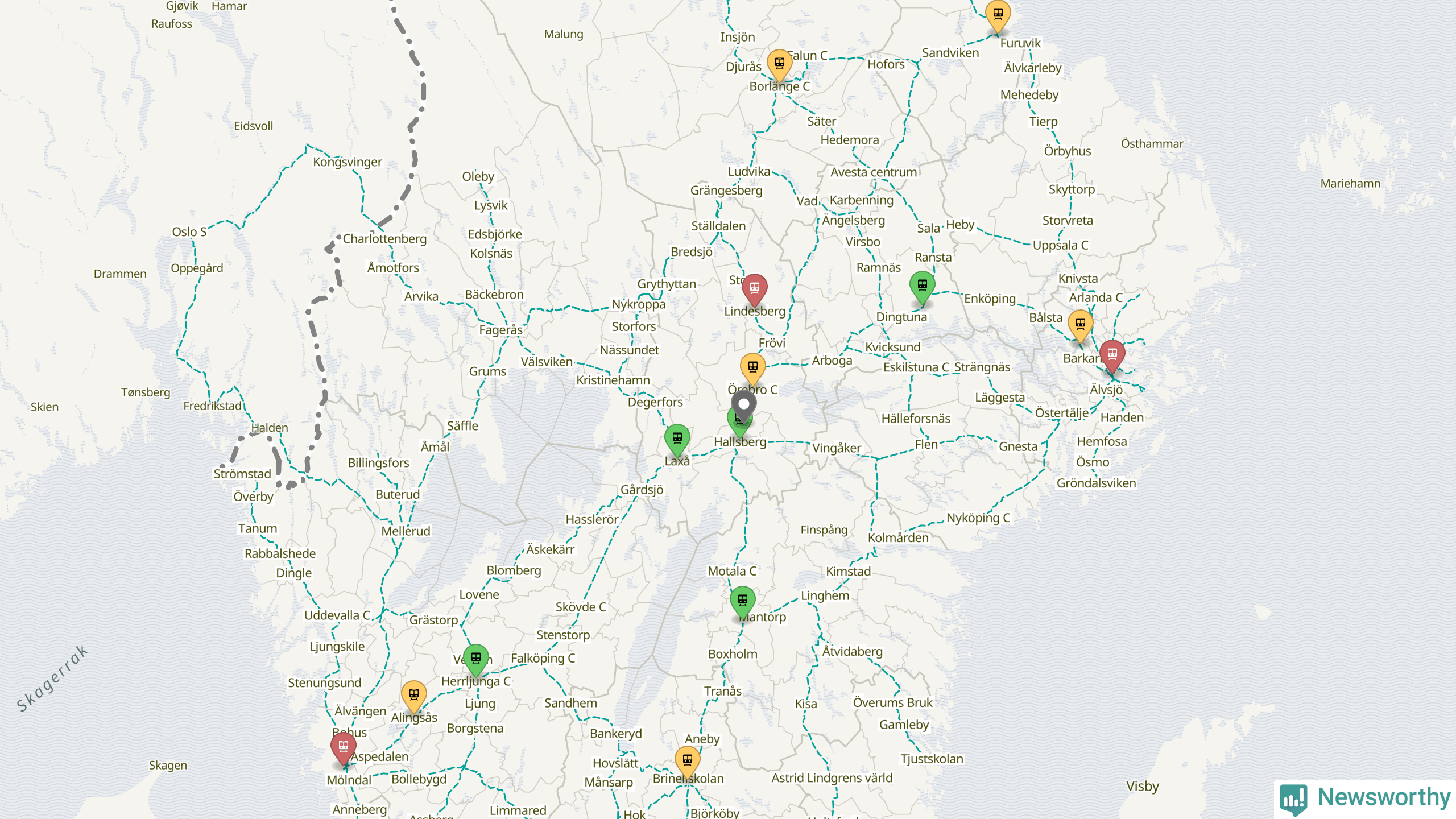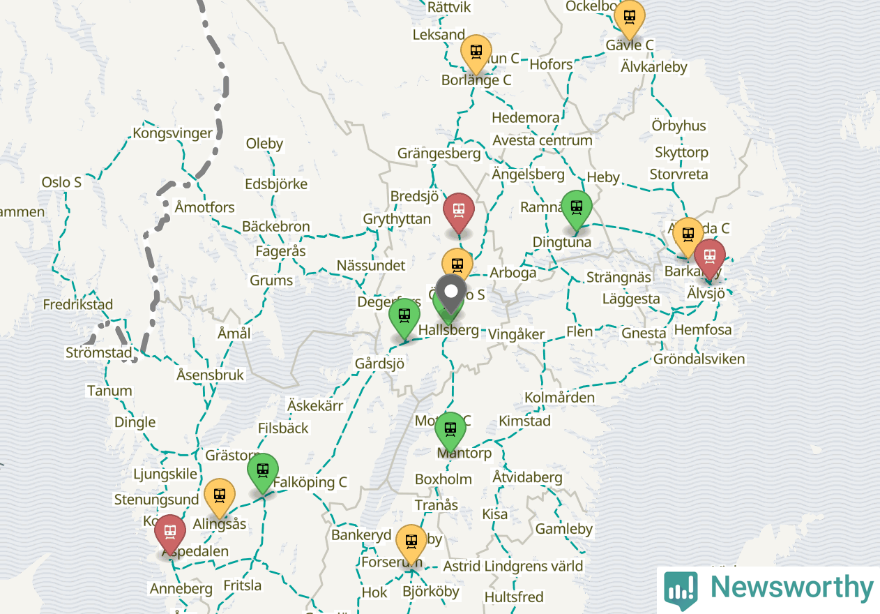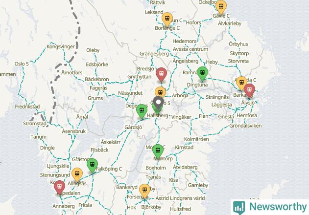 Kartdata från Mapbox, Newsworthy, OpenStreetMap och Trafikverket. Uppgifter om sträckor med passagerartrafik från jarnvag.net.