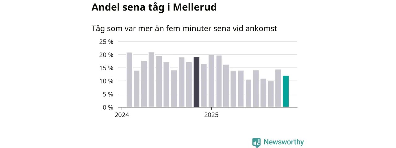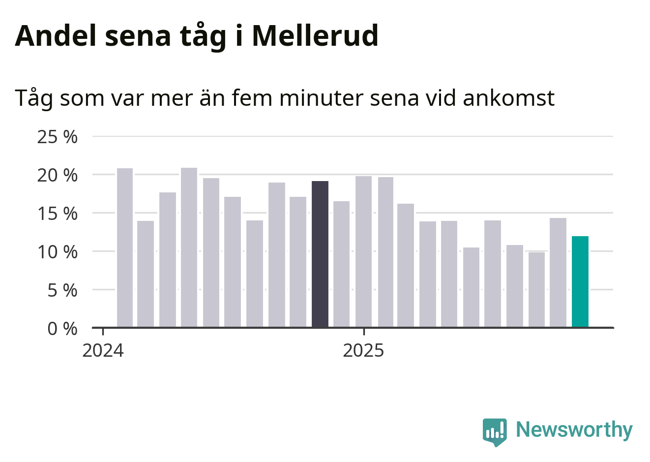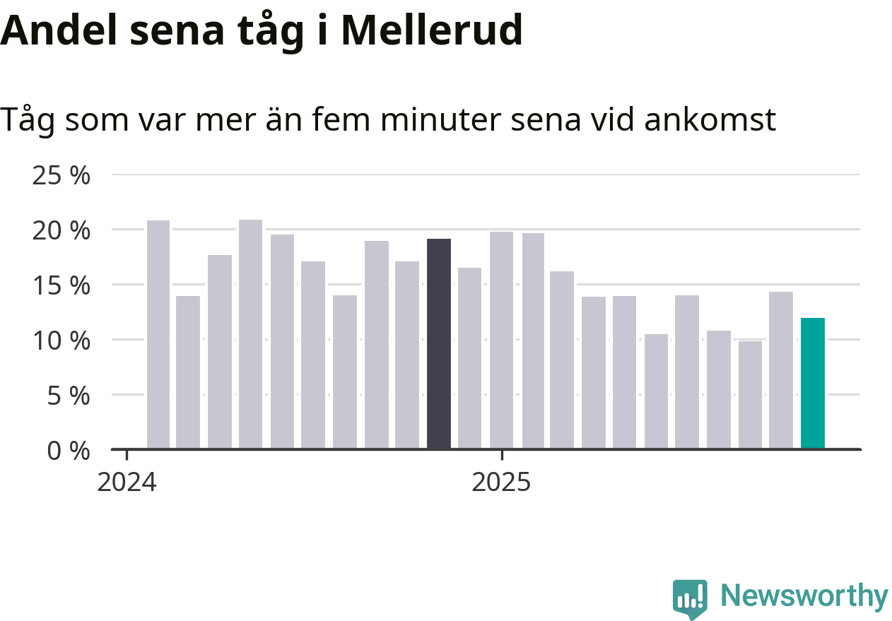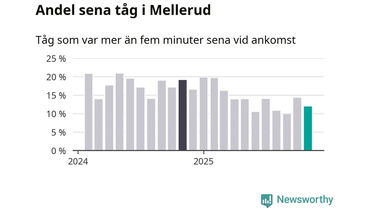 Tolv procent kan jämföras med 14 procent månaden innan, och 19 procent i november 2024. Siffrorna bygger på realtidsinformation om tågavgångar och ankomster från Trafikverket, som Newsworthy löpande samlar in.