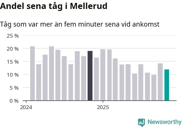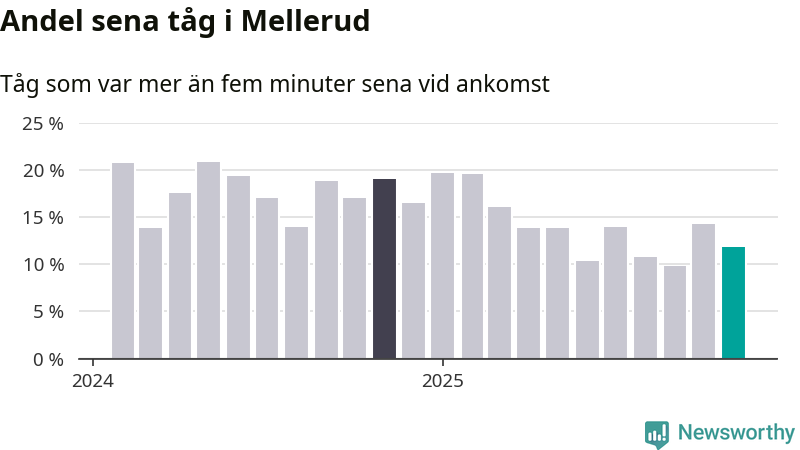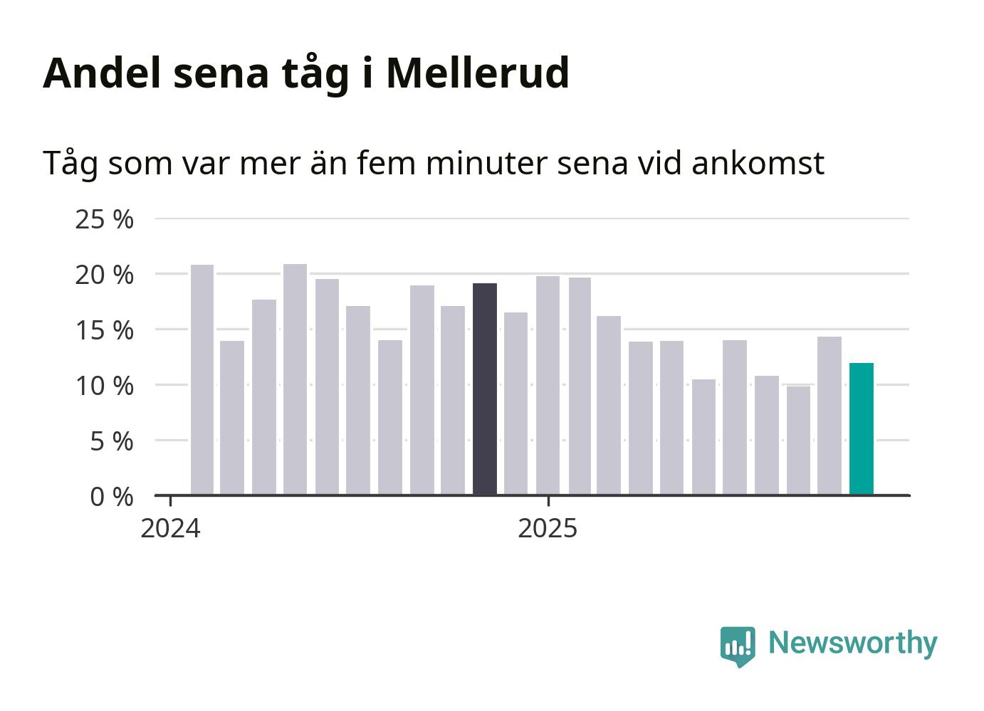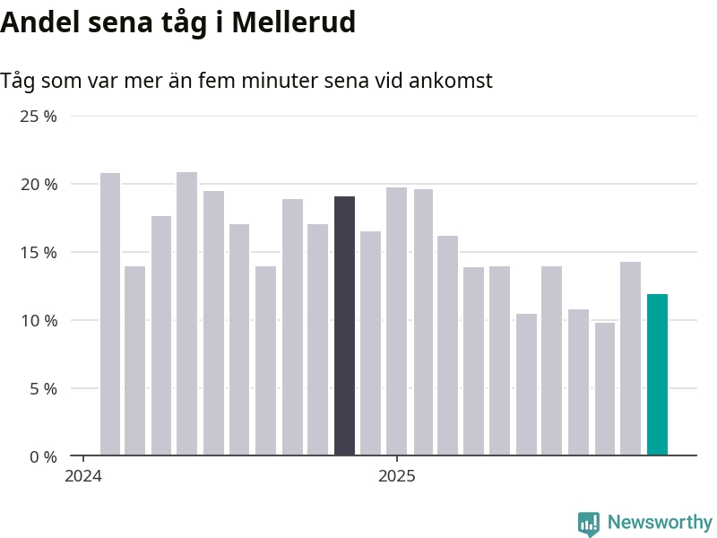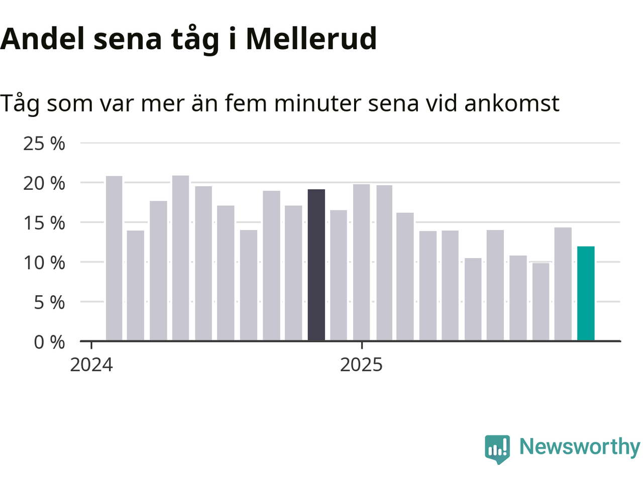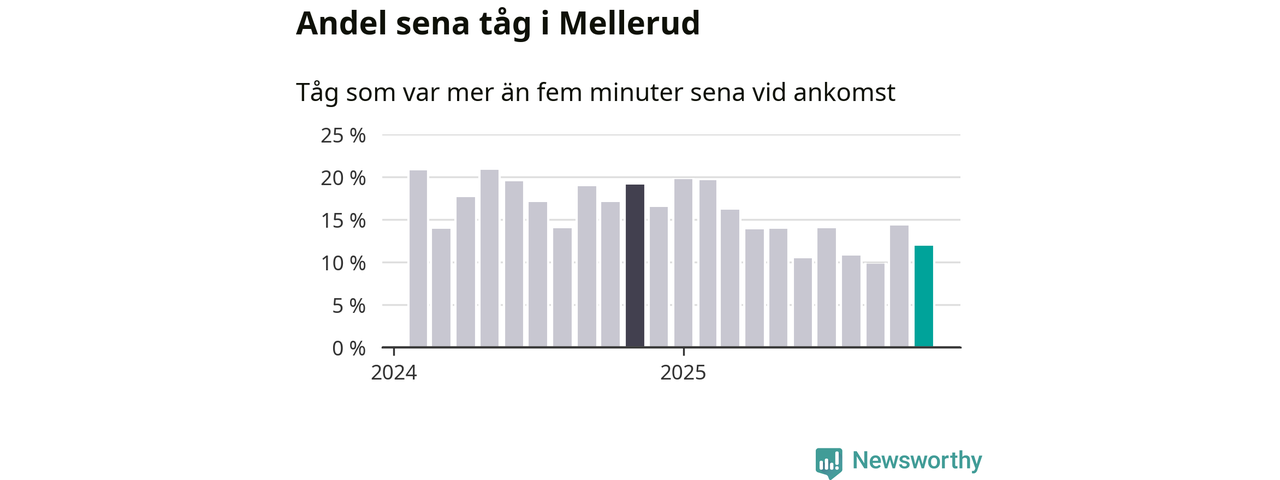 Tolv procent kan jämföras med 14 procent månaden innan, och 19 procent i november 2024. Siffrorna bygger på realtidsinformation om tågavgångar och ankomster från Trafikverket, som Newsworthy löpande samlar in.