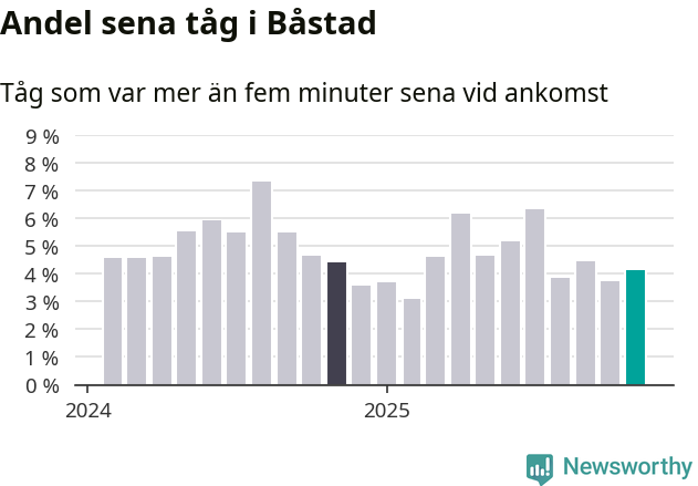 Fyra procent är marginellt mer än månaden innan, och kan jämföras med fyra procent i november 2024. Siffrorna bygger på realtidsinformation om tågavgångar och ankomster från Trafikverket, som Newsworthy löpande samlar in.