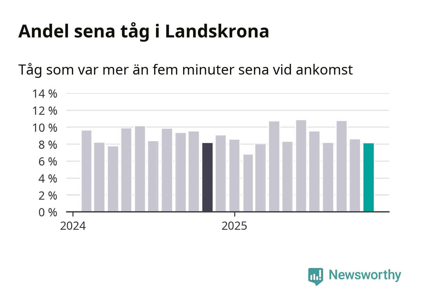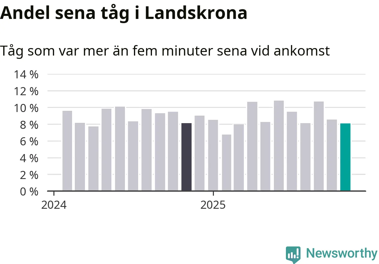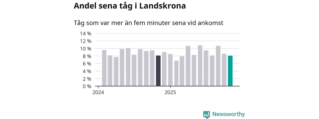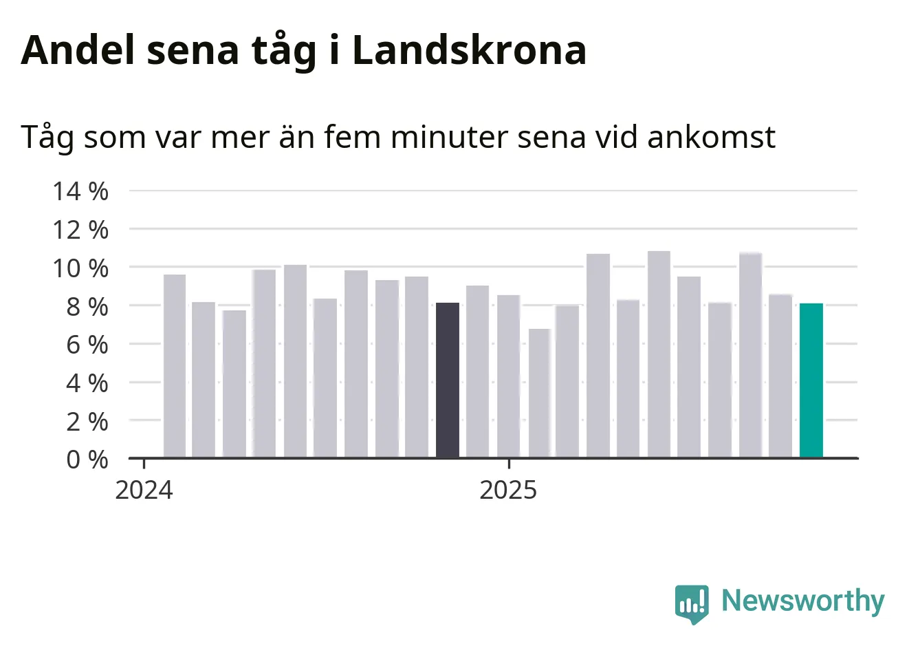 Åtta procent kan jämföras med nio procent månaden innan, och åtta procent i november 2024. Siffrorna bygger på realtidsinformation om tågavgångar och ankomster från Trafikverket, som Newsworthy löpande samlar in.