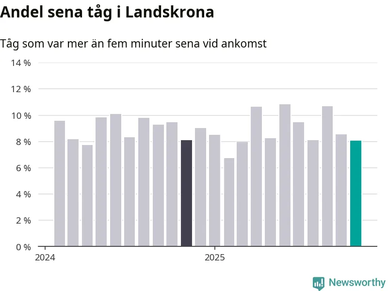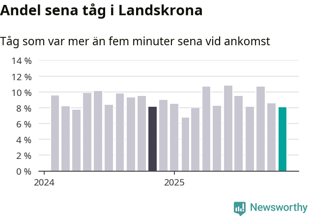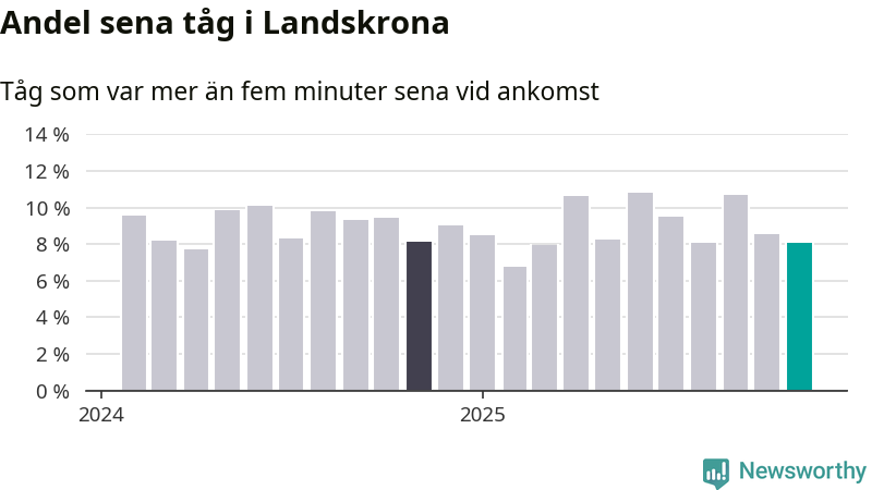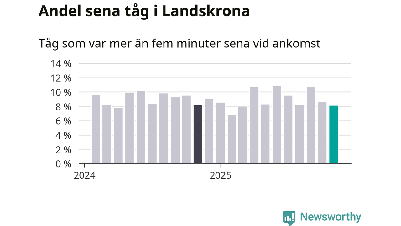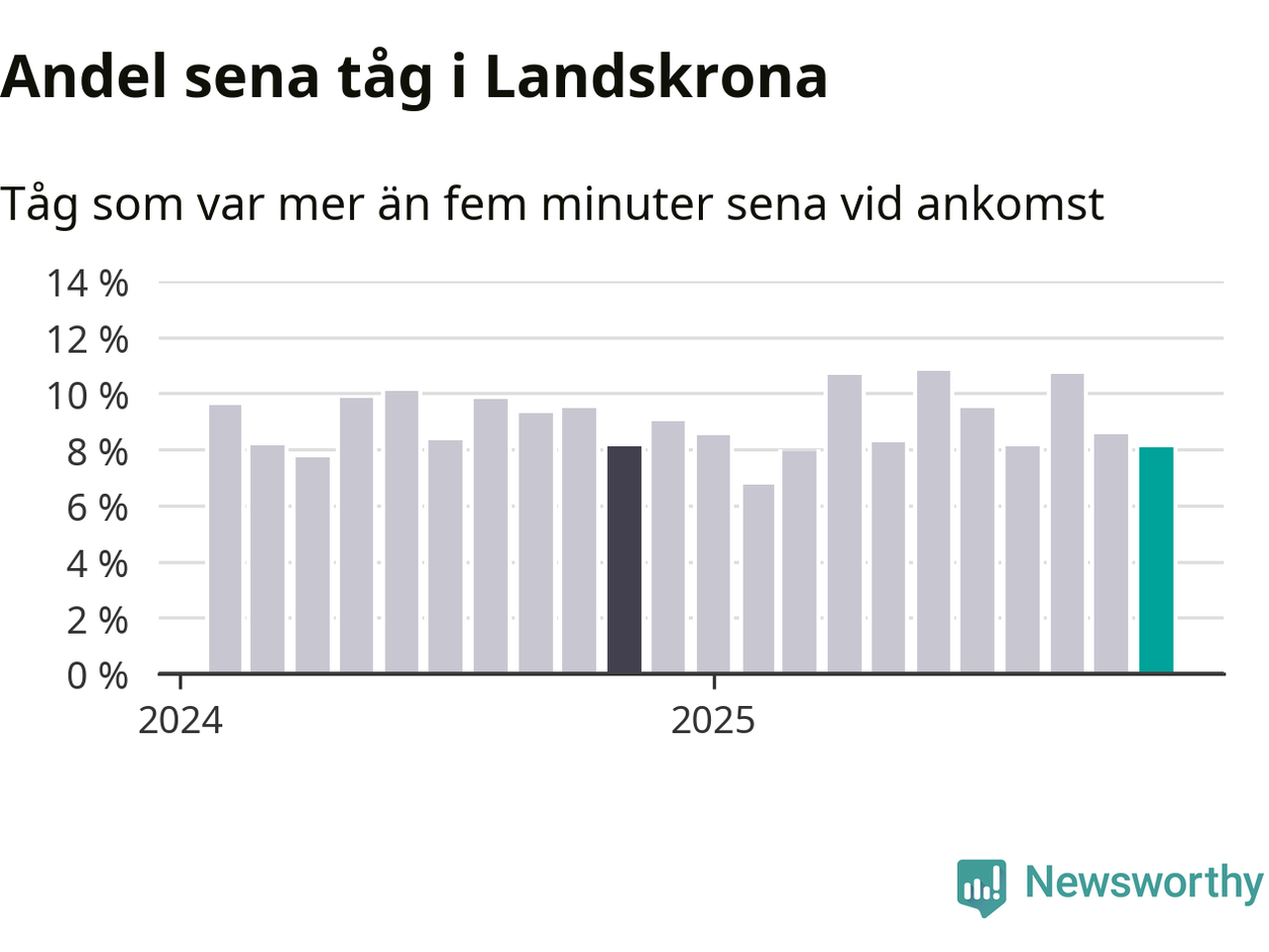 Åtta procent kan jämföras med nio procent månaden innan, och åtta procent i november 2024. Siffrorna bygger på realtidsinformation om tågavgångar och ankomster från Trafikverket, som Newsworthy löpande samlar in.
