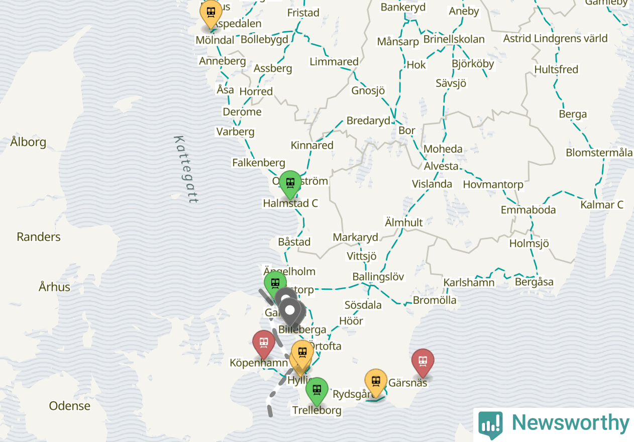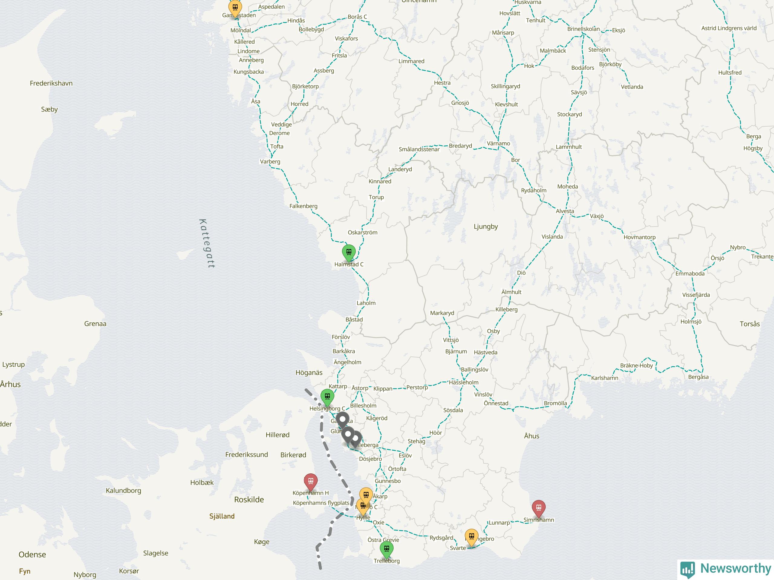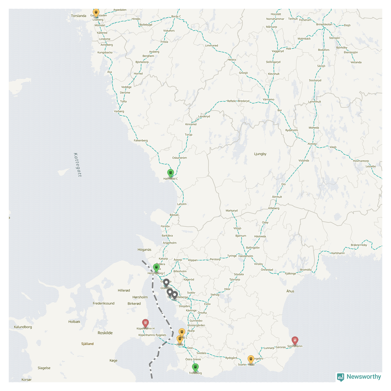 Kartdata från Mapbox, Newsworthy, OpenStreetMap och Trafikverket. Uppgifter om sträckor med passagerartrafik från jarnvag.net.