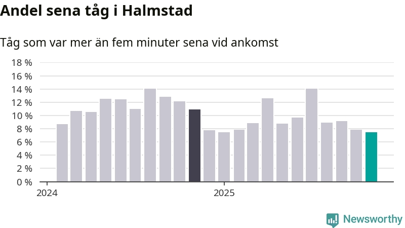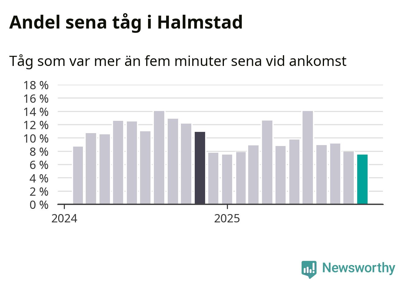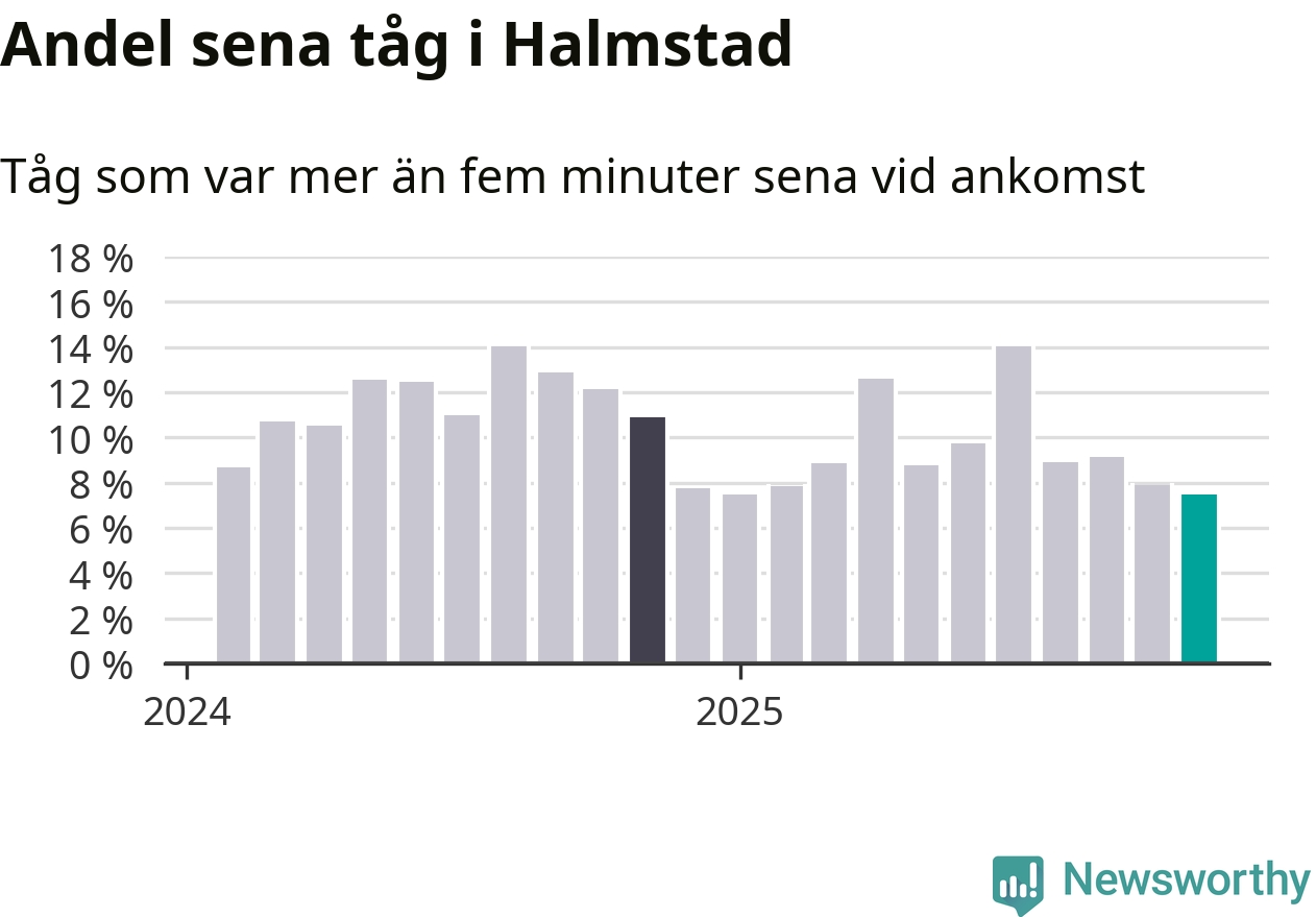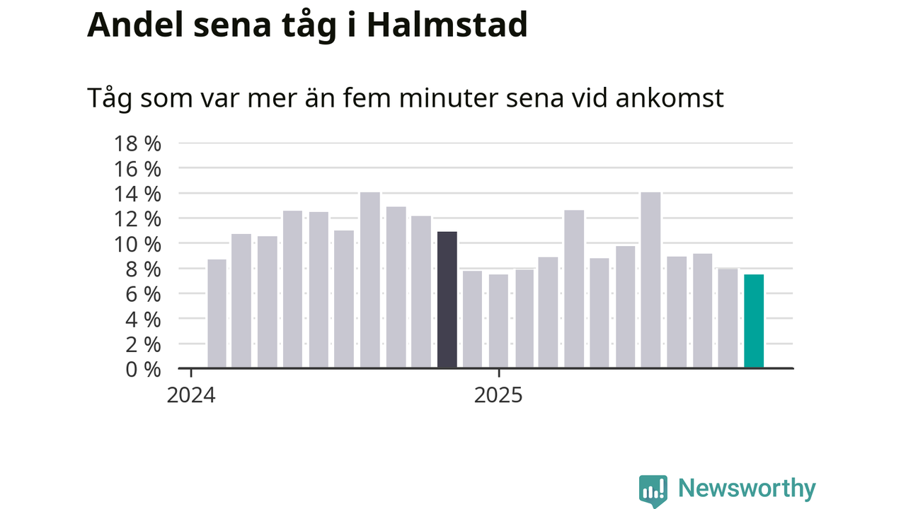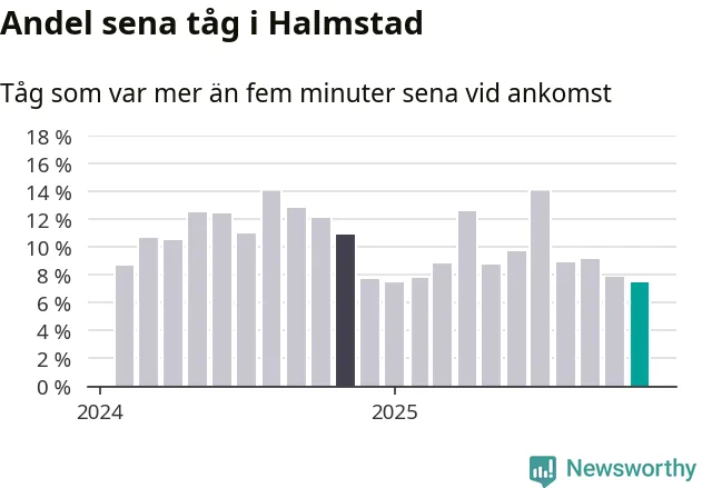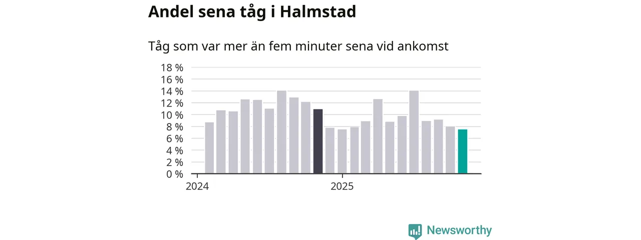 Sju procent är den lägsta andelen sena tåg sedan Newsworthy började mäta lokala förseningar i början av 2024. Siffrorna bygger på realtidsinformation om tågavgångar och ankomster från Trafikverket, som Newsworthy löpande samlar in.