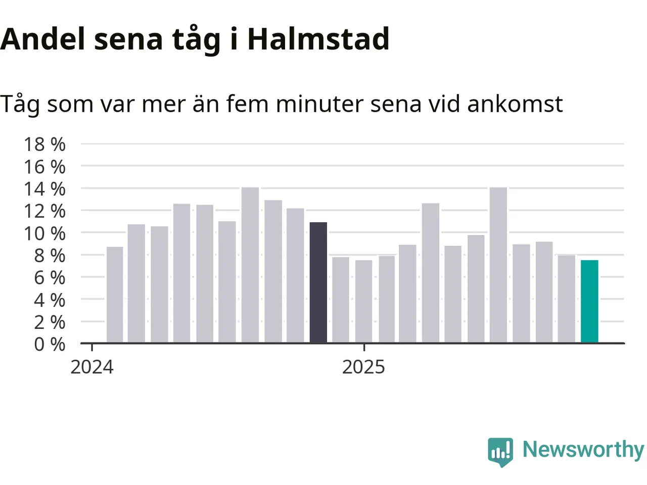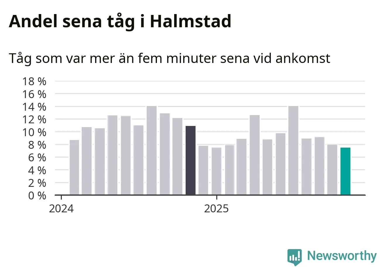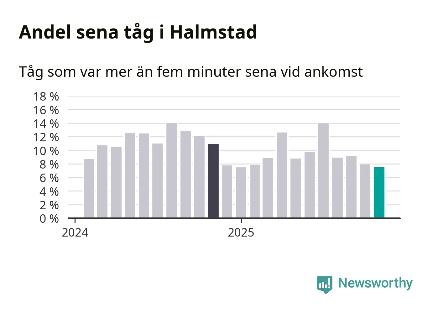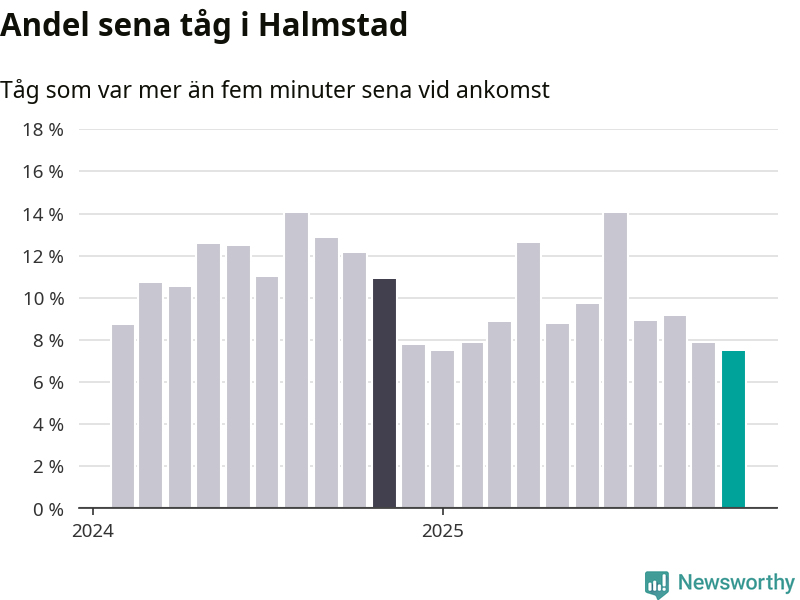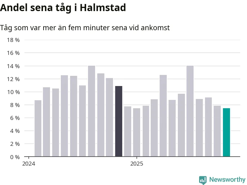 Sju procent är den lägsta andelen sena tåg sedan Newsworthy började mäta lokala förseningar i början av 2024. Siffrorna bygger på realtidsinformation om tågavgångar och ankomster från Trafikverket, som Newsworthy löpande samlar in.