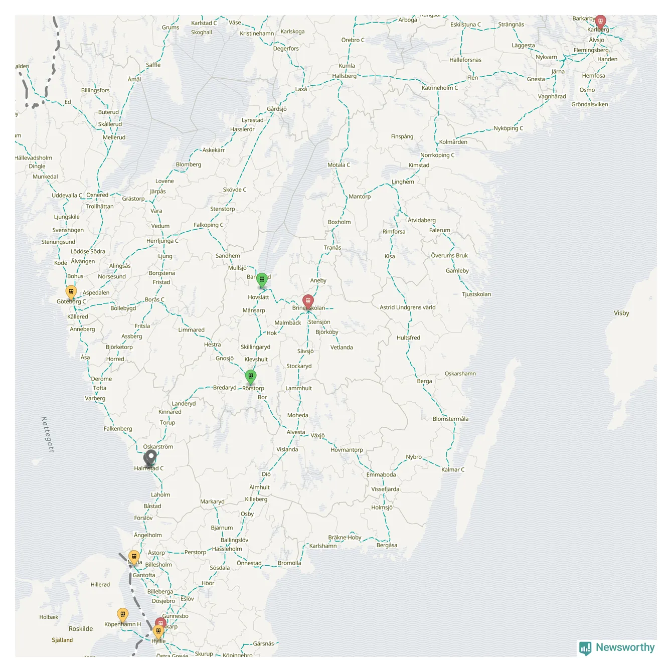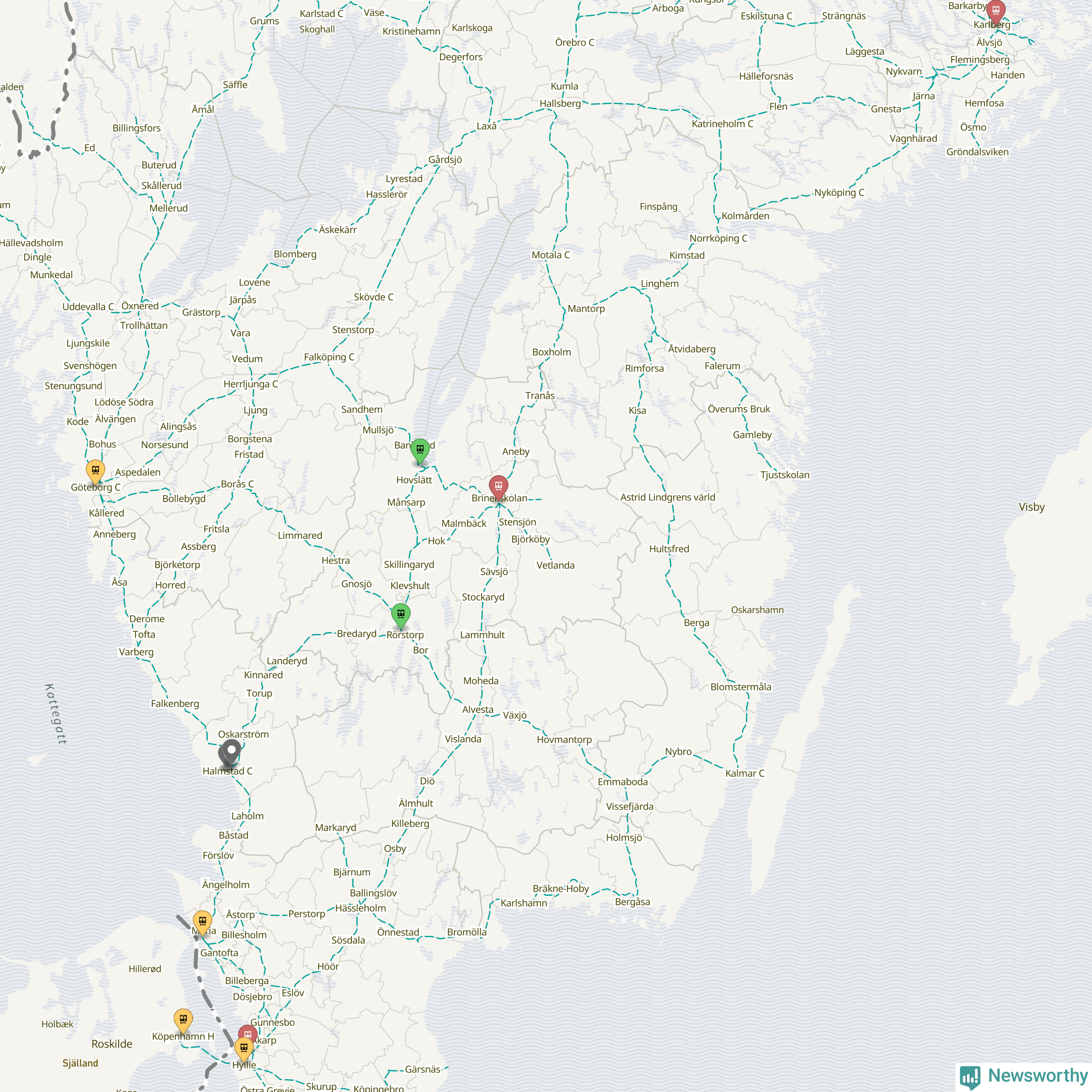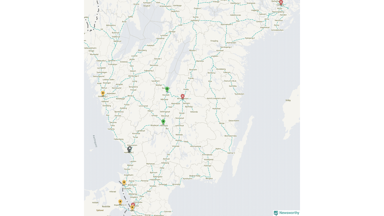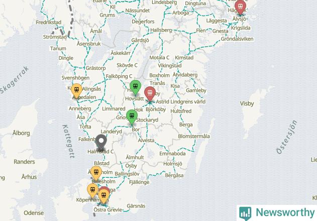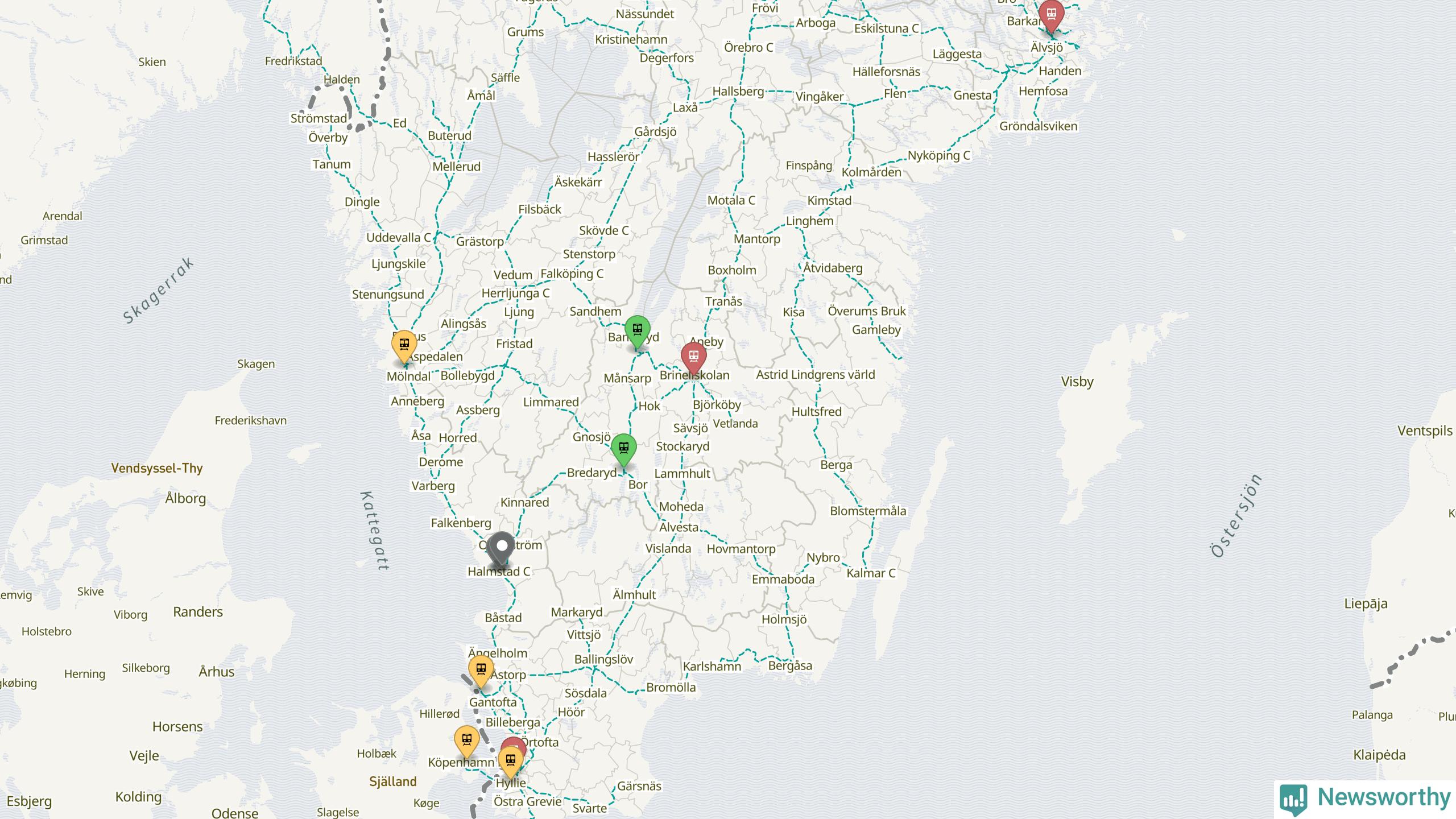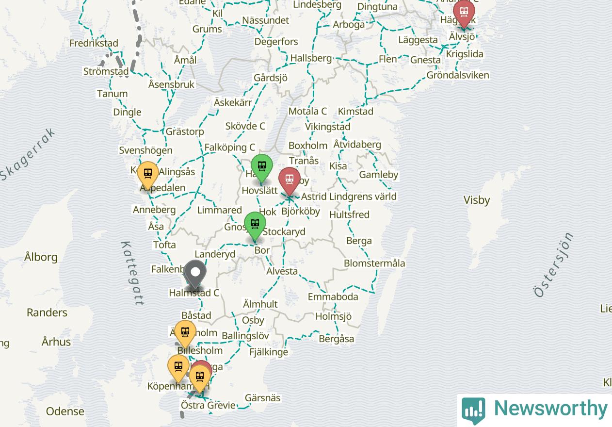 Kartdata från Mapbox, Newsworthy, OpenStreetMap och Trafikverket. Uppgifter om sträckor med passagerartrafik från jarnvag.net.
