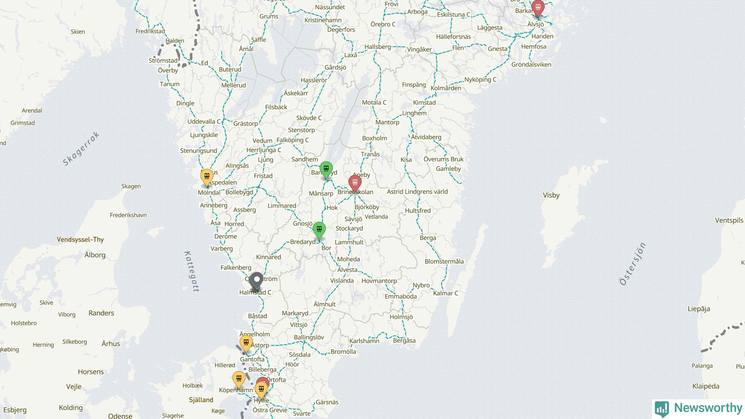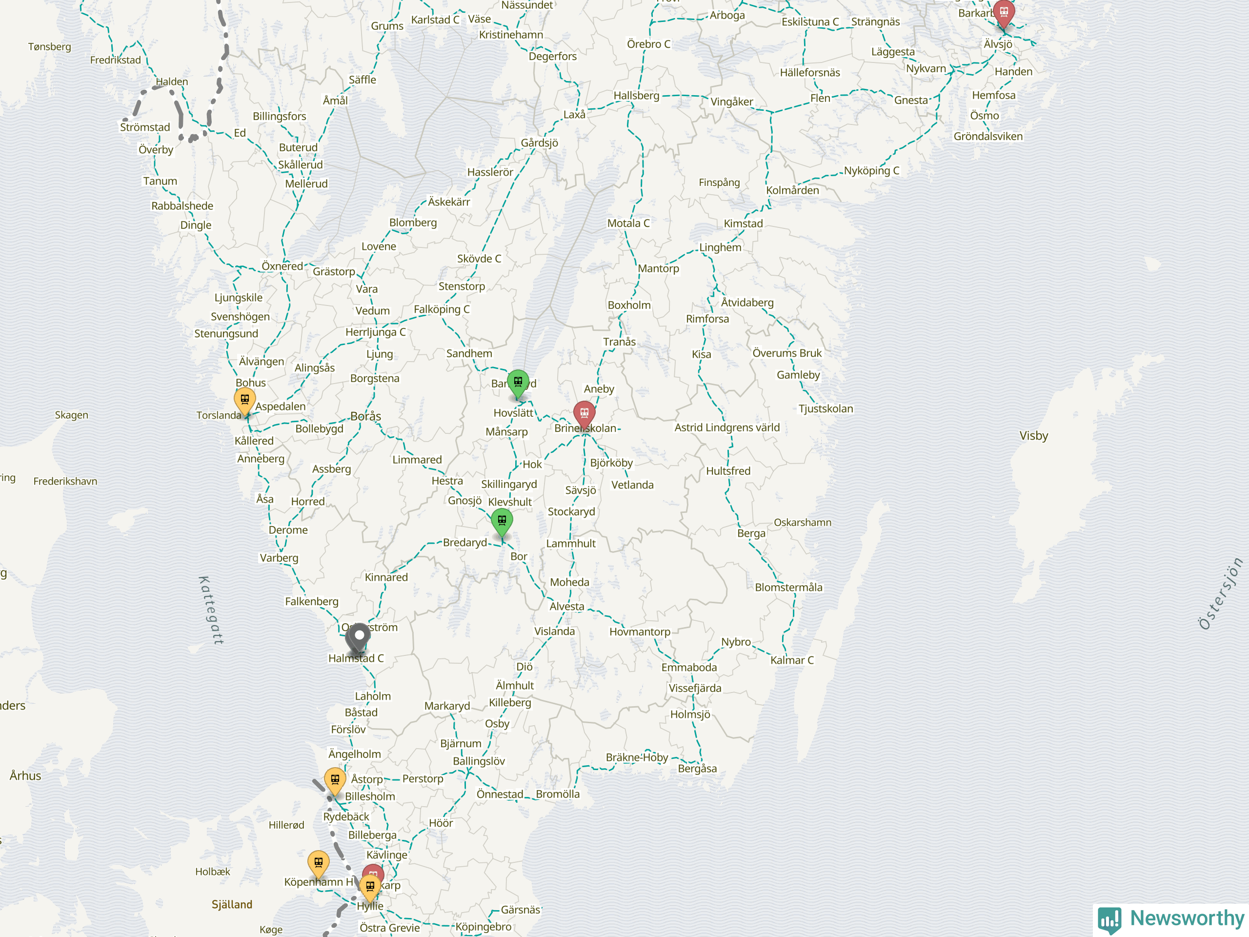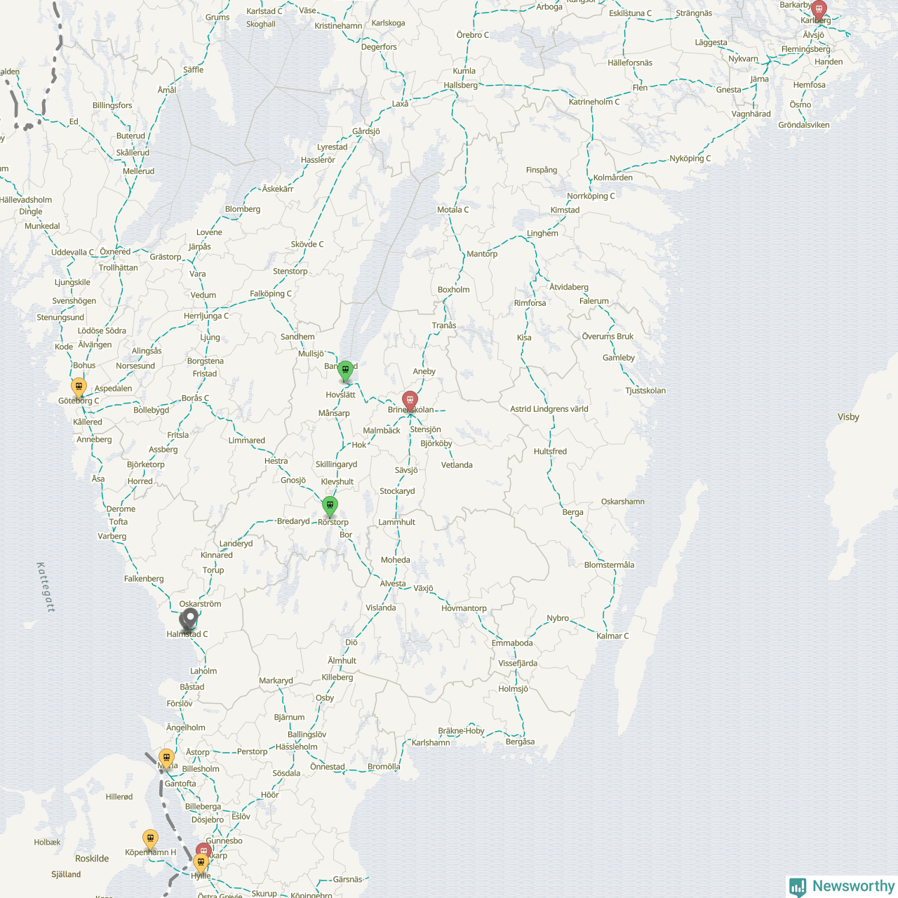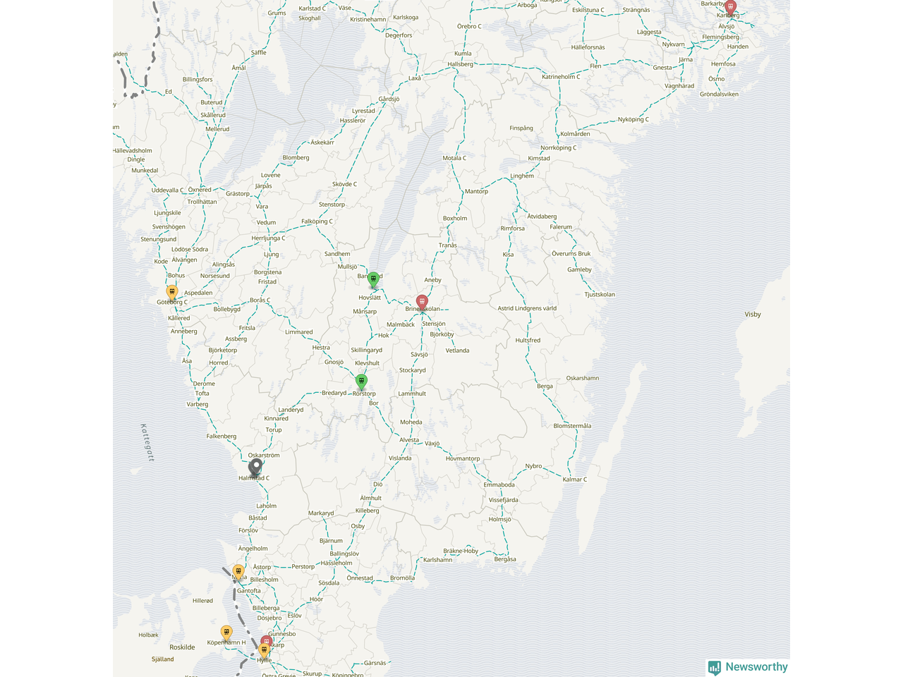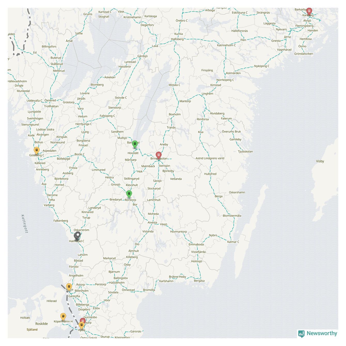 Kartdata från Mapbox, Newsworthy, OpenStreetMap och Trafikverket. Uppgifter om sträckor med passagerartrafik från jarnvag.net.