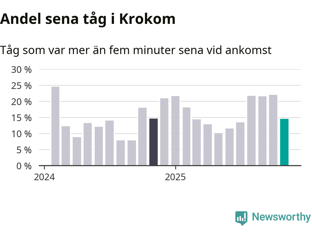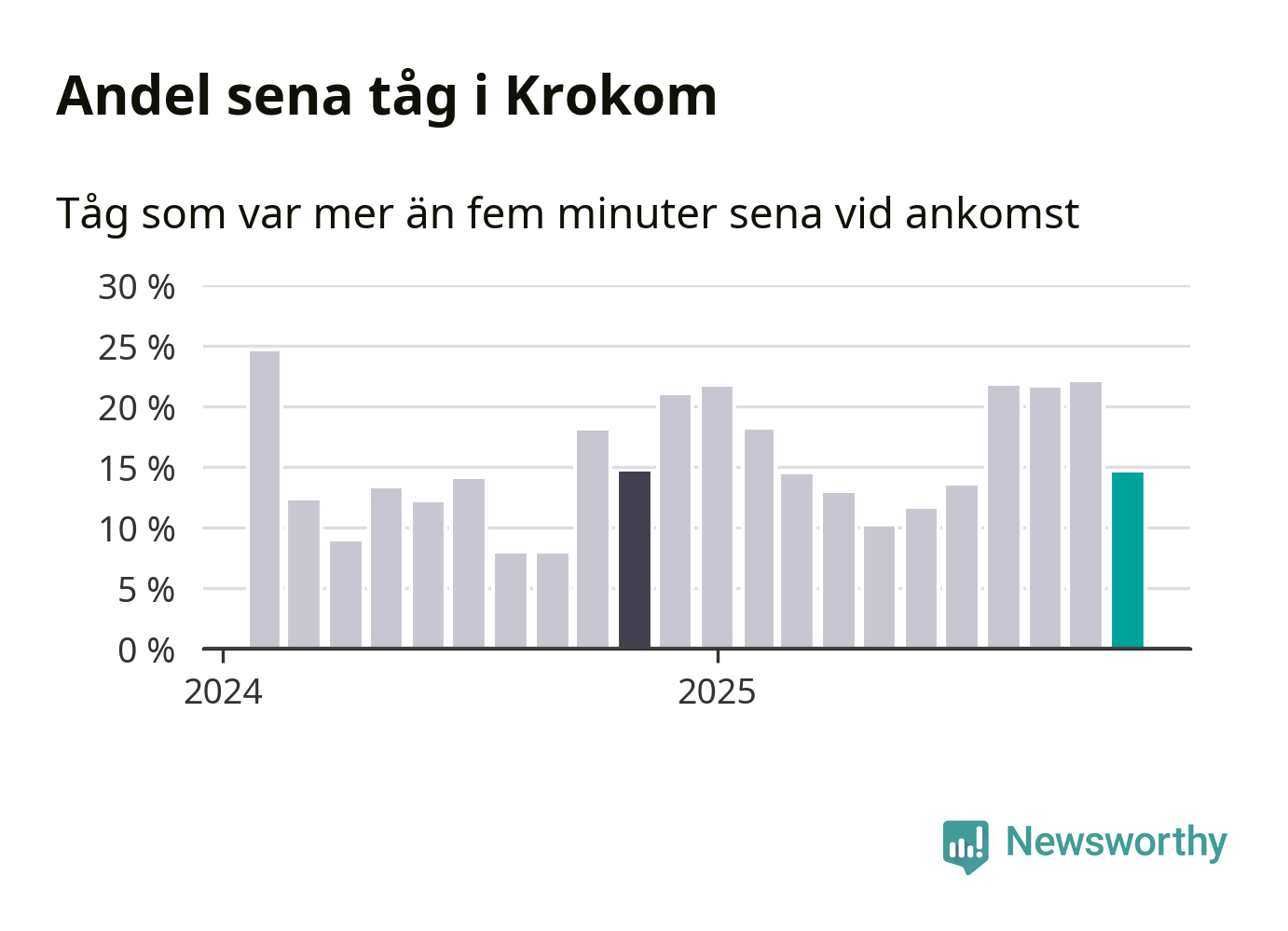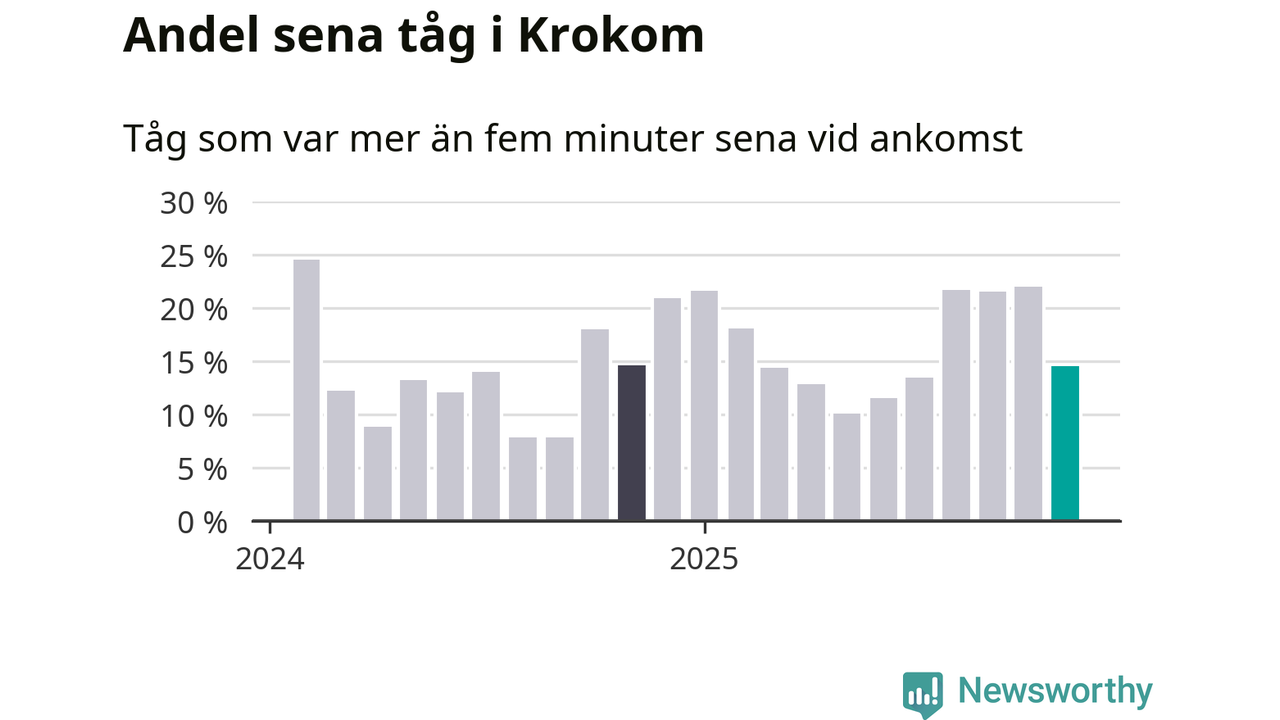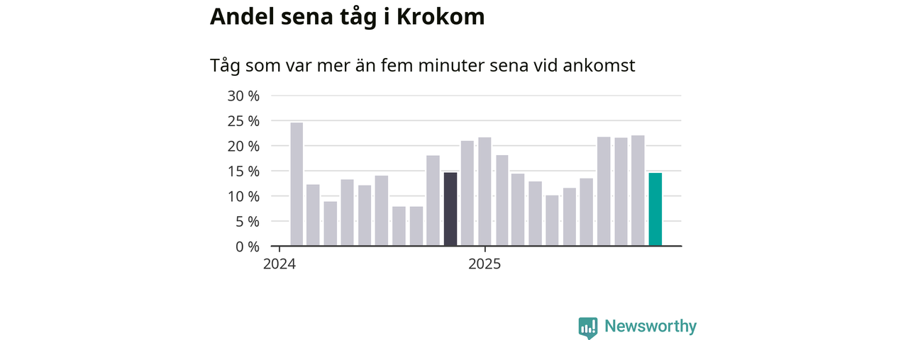 15 procent kan jämföras med 22 procent månaden innan, och 15 procent i november 2024. Siffrorna bygger på realtidsinformation om tågavgångar och ankomster från Trafikverket, som Newsworthy löpande samlar in.