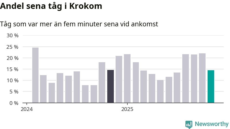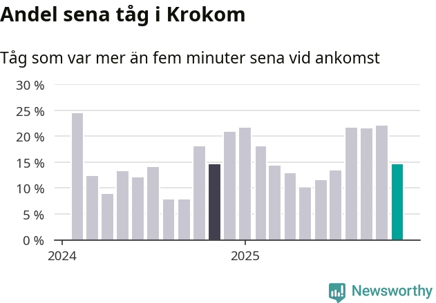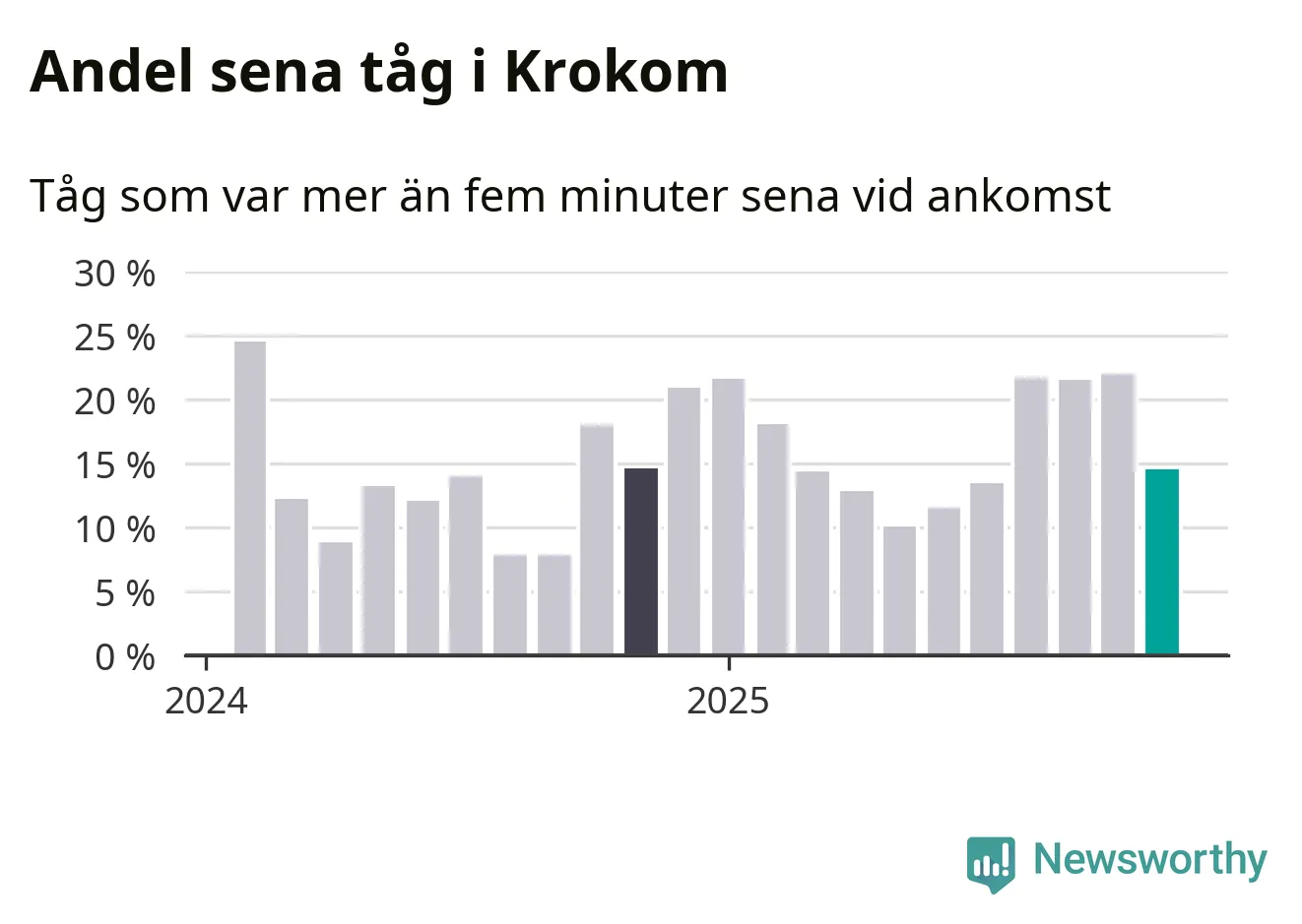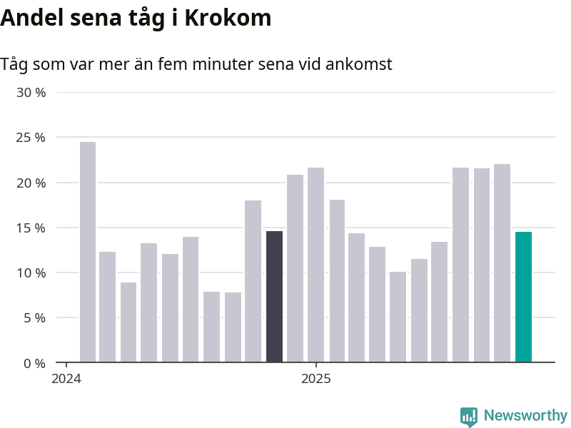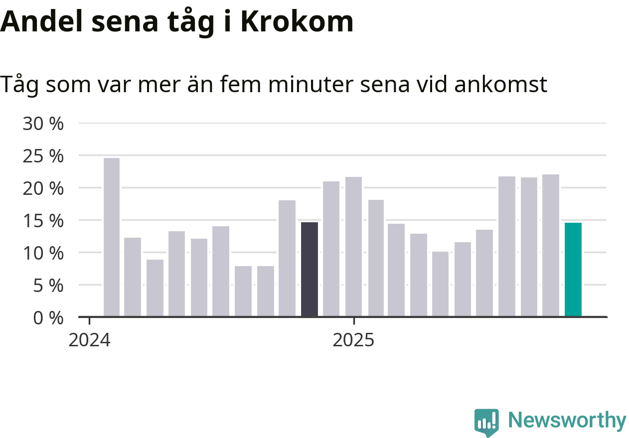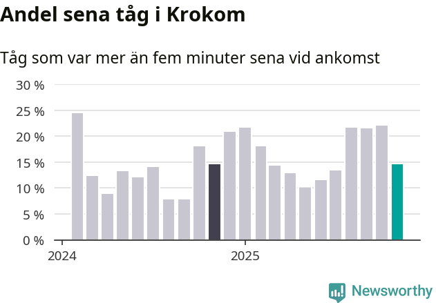 15 procent kan jämföras med 22 procent månaden innan, och 15 procent i november 2024. Siffrorna bygger på realtidsinformation om tågavgångar och ankomster från Trafikverket, som Newsworthy löpande samlar in.