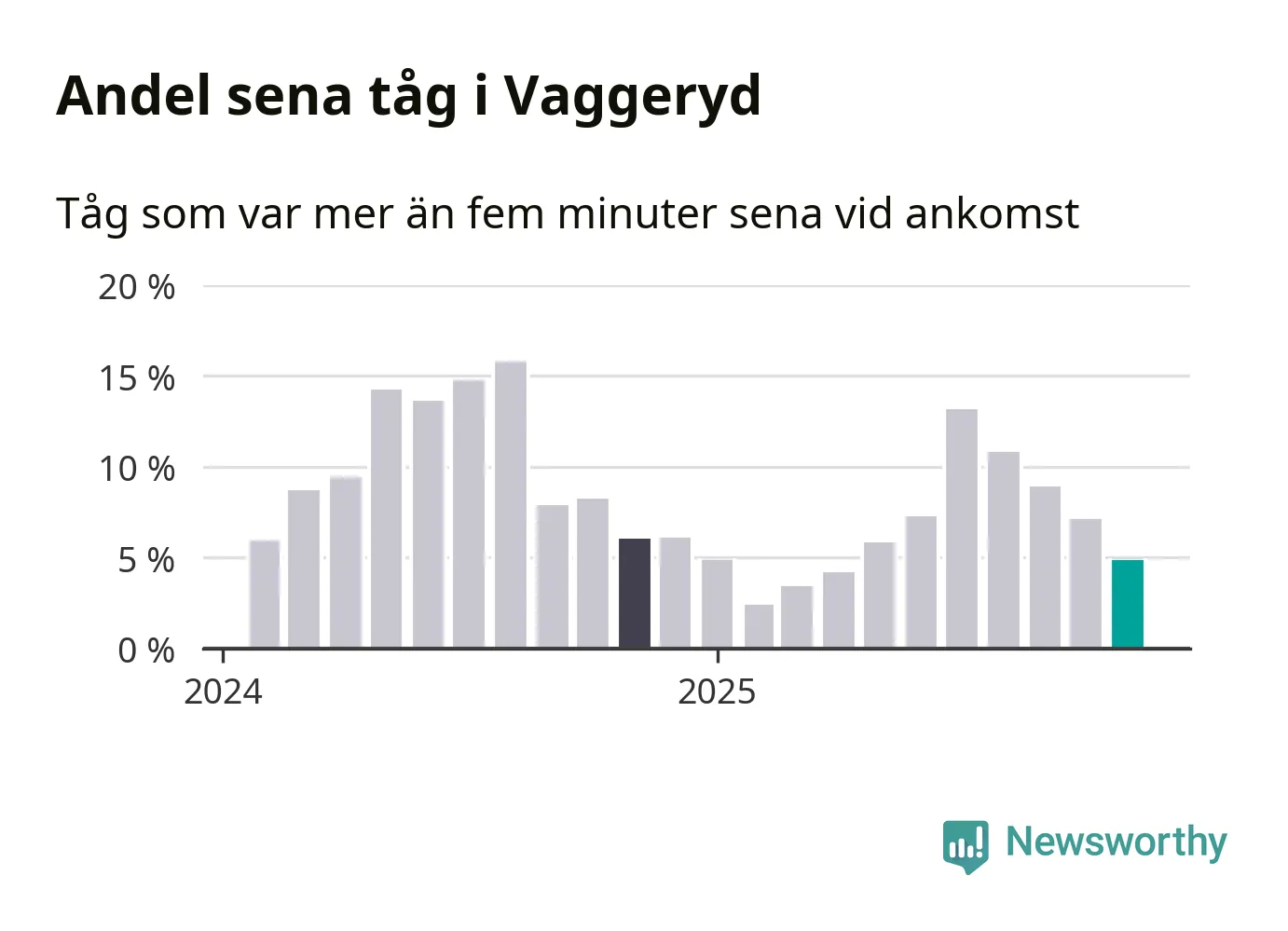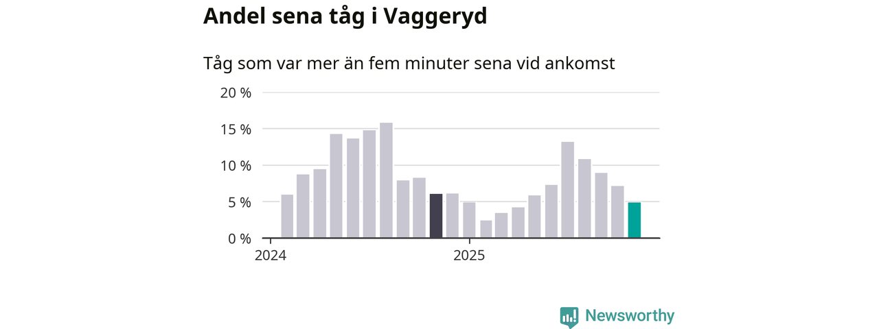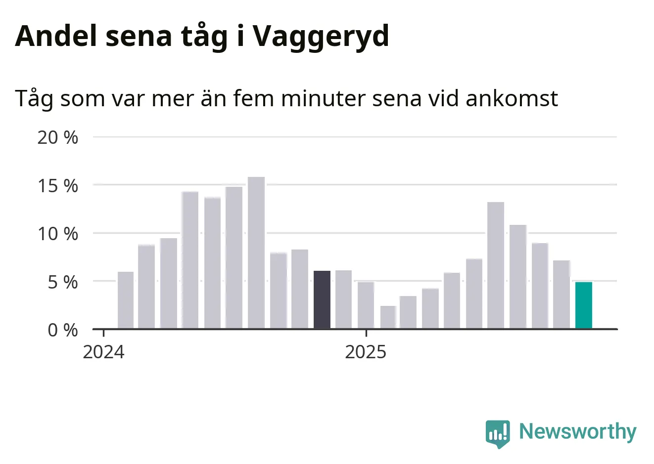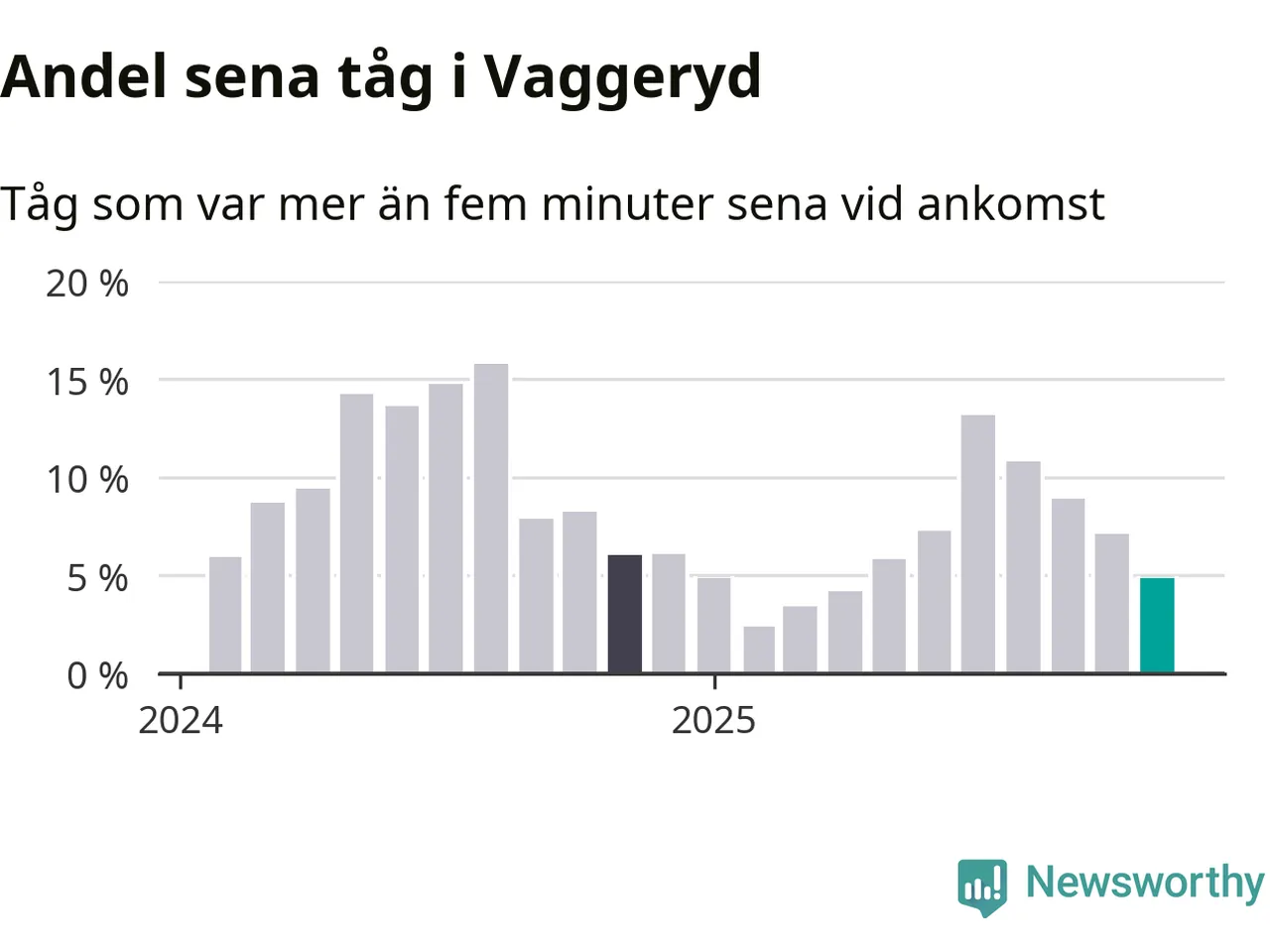 Fem procent kan jämföras med sju procent månaden innan, och sex procent i november 2024. November är den fjärde månaden i rad med minskande förseningar i Vaggeryd. Siffrorna bygger på realtidsinformation om tågavgångar och ankomster från Trafikverket, som Newsworthy löpande samlar in.