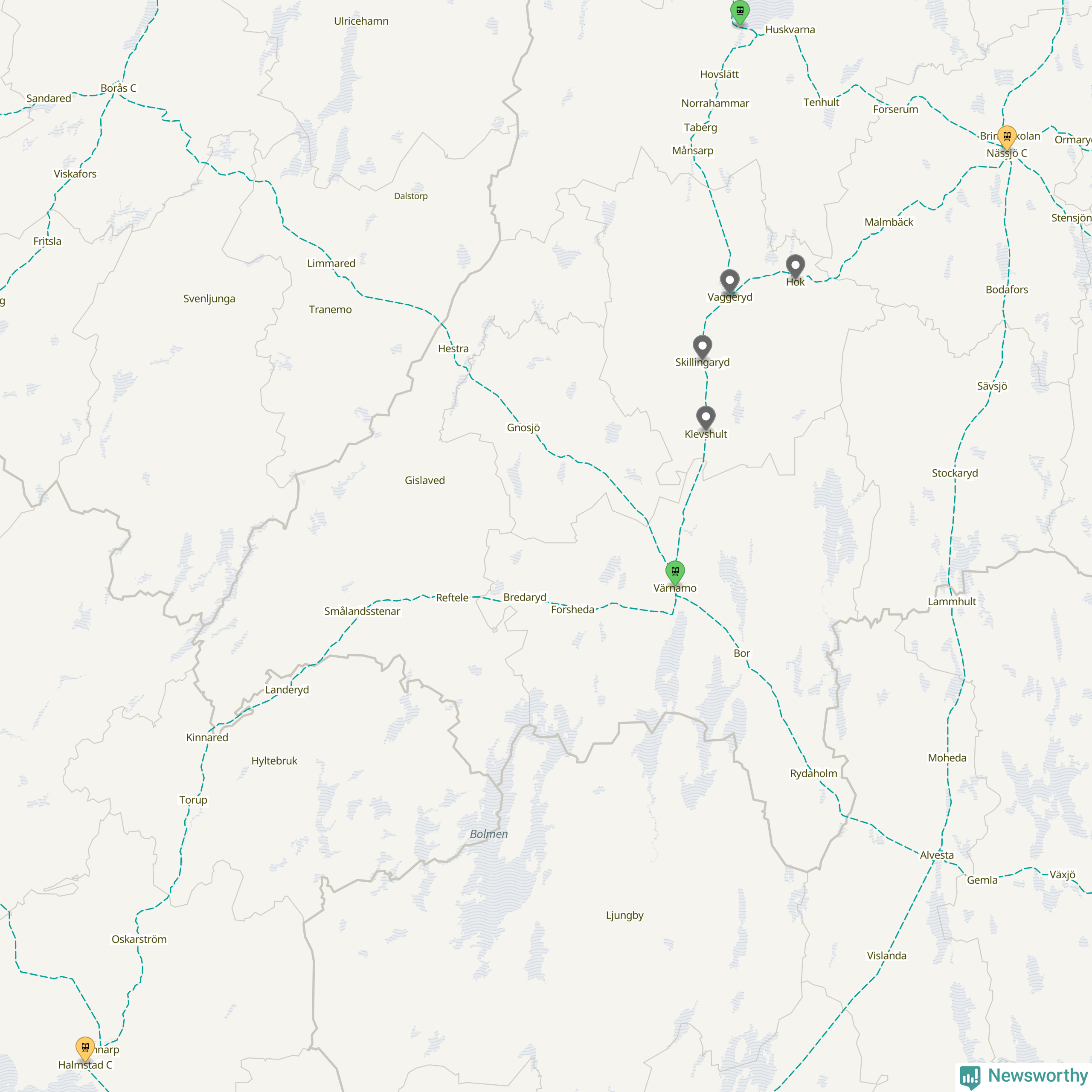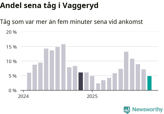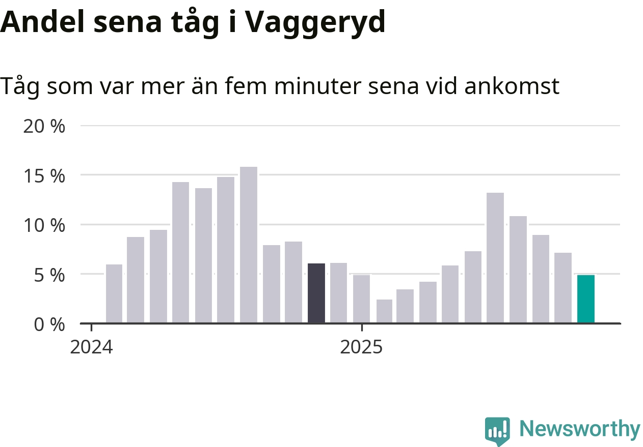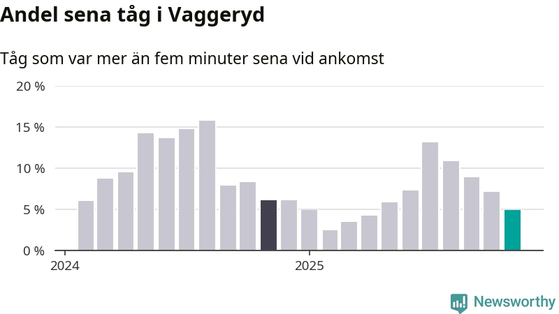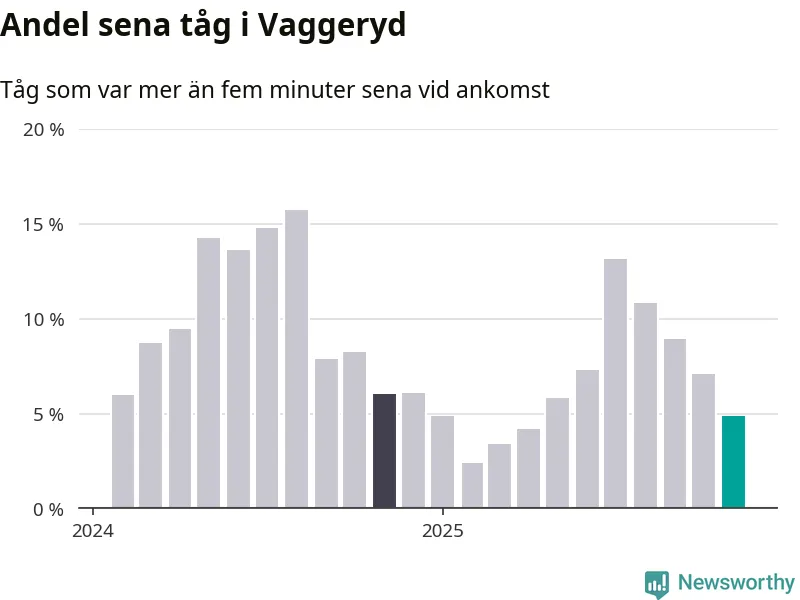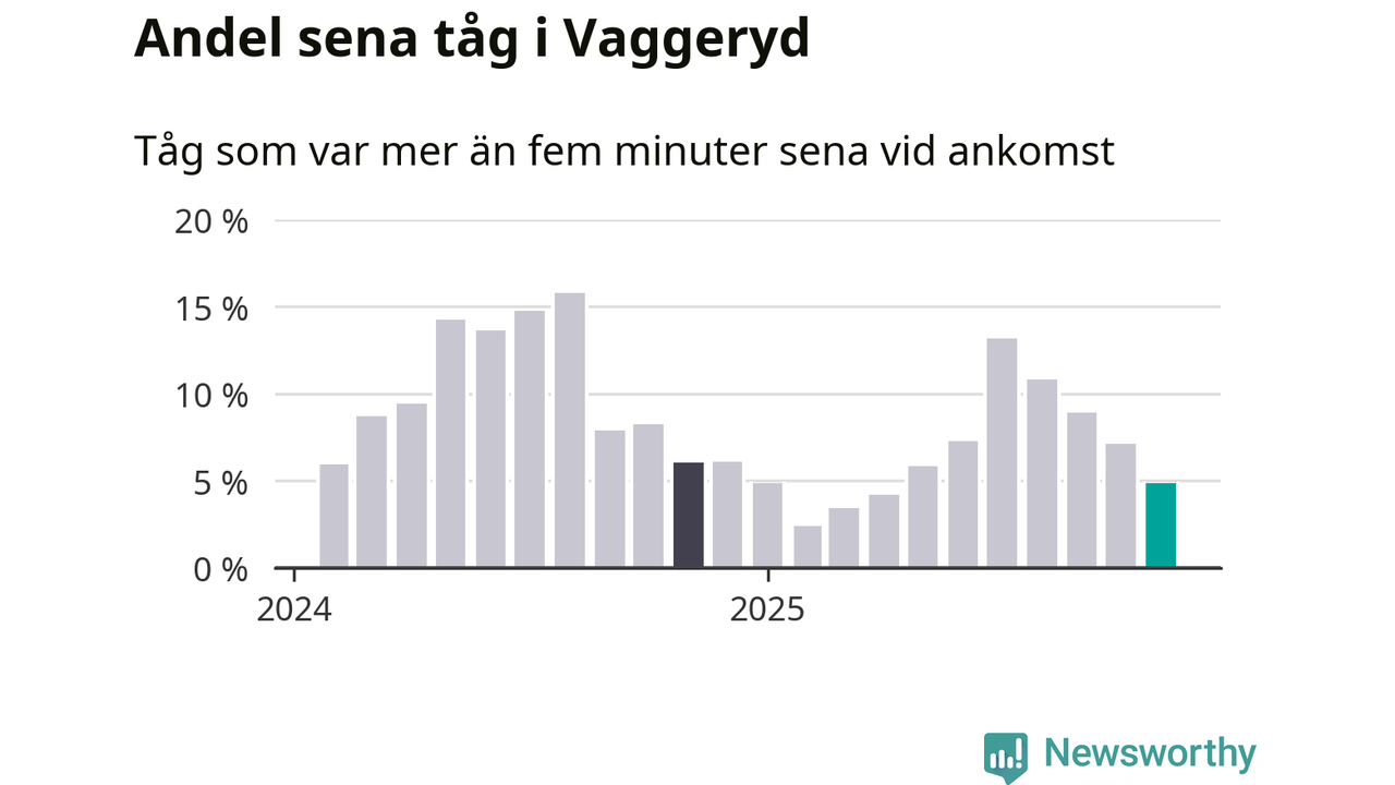 Fem procent kan jämföras med sju procent månaden innan, och sex procent i november 2024. November är den fjärde månaden i rad med minskande förseningar i Vaggeryd. Siffrorna bygger på realtidsinformation om tågavgångar och ankomster från Trafikverket, som Newsworthy löpande samlar in.