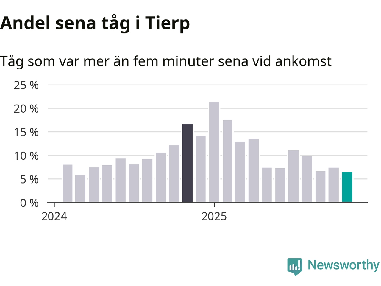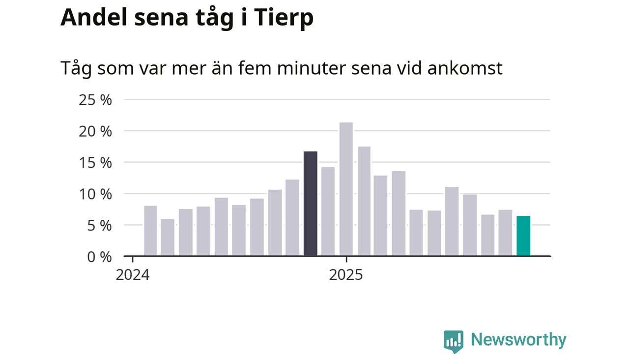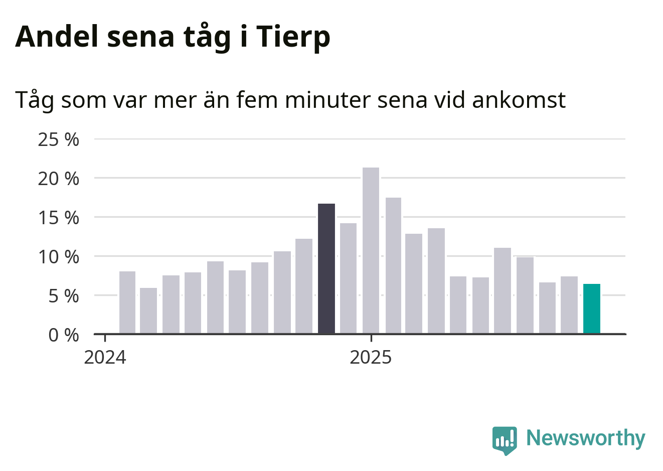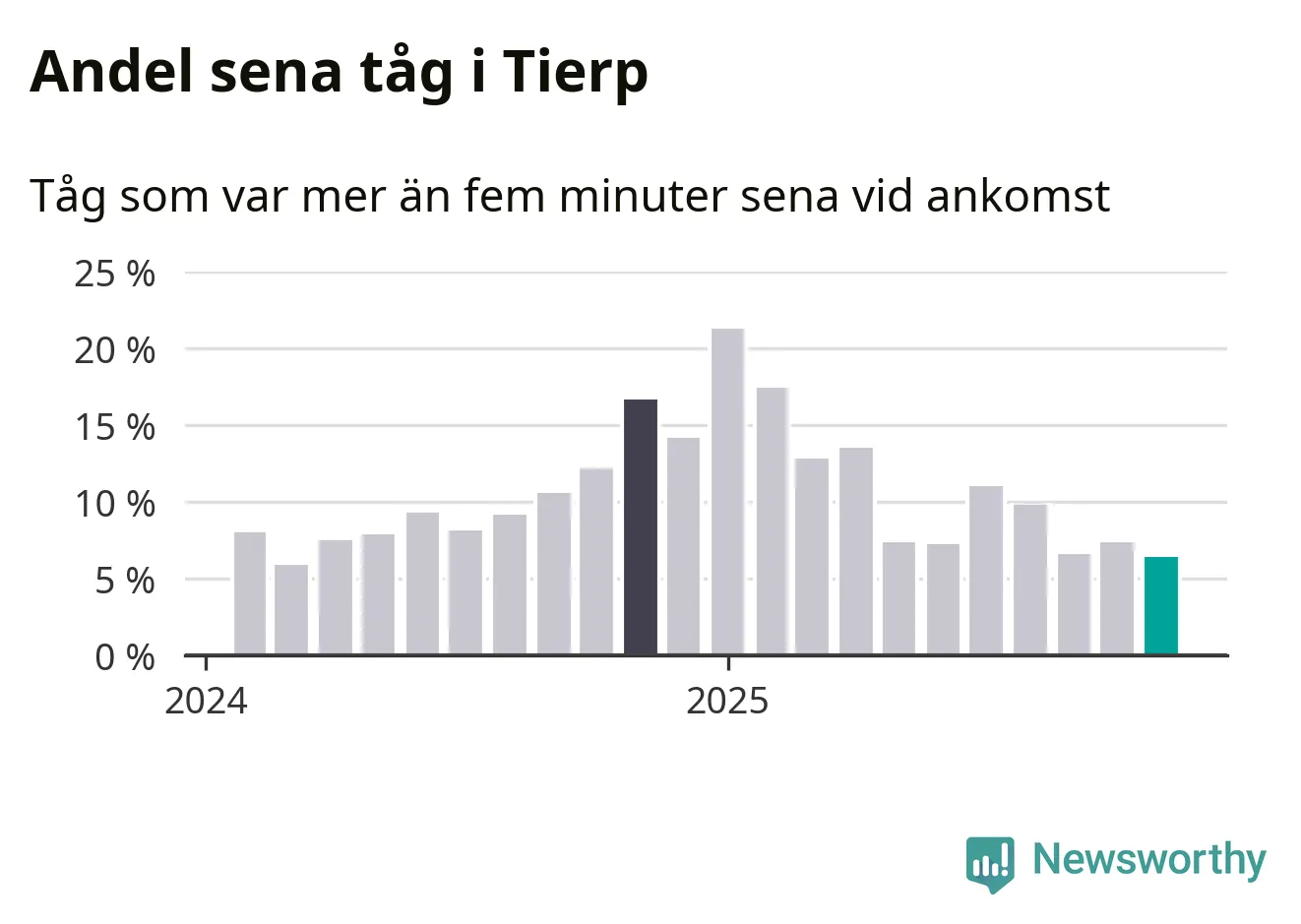 Senast andelen förseningar var så låg var i mars 2024. Siffrorna bygger på realtidsinformation om tågavgångar och ankomster från Trafikverket, som Newsworthy löpande samlar in.