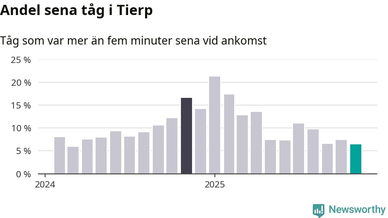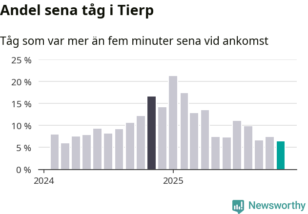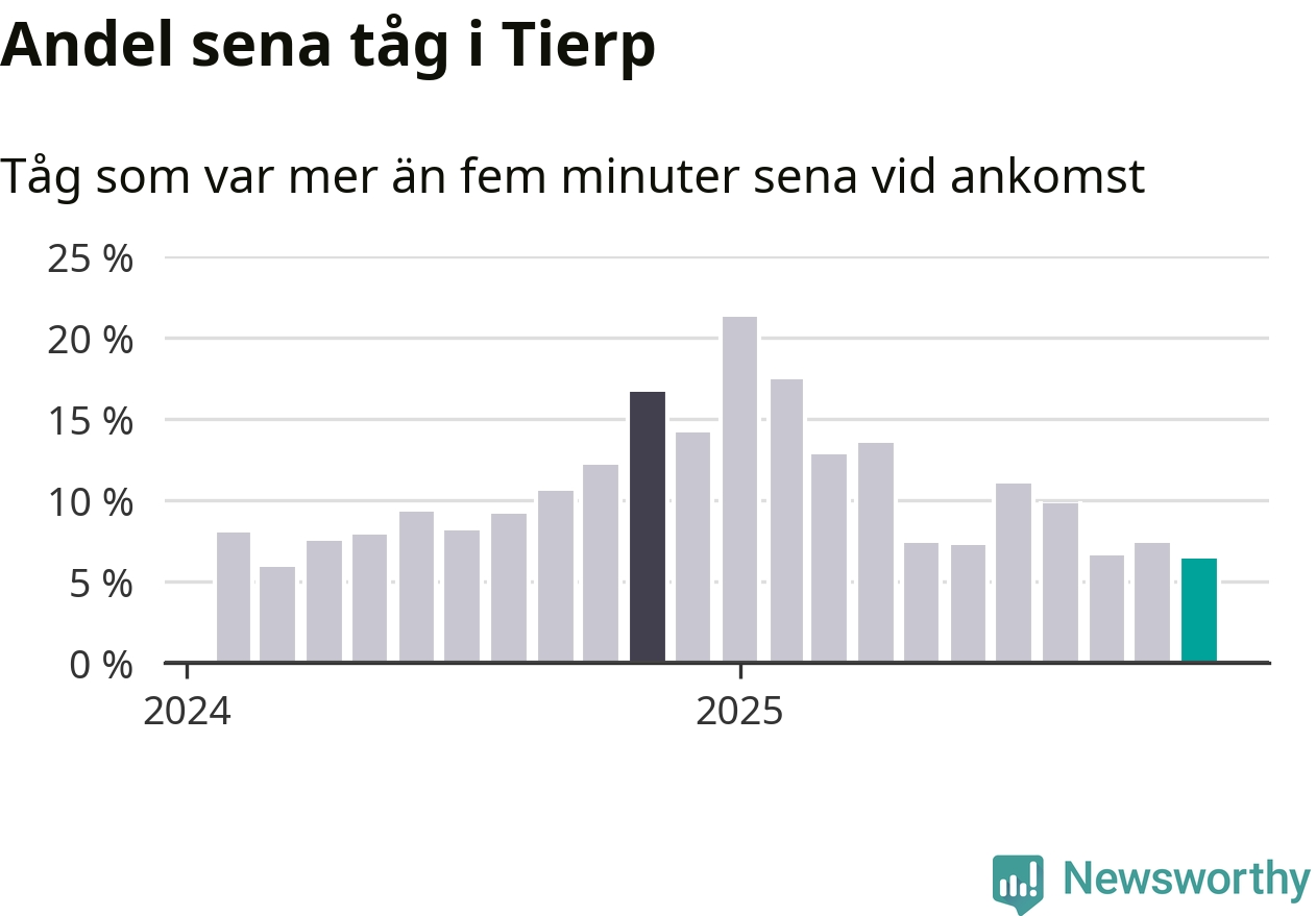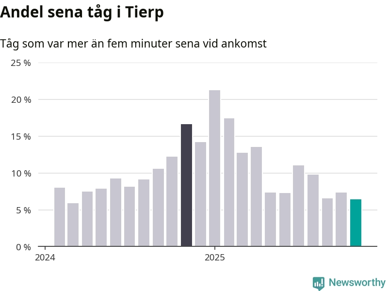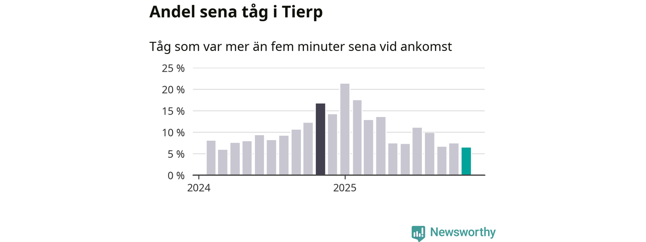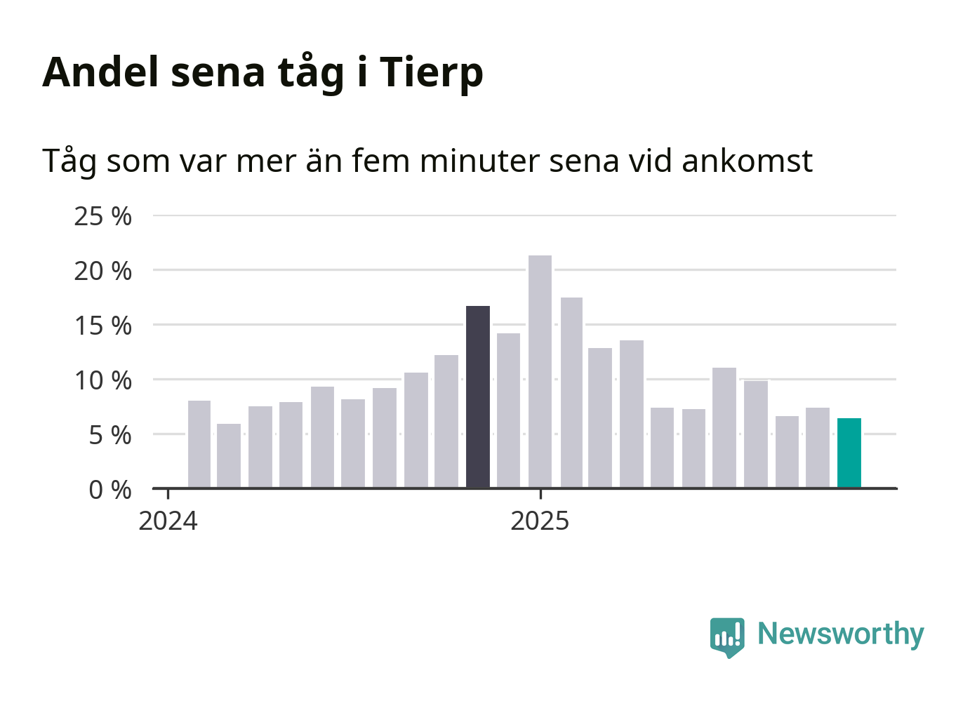 Senast andelen förseningar var så låg var i mars 2024. Siffrorna bygger på realtidsinformation om tågavgångar och ankomster från Trafikverket, som Newsworthy löpande samlar in.
