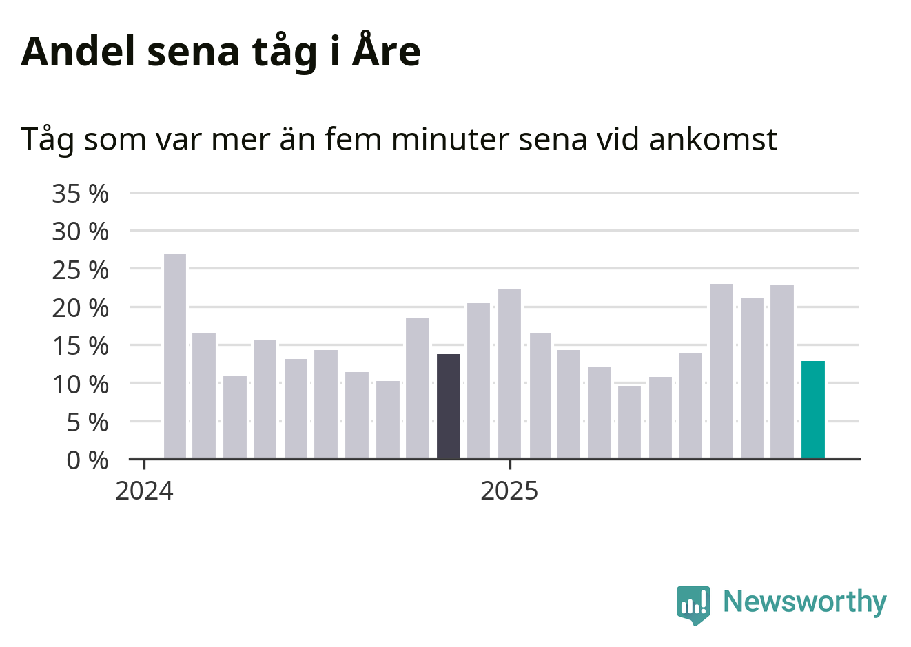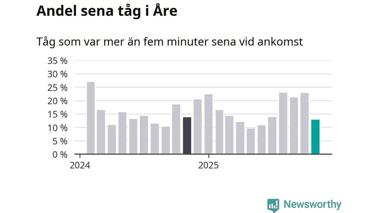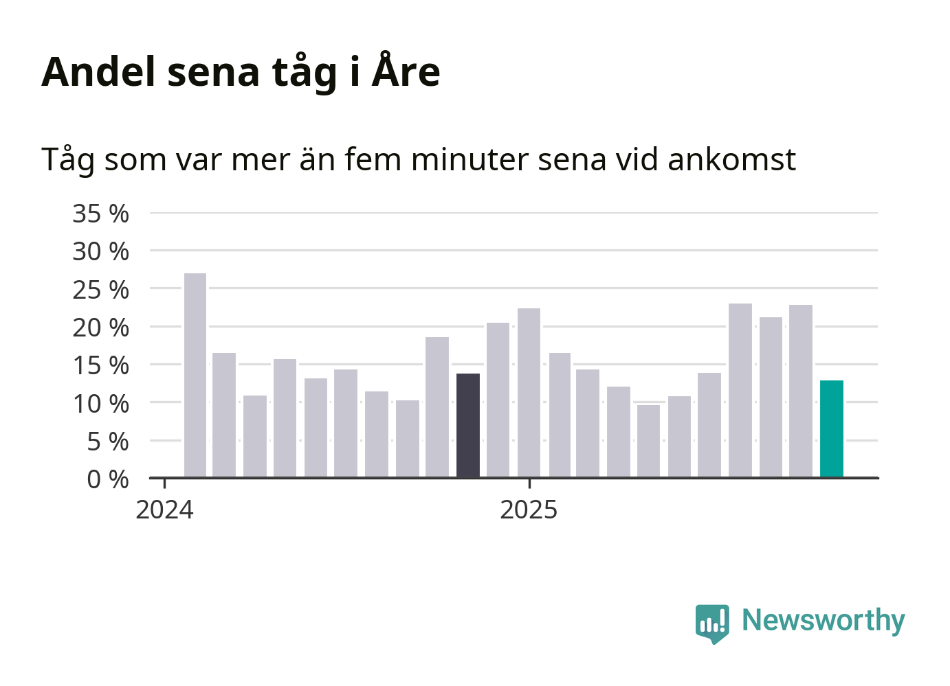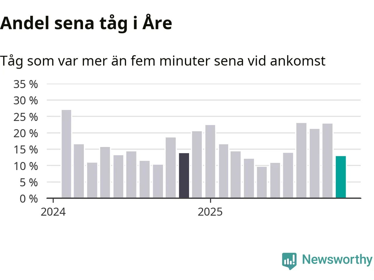 13 procent kan jämföras med 23 procent månaden innan, och 14 procent i november 2024. Siffrorna bygger på realtidsinformation om tågavgångar och ankomster från Trafikverket, som Newsworthy löpande samlar in.