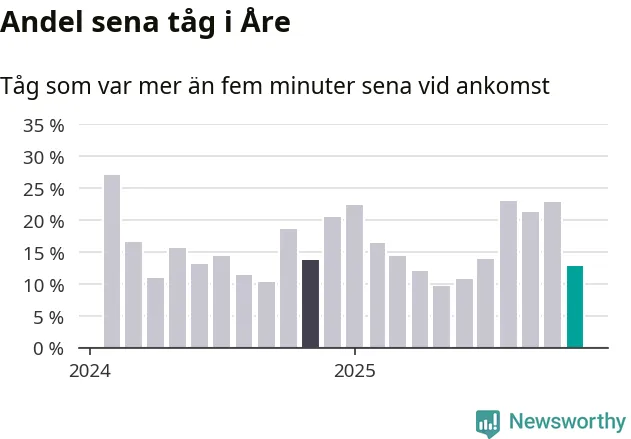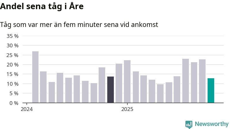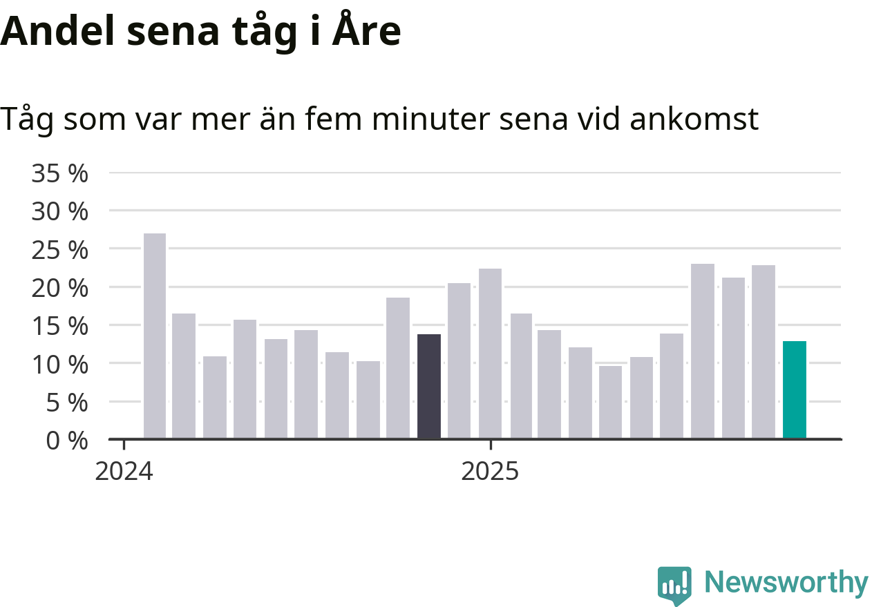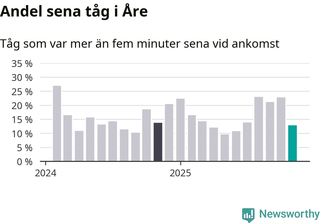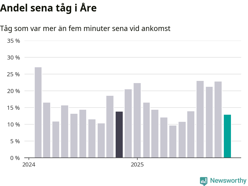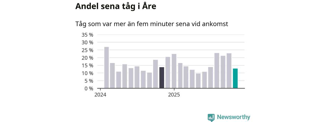 13 procent kan jämföras med 23 procent månaden innan, och 14 procent i november 2024. Siffrorna bygger på realtidsinformation om tågavgångar och ankomster från Trafikverket, som Newsworthy löpande samlar in.