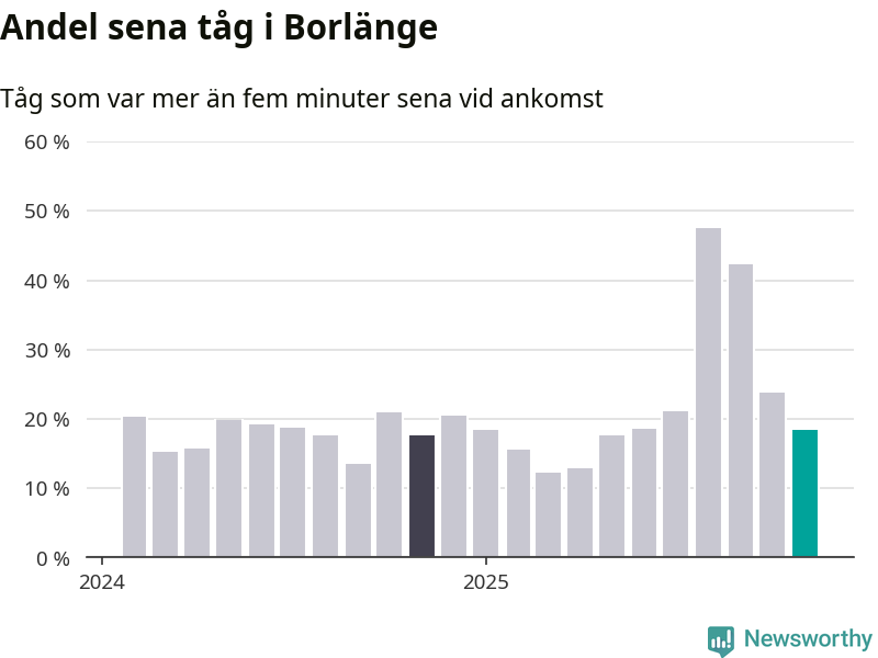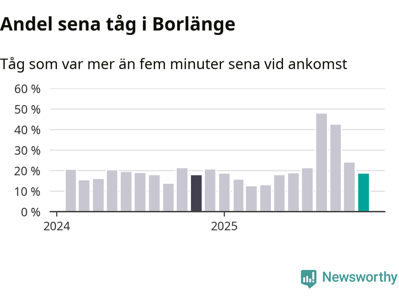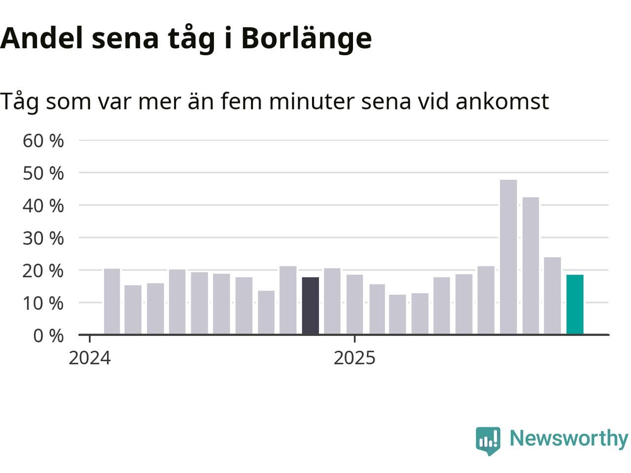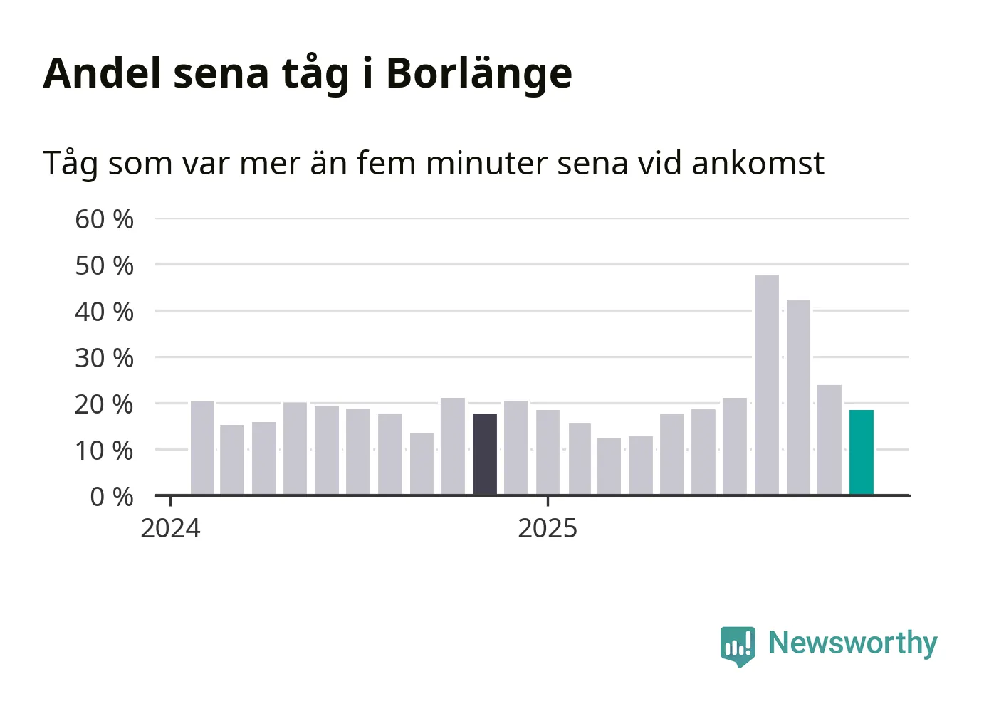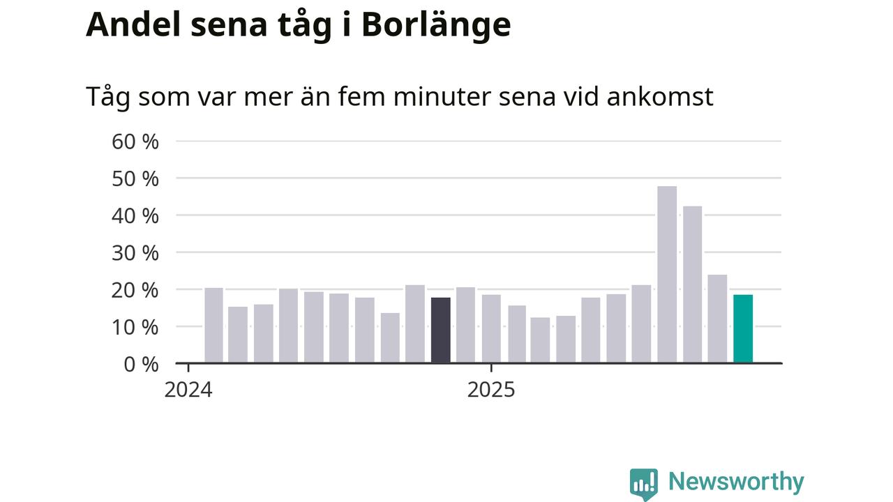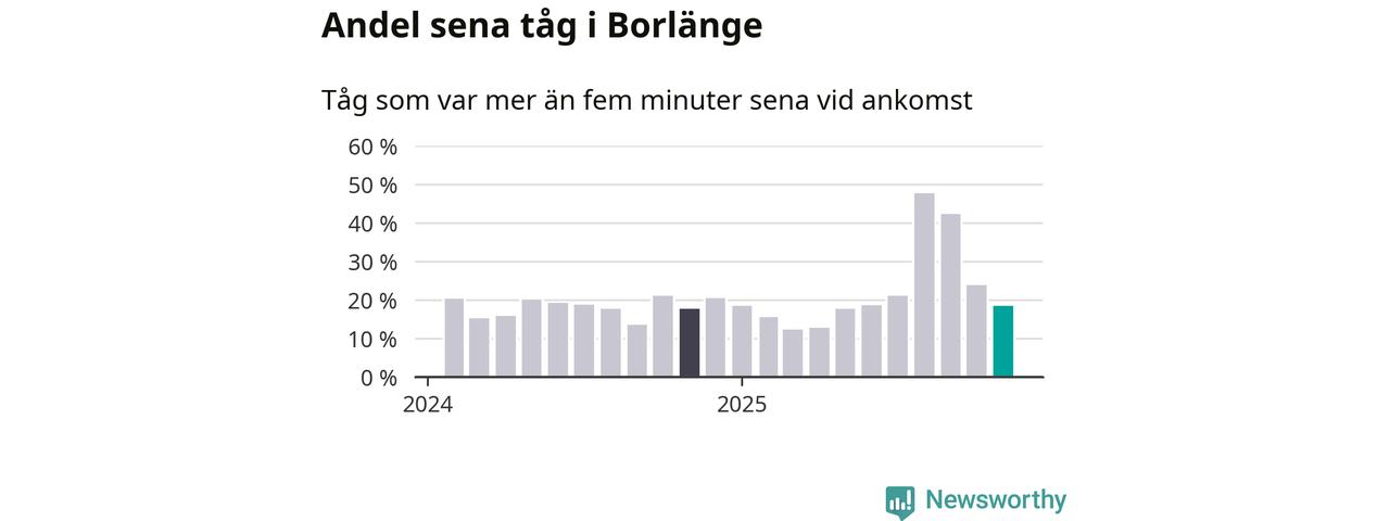 18 procent kan jämföras med 24 procent månaden innan, och 18 procent i november 2024. November är den tredje månaden i rad med minskande förseningar vid Borlänge C. Siffrorna bygger på realtidsinformation om tågavgångar och ankomster från Trafikverket, som Newsworthy löpande samlar in.