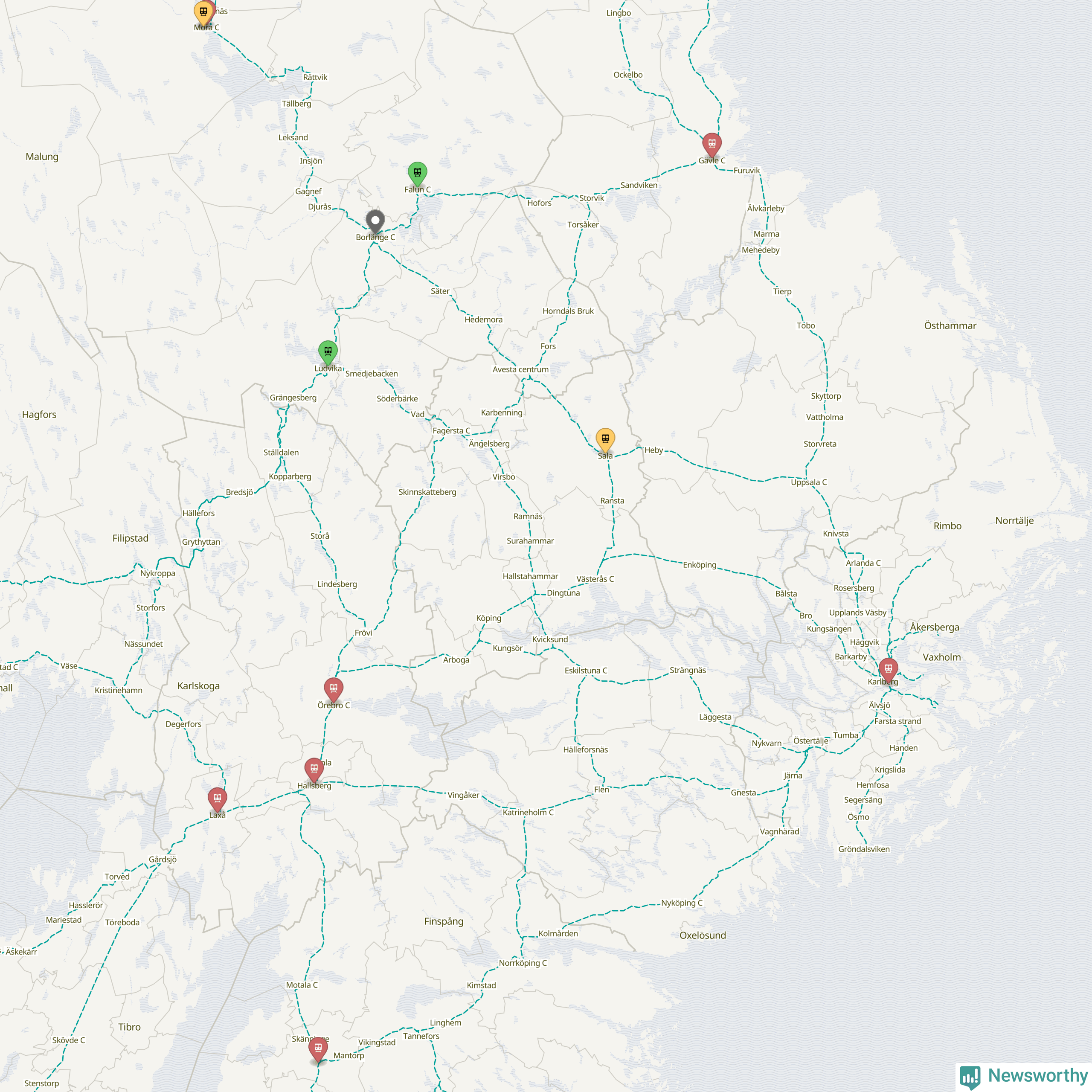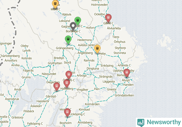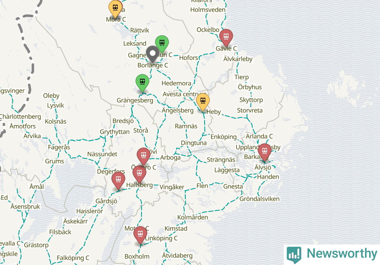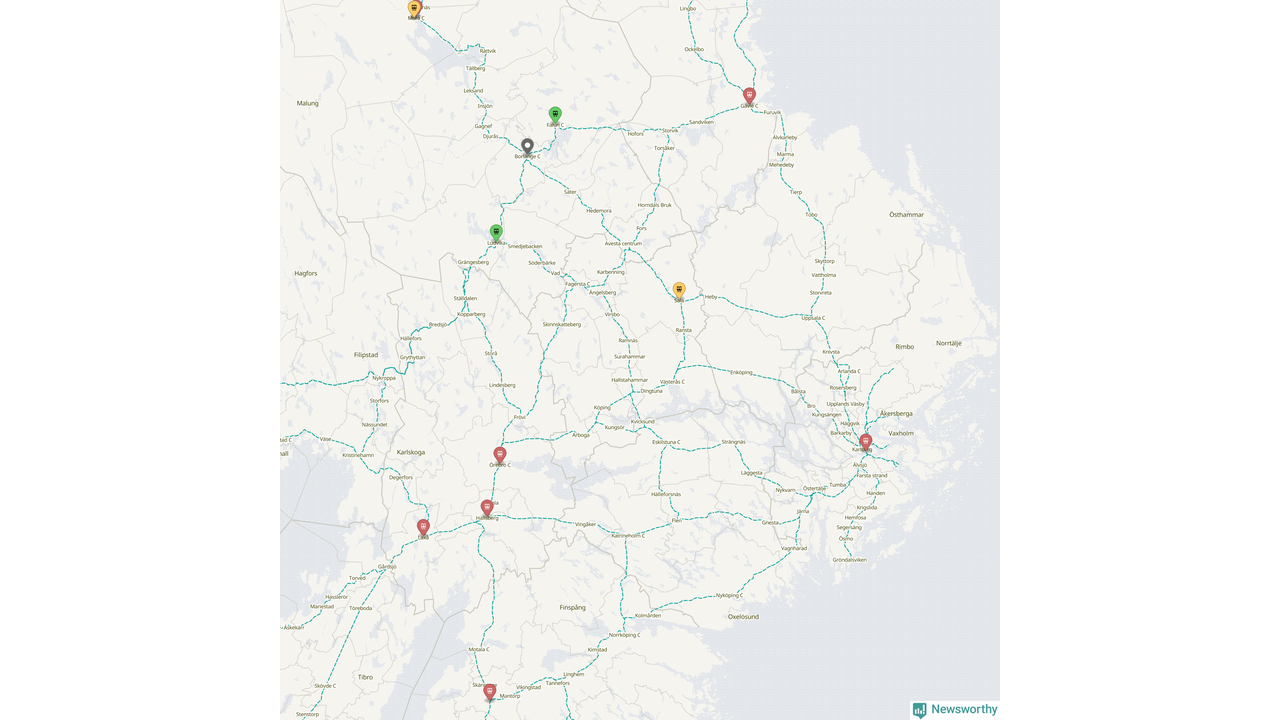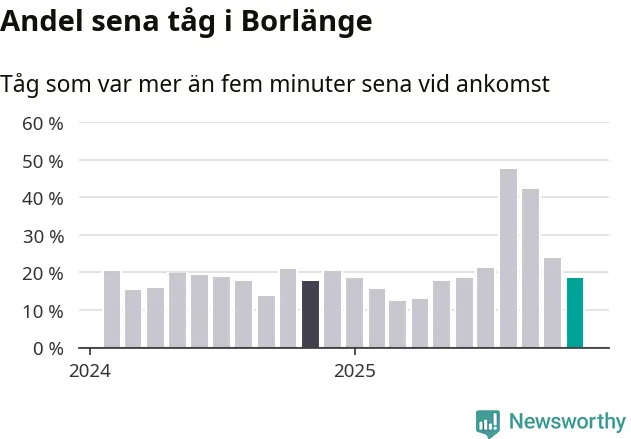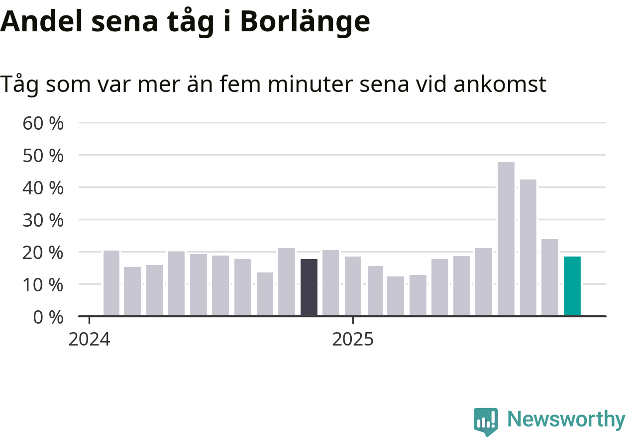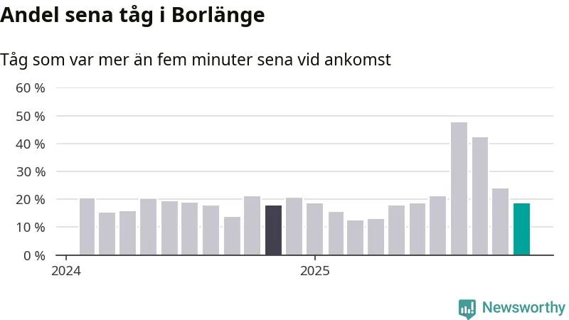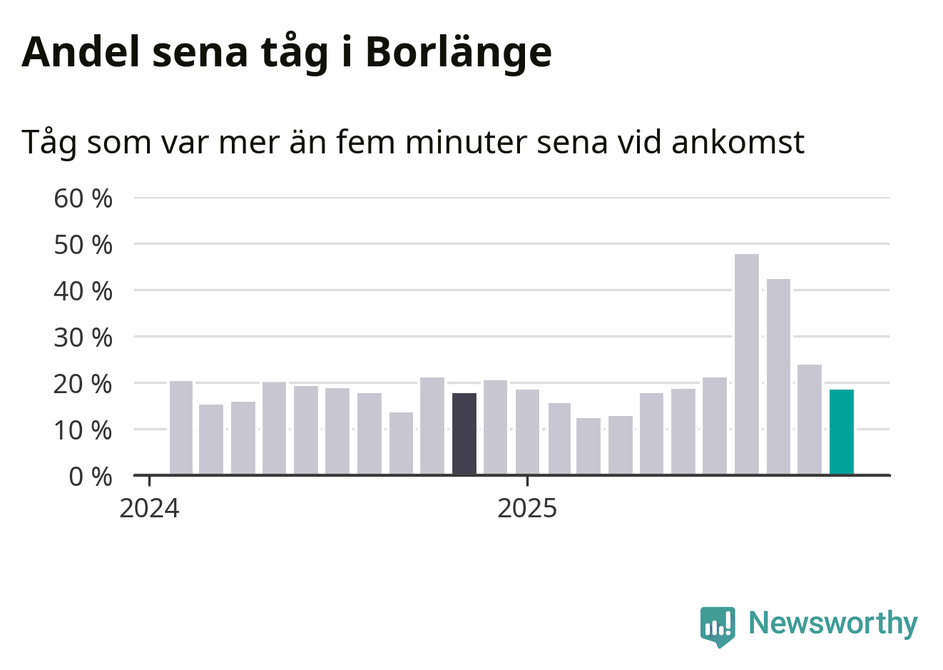 18 procent kan jämföras med 24 procent månaden innan, och 18 procent i november 2024. November är den tredje månaden i rad med minskande förseningar vid Borlänge C. Siffrorna bygger på realtidsinformation om tågavgångar och ankomster från Trafikverket, som Newsworthy löpande samlar in.