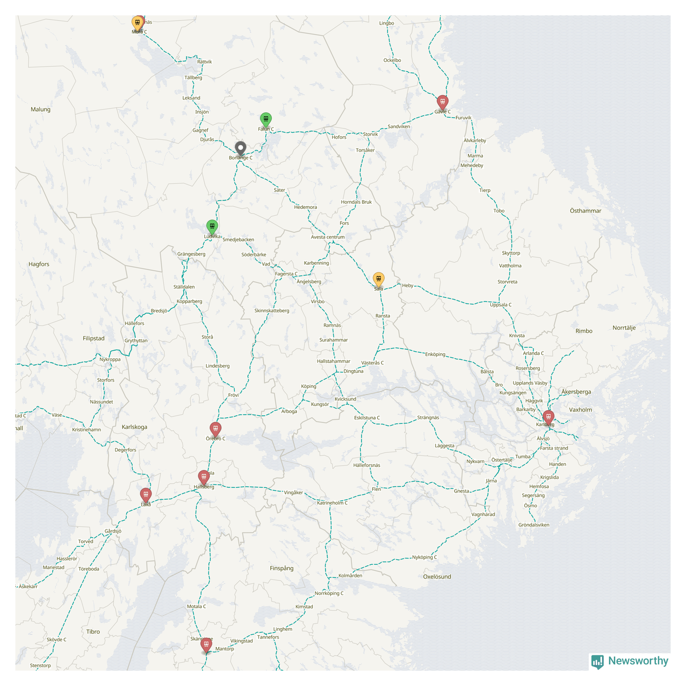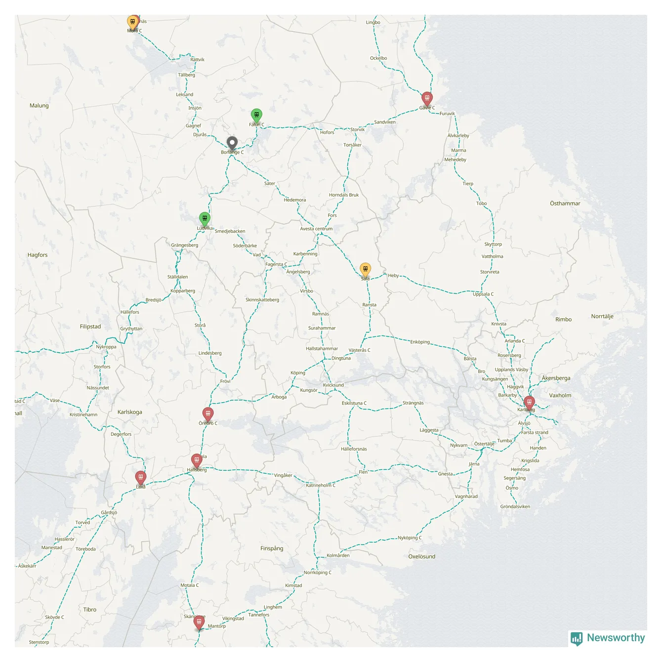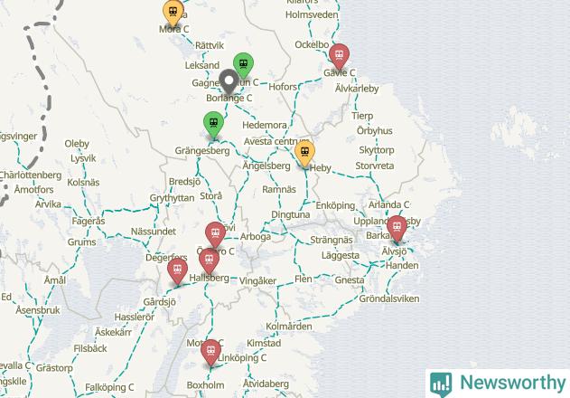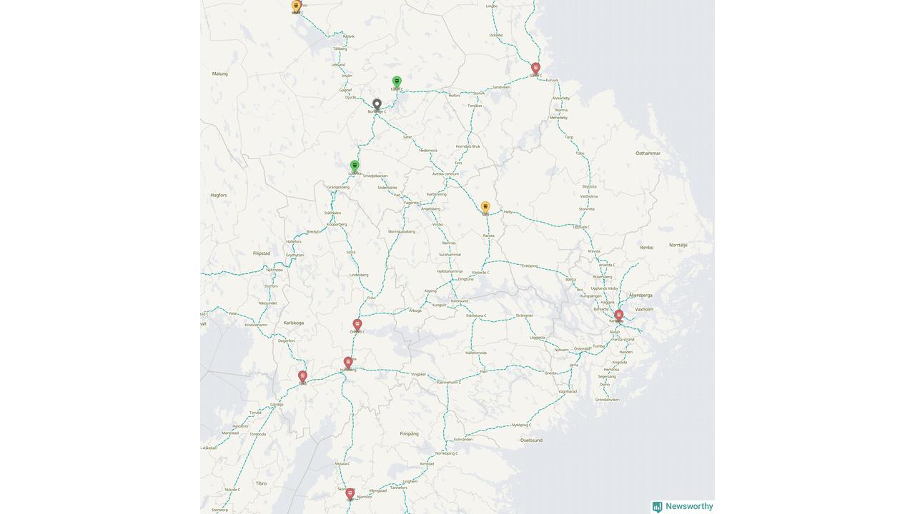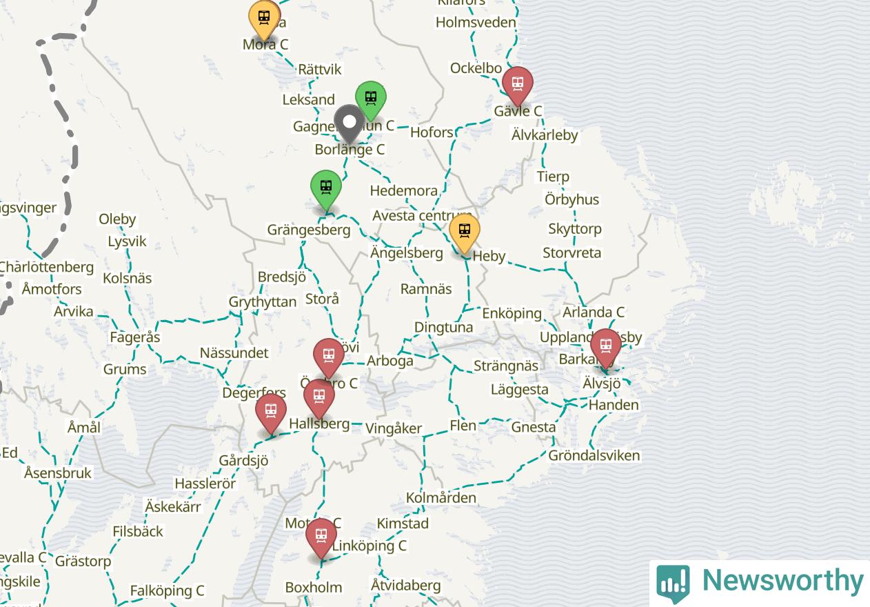 Kartdata från Mapbox, Newsworthy, OpenStreetMap och Trafikverket. Uppgifter om sträckor med passagerartrafik från jarnvag.net.