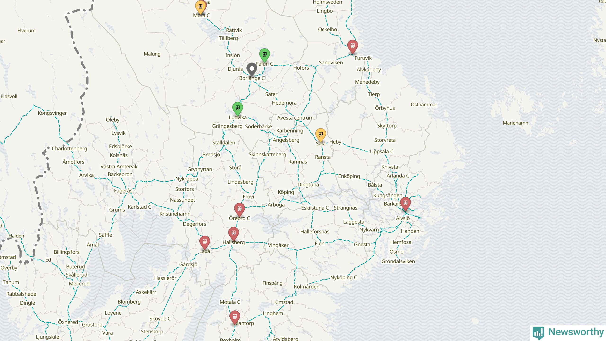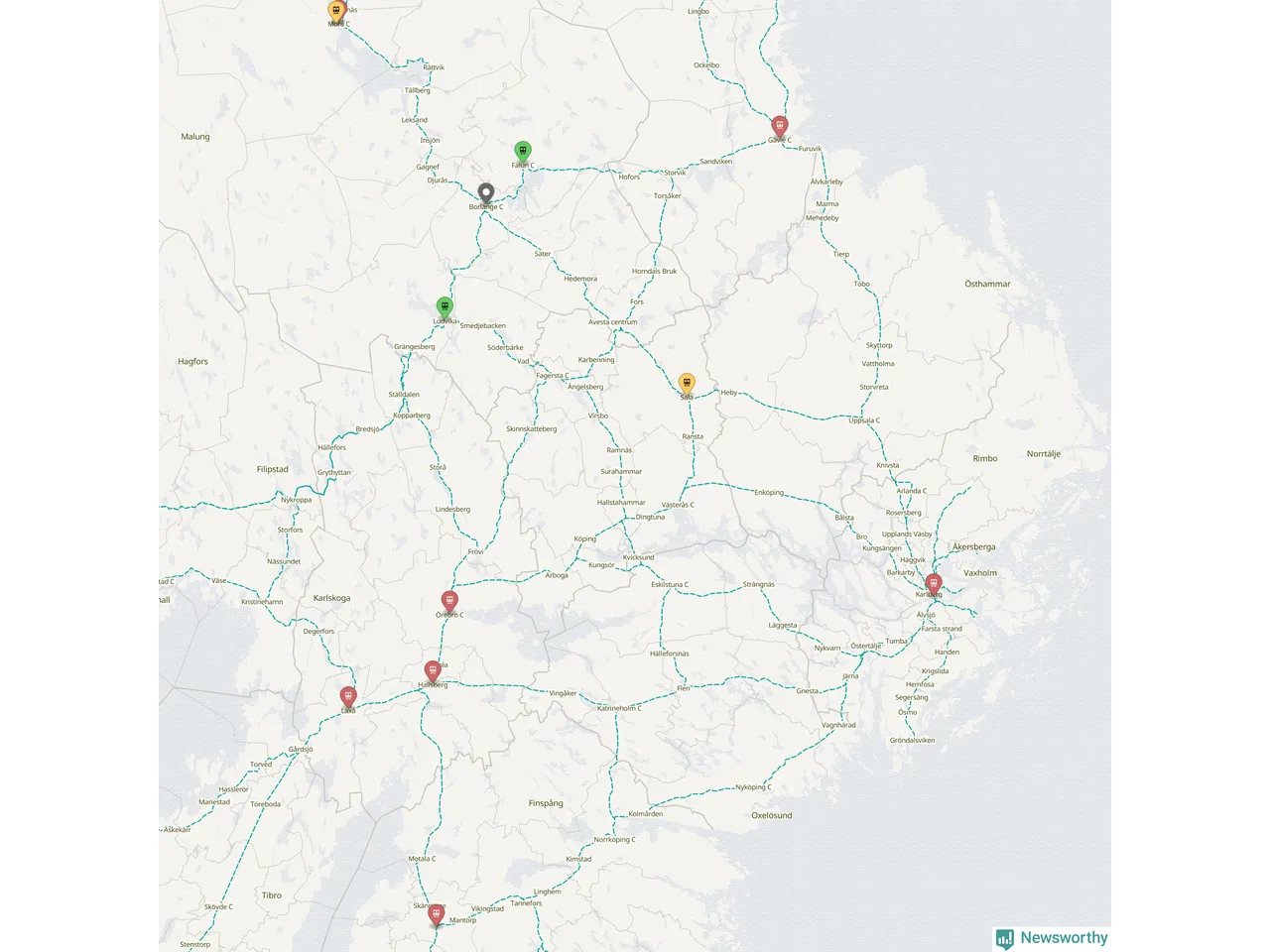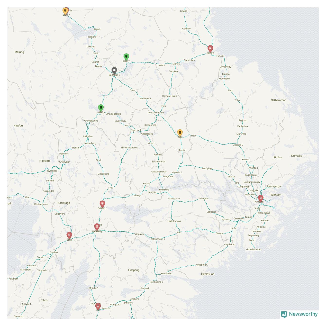 Kartdata från Mapbox, Newsworthy, OpenStreetMap och Trafikverket. Uppgifter om sträckor med passagerartrafik från jarnvag.net.